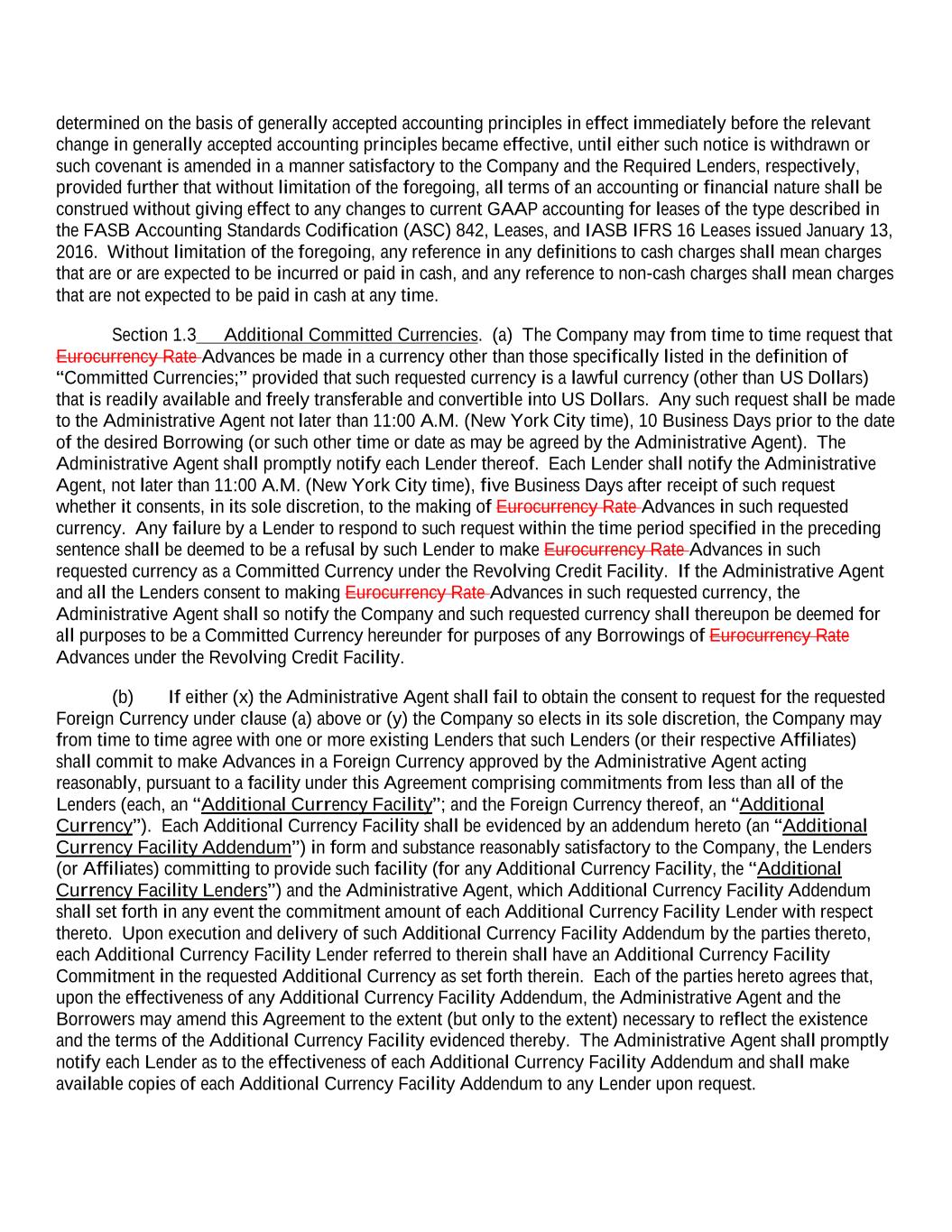 determined on the basis of generally accepted accounting principles in effect immediately before the relevant change in generally accepted accounting principles became effective, until either such notice is withdrawn or such covenant is amended in a manner satisfactory to the Company and the Required Lenders, respectively, provided further that without limitation of the foregoing, all terms of an accounting or financial nature shall be construed without giving effect to any changes to current GAAP accounting for leases of the type described in the FASB Accounting Standards Codification (ASC) 842, Leases, and IASB IFRS 16 Leases issued January 13, 2016. Without limitation of the foregoing, any reference in any definitions to cash charges shall mean charges that are or are expected to be incurred or paid in cash, and any reference to non-cash charges shall mean charges that are not expected to be paid in cash at any time. Section 1.3 Additional Committed Currencies. (a) The Company may from time to time request that Eurocurrency Rate Advances be made in a currency other than those specifically listed in the definition of “Committed Currencies;” provided that such requested currency is a lawful currency (other than US Dollars) that is readily available and freely transferable and convertible into US Dollars. Any such request shall be made to the Administrative Agent not later than 11:00 A.M. (New York City time), 10 Business Days prior to the date of the desired Borrowing (or such other time or date as may be agreed by the Administrative Agent). The Administrative Agent shall promptly notify each Lender thereof. Each Lender shall notify the Administrative Agent, not later than 11:00 A.M. (New York City time), five Business Days after receipt of such request whether it consents, in its sole discretion, to the making of Eurocurrency Rate Advances in such requested currency. Any failure by a Lender to respond to such request within the time period specified in the preceding sentence shall be deemed to be a refusal by such Lender to make Eurocurrency Rate Advances in such requested currency as a Committed Currency under the Revolving Credit Facility. If the Administrative Agent and all the Lenders consent to making Eurocurrency Rate Advances in such requested currency, the Administrative Agent shall so notify the Company and such requested currency shall thereupon be deemed for all purposes to be a Committed Currency hereunder for purposes of any Borrowings of Eurocurrency Rate Advances under the Revolving Credit Facility. (b) If either (x) the Administrative Agent shall fail to obtain the consent to request for the requested Foreign Currency under clause (a) above or (y) the Company so elects in its sole discretion, the Company may from time to time agree with one or more existing Lenders that such Lenders (or their respective Affiliates) shall commit to make Advances in a Foreign Currency approved by the Administrative Agent acting reasonably, pursuant to a facility under this Agreement comprising commitments from less than all of the Lenders (each, an “Additional Currency Facility”; and the Foreign Currency thereof, an “Additional Currency”). Each Additional Currency Facility shall be evidenced by an addendum hereto (an “Additional Currency Facility Addendum”) in form and substance reasonably satisfactory to the Company, the Lenders (or Affiliates) committing to provide such facility (for any Additional Currency Facility, the “Additional Currency Facility Lenders”) and the Administrative Agent, which Additional Currency Facility Addendum shall set forth in any event the commitment amount of each Additional Currency Facility Lender with respect thereto. Upon execution and delivery of such Additional Currency Facility Addendum by the parties thereto, each Additional Currency Facility Lender referred to therein shall have an Additional Currency Facility Commitment in the requested Additional Currency as set forth therein. Each of the parties hereto agrees that, upon the effectiveness of any Additional Currency Facility Addendum, the Administrative Agent and the Borrowers may amend this Agreement to the extent (but only to the extent) necessary to reflect the existence and the terms of the Additional Currency Facility evidenced thereby. The Administrative Agent shall promptly notify each Lender as to the effectiveness of each Additional Currency Facility Addendum and shall make available copies of each Additional Currency Facility Addendum to any Lender upon request.