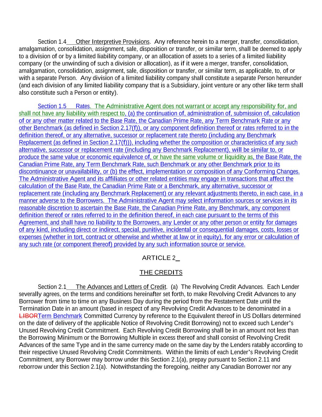 Section 1.4 Other Interpretive Provisions. Any reference herein to a merger, transfer, consolidation, amalgamation, consolidation, assignment, sale, disposition or transfer, or similar term, shall be deemed to apply to a division of or by a limited liability company, or an allocation of assets to a series of a limited liability company (or the unwinding of such a division or allocation), as if it were a merger, transfer, consolidation, amalgamation, consolidation, assignment, sale, disposition or transfer, or similar term, as applicable, to, of or with a separate Person. Any division of a limited liability company shall constitute a separate Person hereunder (and each division of any limited liability company that is a Subsidiary, joint venture or any other like term shall also constitute such a Person or entity). Section 1.5 Rates. The Administrative Agent does not warrant or accept any responsibility for, and shall not have any liability with respect to, (a) the continuation of, administration of, submission of, calculation of or any other matter related to the Base Rate, the Canadian Prime Rate, any Term Benchmark Rate or any other Benchmark (as defined in Section 2.17(f)), or any component definition thereof or rates referred to in the definition thereof, or any alternative, successor or replacement rate thereto (including any Benchmark Replacement (as defined in Section 2.17(f))), including whether the composition or characteristics of any such alternative, successor or replacement rate (including any Benchmark Replacement), will be similar to, or produce the same value or economic equivalence of, or have the same volume or liquidity as, the Base Rate, the Canadian Prime Rate, any Term Benchmark Rate, such Benchmark or any other Benchmark prior to its discontinuance or unavailability, or (b) the effect, implementation or composition of any Conforming Changes. The Administrative Agent and its affiliates or other related entities may engage in transactions that affect the calculation of the Base Rate, the Canadian Prime Rate or a Benchmark, any alternative, successor or replacement rate (including any Benchmark Replacement) or any relevant adjustments thereto, in each case, in a manner adverse to the Borrowers. The Administrative Agent may select information sources or services in its reasonable discretion to ascertain the Base Rate, the Canadian Prime Rate, any Benchmark, any component definition thereof or rates referred to in the definition thereof, in each case pursuant to the terms of this Agreement, and shall have no liability to the Borrowers, any Lender or any other person or entity for damages of any kind, including direct or indirect, special, punitive, incidental or consequential damages, costs, losses or expenses (whether in tort, contract or otherwise and whether at law or in equity), for any error or calculation of any such rate (or component thereof) provided by any such information source or service. ARTICLE 2 THE CREDITS Section 2.1 The Advances and Letters of Credit. (a) The Revolving Credit Advances. Each Lender severally agrees, on the terms and conditions hereinafter set forth, to make Revolving Credit Advances to any Borrower from time to time on any Business Day during the period from the Restatement Date until the Termination Date in an amount (based in respect of any Revolving Credit Advances to be denominated in a LIBORTerm Benchmark Committed Currency by reference to the Equivalent thereof in US Dollars determined on the date of delivery of the applicable Notice of Revolving Credit Borrowing) not to exceed such Lender’s Unused Revolving Credit Commitment. Each Revolving Credit Borrowing shall be in an amount not less than the Borrowing Minimum or the Borrowing Multiple in excess thereof and shall consist of Revolving Credit Advances of the same Type and in the same currency made on the same day by the Lenders ratably according to their respective Unused Revolving Credit Commitments. Within the limits of each Lender’s Revolving Credit Commitment, any Borrower may borrow under this Section 2.1(a), prepay pursuant to Section 2.11 and reborrow under this Section 2.1(a). Notwithstanding the foregoing, neither any Canadian Borrower nor any