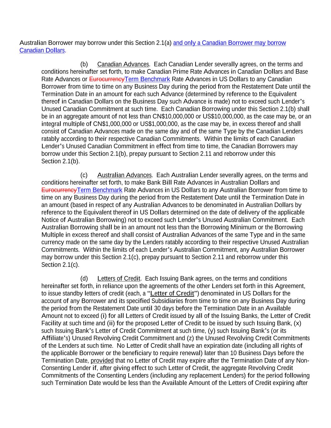 Australian Borrower may borrow under this Section 2.1(a) and only a Canadian Borrower may borrow Canadian Dollars. (b) Canadian Advances. Each Canadian Lender severally agrees, on the terms and conditions hereinafter set forth, to make Canadian Prime Rate Advances in Canadian Dollars and Base Rate Advances or EurocurrencyTerm Benchmark Rate Advances in US Dollars to any Canadian Borrower from time to time on any Business Day during the period from the Restatement Date until the Termination Date in an amount for each such Advance (determined by reference to the Equivalent thereof in Canadian Dollars on the Business Day such Advance is made) not to exceed such Lender’s Unused Canadian Commitment at such time. Each Canadian Borrowing under this Section 2.1(b) shall be in an aggregate amount of not less than CN$10,000,000 or US$10,000,000, as the case may be, or an integral multiple of CN$1,000,000 or US$1,000,000, as the case may be, in excess thereof and shall consist of Canadian Advances made on the same day and of the same Type by the Canadian Lenders ratably according to their respective Canadian Commitments. Within the limits of each Canadian Lender’s Unused Canadian Commitment in effect from time to time, the Canadian Borrowers may borrow under this Section 2.1(b), prepay pursuant to Section 2.11 and reborrow under this Section 2.1(b). (c) Australian Advances. Each Australian Lender severally agrees, on the terms and conditions hereinafter set forth, to make Bank Bill Rate Advances in Australian Dollars and EurocurrencyTerm Benchmark Rate Advances in US Dollars to any Australian Borrower from time to time on any Business Day during the period from the Restatement Date until the Termination Date in an amount (based in respect of any Australian Advances to be denominated in Australian Dollars by reference to the Equivalent thereof in US Dollars determined on the date of delivery of the applicable Notice of Australian Borrowing) not to exceed such Lender’s Unused Australian Commitment. Each Australian Borrowing shall be in an amount not less than the Borrowing Minimum or the Borrowing Multiple in excess thereof and shall consist of Australian Advances of the same Type and in the same currency made on the same day by the Lenders ratably according to their respective Unused Australian Commitments. Within the limits of each Lender’s Australian Commitment, any Australian Borrower may borrow under this Section 2.1(c), prepay pursuant to Section 2.11 and reborrow under this Section 2.1(c). (d) Letters of Credit. Each Issuing Bank agrees, on the terms and conditions hereinafter set forth, in reliance upon the agreements of the other Lenders set forth in this Agreement, to issue standby letters of credit (each, a “Letter of Credit”) denominated in US Dollars for the account of any Borrower and its specified Subsidiaries from time to time on any Business Day during the period from the Restatement Date until 30 days before the Termination Date in an Available Amount not to exceed (i) for all Letters of Credit issued by all of the Issuing Banks, the Letter of Credit Facility at such time and (ii) for the proposed Letter of Credit to be issued by such Issuing Bank, (x) such Issuing Bank’s Letter of Credit Commitment at such time, (y) such Issuing Bank’s (or its Affiliate’s) Unused Revolving Credit Commitment and (z) the Unused Revolving Credit Commitments of the Lenders at such time. No Letter of Credit shall have an expiration date (including all rights of the applicable Borrower or the beneficiary to require renewal) later than 10 Business Days before the Termination Date, provided that no Letter of Credit may expire after the Termination Date of any Non- Consenting Lender if, after giving effect to such Letter of Credit, the aggregate Revolving Credit Commitments of the Consenting Lenders (including any replacement Lenders) for the period following such Termination Date would be less than the Available Amount of the Letters of Credit expiring after