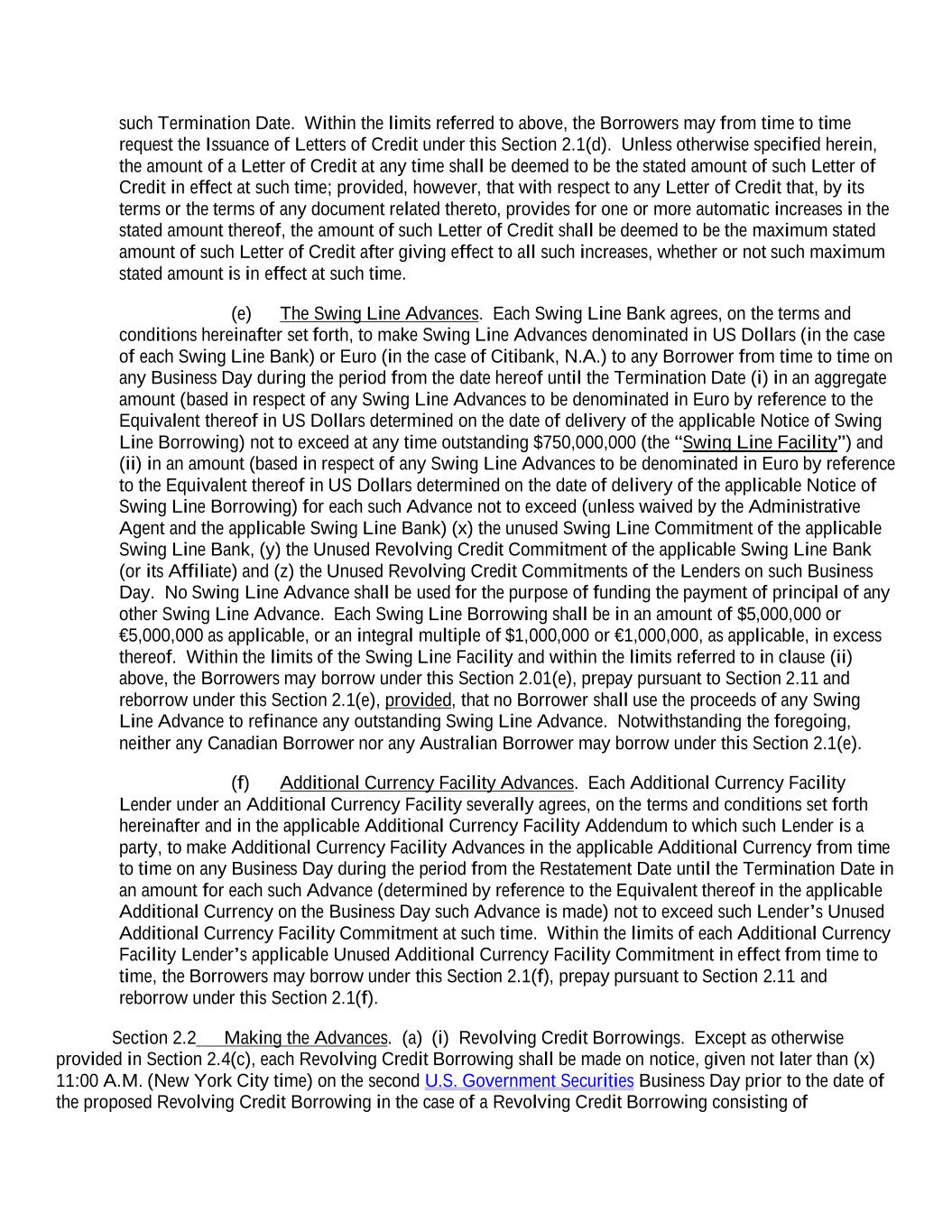 such Termination Date. Within the limits referred to above, the Borrowers may from time to time request the Issuance of Letters of Credit under this Section 2.1(d). Unless otherwise specified herein, the amount of a Letter of Credit at any time shall be deemed to be the stated amount of such Letter of Credit in effect at such time; provided, however, that with respect to any Letter of Credit that, by its terms or the terms of any document related thereto, provides for one or more automatic increases in the stated amount thereof, the amount of such Letter of Credit shall be deemed to be the maximum stated amount of such Letter of Credit after giving effect to all such increases, whether or not such maximum stated amount is in effect at such time. (e) The Swing Line Advances. Each Swing Line Bank agrees, on the terms and conditions hereinafter set forth, to make Swing Line Advances denominated in US Dollars (in the case of each Swing Line Bank) or Euro (in the case of Citibank, N.A.) to any Borrower from time to time on any Business Day during the period from the date hereof until the Termination Date (i) in an aggregate amount (based in respect of any Swing Line Advances to be denominated in Euro by reference to the Equivalent thereof in US Dollars determined on the date of delivery of the applicable Notice of Swing Line Borrowing) not to exceed at any time outstanding $750,000,000 (the “Swing Line Facility”) and (ii) in an amount (based in respect of any Swing Line Advances to be denominated in Euro by reference to the Equivalent thereof in US Dollars determined on the date of delivery of the applicable Notice of Swing Line Borrowing) for each such Advance not to exceed (unless waived by the Administrative Agent and the applicable Swing Line Bank) (x) the unused Swing Line Commitment of the applicable Swing Line Bank, (y) the Unused Revolving Credit Commitment of the applicable Swing Line Bank (or its Affiliate) and (z) the Unused Revolving Credit Commitments of the Lenders on such Business Day. No Swing Line Advance shall be used for the purpose of funding the payment of principal of any other Swing Line Advance. Each Swing Line Borrowing shall be in an amount of $5,000,000 or €5,000,000 as applicable, or an integral multiple of $1,000,000 or €1,000,000, as applicable, in excess thereof. Within the limits of the Swing Line Facility and within the limits referred to in clause (ii) above, the Borrowers may borrow under this Section 2.01(e), prepay pursuant to Section 2.11 and reborrow under this Section 2.1(e), provided, that no Borrower shall use the proceeds of any Swing Line Advance to refinance any outstanding Swing Line Advance. Notwithstanding the foregoing, neither any Canadian Borrower nor any Australian Borrower may borrow under this Section 2.1(e). (f) Additional Currency Facility Advances. Each Additional Currency Facility Lender under an Additional Currency Facility severally agrees, on the terms and conditions set forth hereinafter and in the applicable Additional Currency Facility Addendum to which such Lender is a party, to make Additional Currency Facility Advances in the applicable Additional Currency from time to time on any Business Day during the period from the Restatement Date until the Termination Date in an amount for each such Advance (determined by reference to the Equivalent thereof in the applicable Additional Currency on the Business Day such Advance is made) not to exceed such Lender’s Unused Additional Currency Facility Commitment at such time. Within the limits of each Additional Currency Facility Lender’s applicable Unused Additional Currency Facility Commitment in effect from time to time, the Borrowers may borrow under this Section 2.1(f), prepay pursuant to Section 2.11 and reborrow under this Section 2.1(f). Section 2.2 Making the Advances. (a) (i) Revolving Credit Borrowings. Except as otherwise provided in Section 2.4(c), each Revolving Credit Borrowing shall be made on notice, given not later than (x) 11:00 A.M. (New York City time) on the second U.S. Government Securities Business Day prior to the date of the proposed Revolving Credit Borrowing in the case of a Revolving Credit Borrowing consisting of