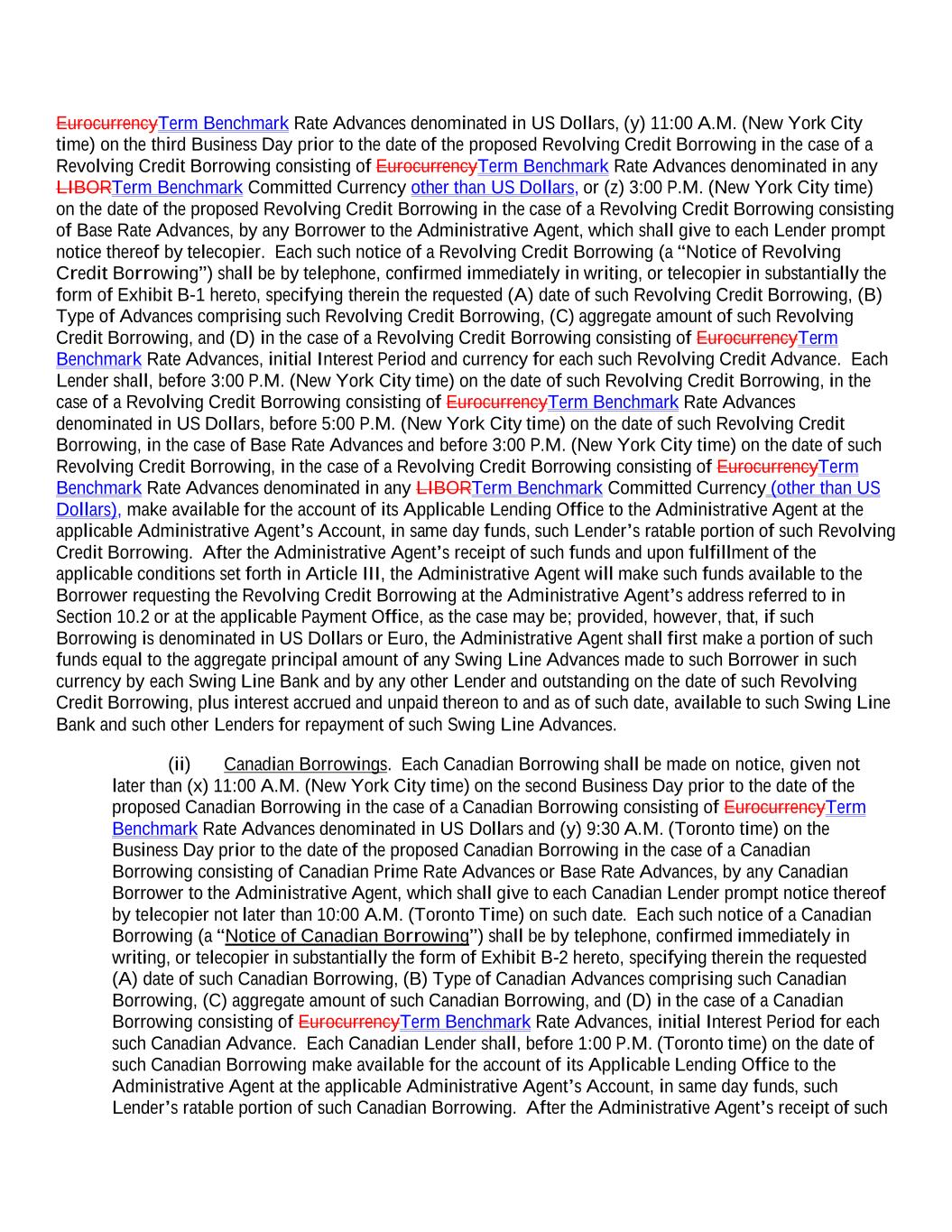 EurocurrencyTerm Benchmark Rate Advances denominated in US Dollars, (y) 11:00 A.M. (New York City time) on the third Business Day prior to the date of the proposed Revolving Credit Borrowing in the case of a Revolving Credit Borrowing consisting of EurocurrencyTerm Benchmark Rate Advances denominated in any LIBORTerm Benchmark Committed Currency other than US Dollars, or (z) 3:00 P.M. (New York City time) on the date of the proposed Revolving Credit Borrowing in the case of a Revolving Credit Borrowing consisting of Base Rate Advances, by any Borrower to the Administrative Agent, which shall give to each Lender prompt notice thereof by telecopier. Each such notice of a Revolving Credit Borrowing (a “Notice of Revolving Credit Borrowing”) shall be by telephone, confirmed immediately in writing, or telecopier in substantially the form of Exhibit B-1 hereto, specifying therein the requested (A) date of such Revolving Credit Borrowing, (B) Type of Advances comprising such Revolving Credit Borrowing, (C) aggregate amount of such Revolving Credit Borrowing, and (D) in the case of a Revolving Credit Borrowing consisting of EurocurrencyTerm Benchmark Rate Advances, initial Interest Period and currency for each such Revolving Credit Advance. Each Lender shall, before 3:00 P.M. (New York City time) on the date of such Revolving Credit Borrowing, in the case of a Revolving Credit Borrowing consisting of EurocurrencyTerm Benchmark Rate Advances denominated in US Dollars, before 5:00 P.M. (New York City time) on the date of such Revolving Credit Borrowing, in the case of Base Rate Advances and before 3:00 P.M. (New York City time) on the date of such Revolving Credit Borrowing, in the case of a Revolving Credit Borrowing consisting of EurocurrencyTerm Benchmark Rate Advances denominated in any LIBORTerm Benchmark Committed Currency (other than US Dollars), make available for the account of its Applicable Lending Office to the Administrative Agent at the applicable Administrative Agent’s Account, in same day funds, such Lender’s ratable portion of such Revolving Credit Borrowing. After the Administrative Agent’s receipt of such funds and upon fulfillment of the applicable conditions set forth in Article III, the Administrative Agent will make such funds available to the Borrower requesting the Revolving Credit Borrowing at the Administrative Agent’s address referred to in Section 10.2 or at the applicable Payment Office, as the case may be; provided, however, that, if such Borrowing is denominated in US Dollars or Euro, the Administrative Agent shall first make a portion of such funds equal to the aggregate principal amount of any Swing Line Advances made to such Borrower in such currency by each Swing Line Bank and by any other Lender and outstanding on the date of such Revolving Credit Borrowing, plus interest accrued and unpaid thereon to and as of such date, available to such Swing Line Bank and such other Lenders for repayment of such Swing Line Advances. (ii) Canadian Borrowings. Each Canadian Borrowing shall be made on notice, given not later than (x) 11:00 A.M. (New York City time) on the second Business Day prior to the date of the proposed Canadian Borrowing in the case of a Canadian Borrowing consisting of EurocurrencyTerm Benchmark Rate Advances denominated in US Dollars and (y) 9:30 A.M. (Toronto time) on the Business Day prior to the date of the proposed Canadian Borrowing in the case of a Canadian Borrowing consisting of Canadian Prime Rate Advances or Base Rate Advances, by any Canadian Borrower to the Administrative Agent, which shall give to each Canadian Lender prompt notice thereof by telecopier not later than 10:00 A.M. (Toronto Time) on such date. Each such notice of a Canadian Borrowing (a “Notice of Canadian Borrowing”) shall be by telephone, confirmed immediately in writing, or telecopier in substantially the form of Exhibit B-2 hereto, specifying therein the requested (A) date of such Canadian Borrowing, (B) Type of Canadian Advances comprising such Canadian Borrowing, (C) aggregate amount of such Canadian Borrowing, and (D) in the case of a Canadian Borrowing consisting of EurocurrencyTerm Benchmark Rate Advances, initial Interest Period for each such Canadian Advance. Each Canadian Lender shall, before 1:00 P.M. (Toronto time) on the date of such Canadian Borrowing make available for the account of its Applicable Lending Office to the Administrative Agent at the applicable Administrative Agent’s Account, in same day funds, such Lender’s ratable portion of such Canadian Borrowing. After the Administrative Agent’s receipt of such