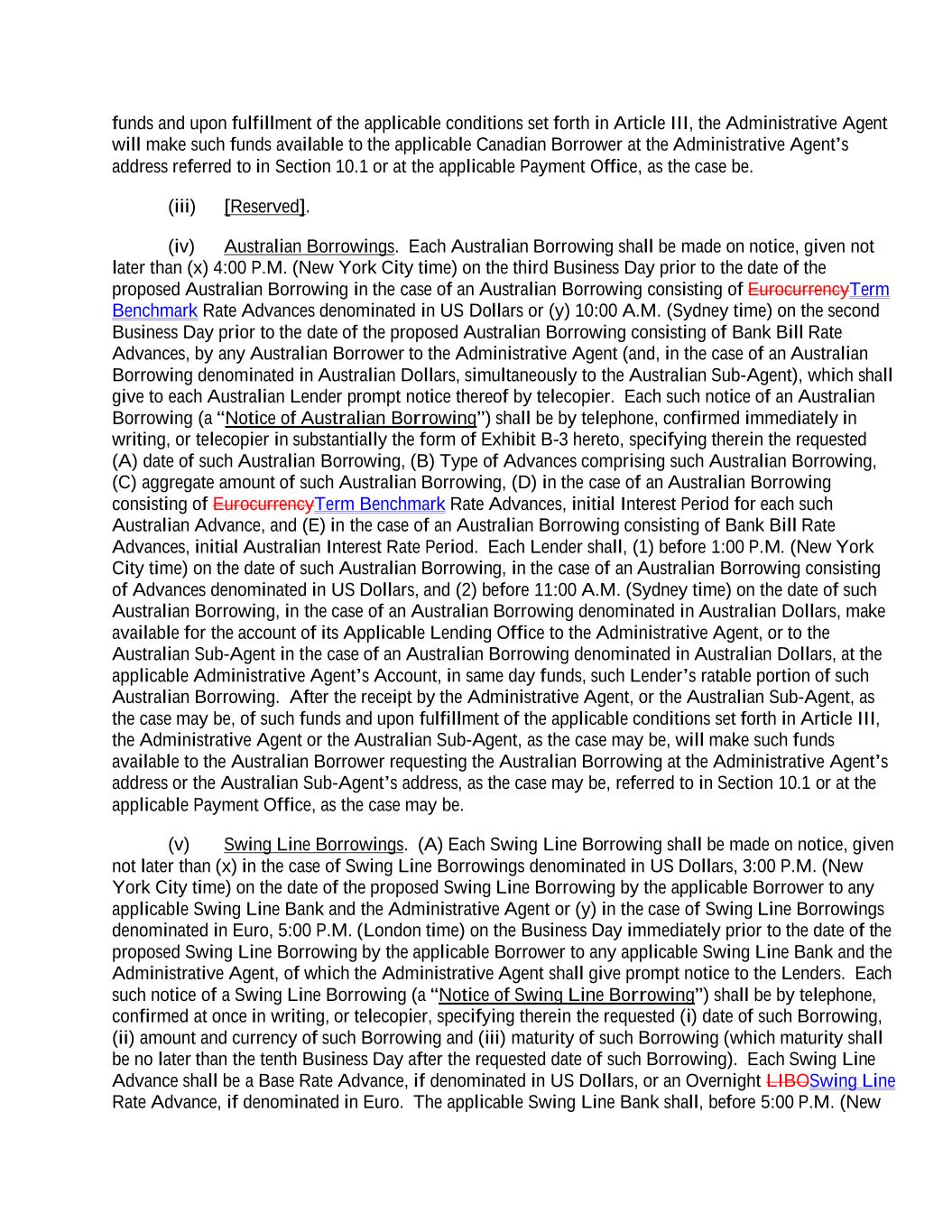 funds and upon fulfillment of the applicable conditions set forth in Article III, the Administrative Agent will make such funds available to the applicable Canadian Borrower at the Administrative Agent’s address referred to in Section 10.1 or at the applicable Payment Office, as the case be. (iii) [Reserved]. (iv) Australian Borrowings. Each Australian Borrowing shall be made on notice, given not later than (x) 4:00 P.M. (New York City time) on the third Business Day prior to the date of the proposed Australian Borrowing in the case of an Australian Borrowing consisting of EurocurrencyTerm Benchmark Rate Advances denominated in US Dollars or (y) 10:00 A.M. (Sydney time) on the second Business Day prior to the date of the proposed Australian Borrowing consisting of Bank Bill Rate Advances, by any Australian Borrower to the Administrative Agent (and, in the case of an Australian Borrowing denominated in Australian Dollars, simultaneously to the Australian Sub-Agent), which shall give to each Australian Lender prompt notice thereof by telecopier. Each such notice of an Australian Borrowing (a “Notice of Australian Borrowing”) shall be by telephone, confirmed immediately in writing, or telecopier in substantially the form of Exhibit B-3 hereto, specifying therein the requested (A) date of such Australian Borrowing, (B) Type of Advances comprising such Australian Borrowing, (C) aggregate amount of such Australian Borrowing, (D) in the case of an Australian Borrowing consisting of EurocurrencyTerm Benchmark Rate Advances, initial Interest Period for each such Australian Advance, and (E) in the case of an Australian Borrowing consisting of Bank Bill Rate Advances, initial Australian Interest Rate Period. Each Lender shall, (1) before 1:00 P.M. (New York City time) on the date of such Australian Borrowing, in the case of an Australian Borrowing consisting of Advances denominated in US Dollars, and (2) before 11:00 A.M. (Sydney time) on the date of such Australian Borrowing, in the case of an Australian Borrowing denominated in Australian Dollars, make available for the account of its Applicable Lending Office to the Administrative Agent, or to the Australian Sub-Agent in the case of an Australian Borrowing denominated in Australian Dollars, at the applicable Administrative Agent’s Account, in same day funds, such Lender’s ratable portion of such Australian Borrowing. After the receipt by the Administrative Agent, or the Australian Sub-Agent, as the case may be, of such funds and upon fulfillment of the applicable conditions set forth in Article III, the Administrative Agent or the Australian Sub-Agent, as the case may be, will make such funds available to the Australian Borrower requesting the Australian Borrowing at the Administrative Agent’s address or the Australian Sub-Agent’s address, as the case may be, referred to in Section 10.1 or at the applicable Payment Office, as the case may be. (v) Swing Line Borrowings. (A) Each Swing Line Borrowing shall be made on notice, given not later than (x) in the case of Swing Line Borrowings denominated in US Dollars, 3:00 P.M. (New York City time) on the date of the proposed Swing Line Borrowing by the applicable Borrower to any applicable Swing Line Bank and the Administrative Agent or (y) in the case of Swing Line Borrowings denominated in Euro, 5:00 P.M. (London time) on the Business Day immediately prior to the date of the proposed Swing Line Borrowing by the applicable Borrower to any applicable Swing Line Bank and the Administrative Agent, of which the Administrative Agent shall give prompt notice to the Lenders. Each such notice of a Swing Line Borrowing (a “Notice of Swing Line Borrowing”) shall be by telephone, confirmed at once in writing, or telecopier, specifying therein the requested (i) date of such Borrowing, (ii) amount and currency of such Borrowing and (iii) maturity of such Borrowing (which maturity shall be no later than the tenth Business Day after the requested date of such Borrowing). Each Swing Line Advance shall be a Base Rate Advance, if denominated in US Dollars, or an Overnight LIBOSwing Line Rate Advance, if denominated in Euro. The applicable Swing Line Bank shall, before 5:00 P.M. (New