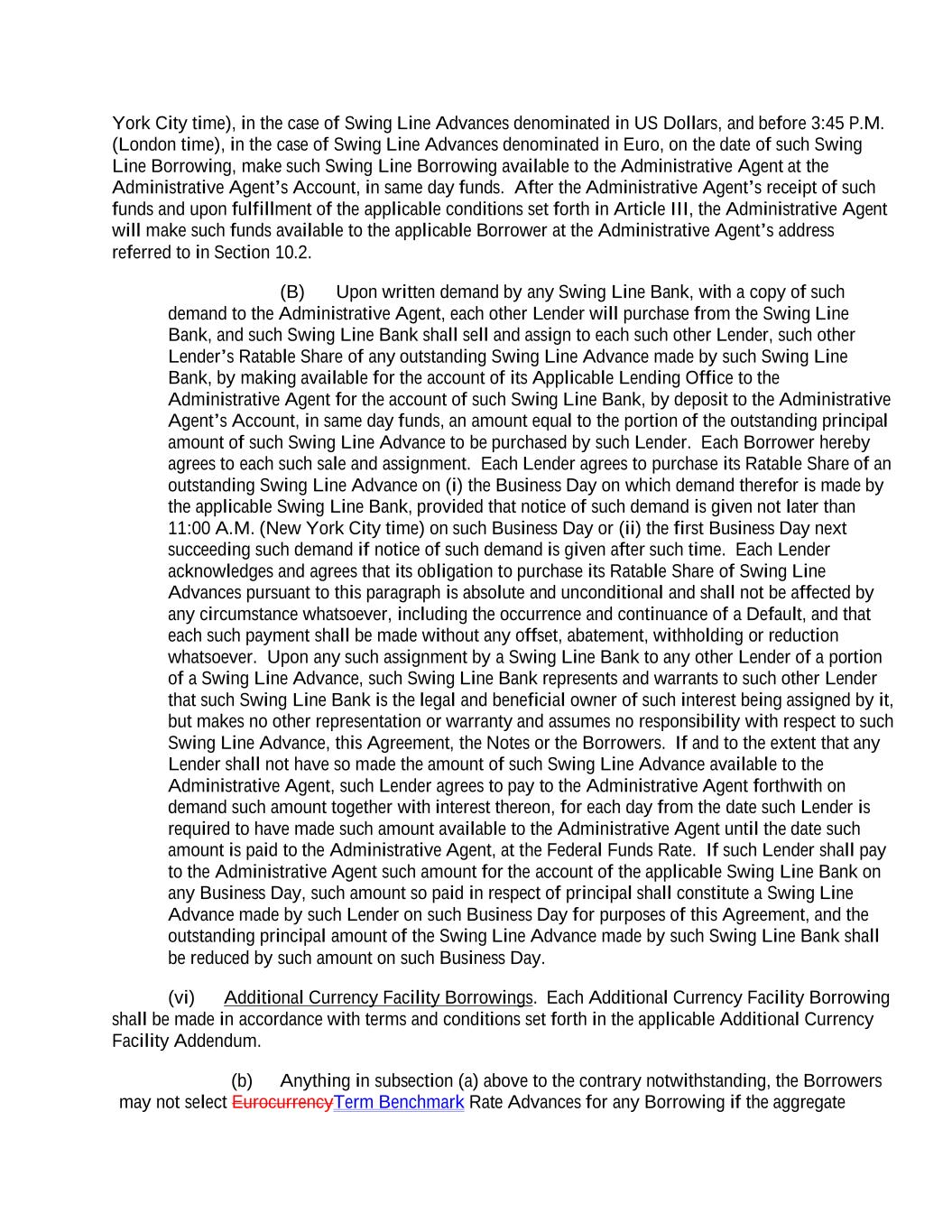 York City time), in the case of Swing Line Advances denominated in US Dollars, and before 3:45 P.M. (London time), in the case of Swing Line Advances denominated in Euro, on the date of such Swing Line Borrowing, make such Swing Line Borrowing available to the Administrative Agent at the Administrative Agent’s Account, in same day funds. After the Administrative Agent’s receipt of such funds and upon fulfillment of the applicable conditions set forth in Article III, the Administrative Agent will make such funds available to the applicable Borrower at the Administrative Agent’s address referred to in Section 10.2. (B) Upon written demand by any Swing Line Bank, with a copy of such demand to the Administrative Agent, each other Lender will purchase from the Swing Line Bank, and such Swing Line Bank shall sell and assign to each such other Lender, such other Lender’s Ratable Share of any outstanding Swing Line Advance made by such Swing Line Bank, by making available for the account of its Applicable Lending Office to the Administrative Agent for the account of such Swing Line Bank, by deposit to the Administrative Agent’s Account, in same day funds, an amount equal to the portion of the outstanding principal amount of such Swing Line Advance to be purchased by such Lender. Each Borrower hereby agrees to each such sale and assignment. Each Lender agrees to purchase its Ratable Share of an outstanding Swing Line Advance on (i) the Business Day on which demand therefor is made by the applicable Swing Line Bank, provided that notice of such demand is given not later than 11:00 A.M. (New York City time) on such Business Day or (ii) the first Business Day next succeeding such demand if notice of such demand is given after such time. Each Lender acknowledges and agrees that its obligation to purchase its Ratable Share of Swing Line Advances pursuant to this paragraph is absolute and unconditional and shall not be affected by any circumstance whatsoever, including the occurrence and continuance of a Default, and that each such payment shall be made without any offset, abatement, withholding or reduction whatsoever. Upon any such assignment by a Swing Line Bank to any other Lender of a portion of a Swing Line Advance, such Swing Line Bank represents and warrants to such other Lender that such Swing Line Bank is the legal and beneficial owner of such interest being assigned by it, but makes no other representation or warranty and assumes no responsibility with respect to such Swing Line Advance, this Agreement, the Notes or the Borrowers. If and to the extent that any Lender shall not have so made the amount of such Swing Line Advance available to the Administrative Agent, such Lender agrees to pay to the Administrative Agent forthwith on demand such amount together with interest thereon, for each day from the date such Lender is required to have made such amount available to the Administrative Agent until the date such amount is paid to the Administrative Agent, at the Federal Funds Rate. If such Lender shall pay to the Administrative Agent such amount for the account of the applicable Swing Line Bank on any Business Day, such amount so paid in respect of principal shall constitute a Swing Line Advance made by such Lender on such Business Day for purposes of this Agreement, and the outstanding principal amount of the Swing Line Advance made by such Swing Line Bank shall be reduced by such amount on such Business Day. (vi) Additional Currency Facility Borrowings. Each Additional Currency Facility Borrowing shall be made in accordance with terms and conditions set forth in the applicable Additional Currency Facility Addendum. (b) Anything in subsection (a) above to the contrary notwithstanding, the Borrowers may not select EurocurrencyTerm Benchmark Rate Advances for any Borrowing if the aggregate