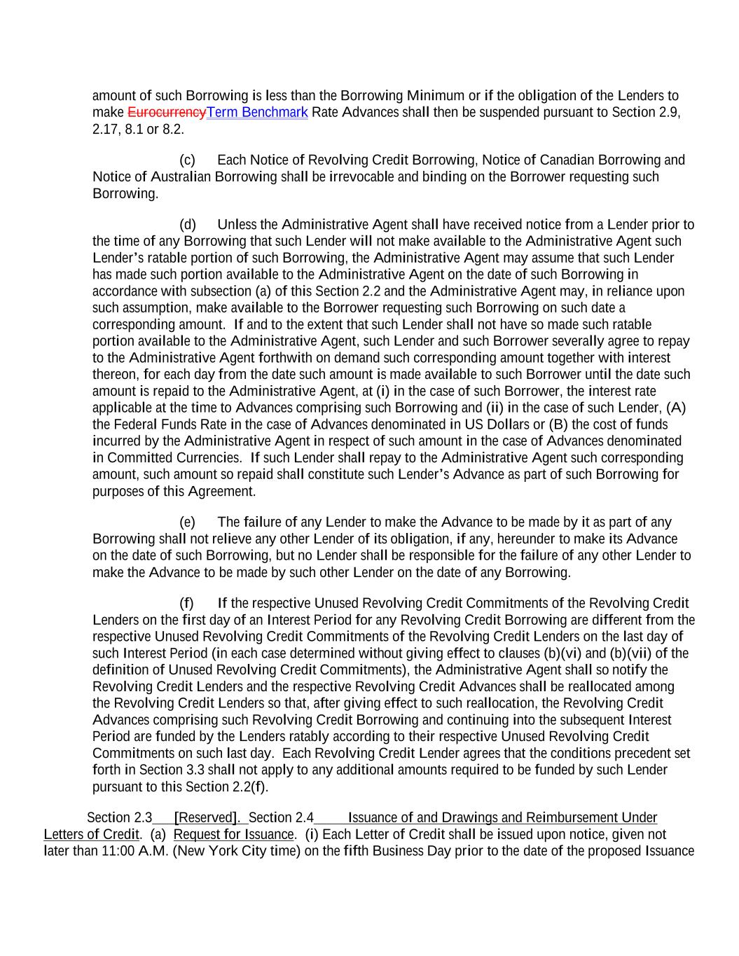 amount of such Borrowing is less than the Borrowing Minimum or if the obligation of the Lenders to make EurocurrencyTerm Benchmark Rate Advances shall then be suspended pursuant to Section 2.9, 2.17, 8.1 or 8.2. (c) Each Notice of Revolving Credit Borrowing, Notice of Canadian Borrowing and Notice of Australian Borrowing shall be irrevocable and binding on the Borrower requesting such Borrowing. (d) Unless the Administrative Agent shall have received notice from a Lender prior to the time of any Borrowing that such Lender will not make available to the Administrative Agent such Lender’s ratable portion of such Borrowing, the Administrative Agent may assume that such Lender has made such portion available to the Administrative Agent on the date of such Borrowing in accordance with subsection (a) of this Section 2.2 and the Administrative Agent may, in reliance upon such assumption, make available to the Borrower requesting such Borrowing on such date a corresponding amount. If and to the extent that such Lender shall not have so made such ratable portion available to the Administrative Agent, such Lender and such Borrower severally agree to repay to the Administrative Agent forthwith on demand such corresponding amount together with interest thereon, for each day from the date such amount is made available to such Borrower until the date such amount is repaid to the Administrative Agent, at (i) in the case of such Borrower, the interest rate applicable at the time to Advances comprising such Borrowing and (ii) in the case of such Lender, (A) the Federal Funds Rate in the case of Advances denominated in US Dollars or (B) the cost of funds incurred by the Administrative Agent in respect of such amount in the case of Advances denominated in Committed Currencies. If such Lender shall repay to the Administrative Agent such corresponding amount, such amount so repaid shall constitute such Lender’s Advance as part of such Borrowing for purposes of this Agreement. (e) The failure of any Lender to make the Advance to be made by it as part of any Borrowing shall not relieve any other Lender of its obligation, if any, hereunder to make its Advance on the date of such Borrowing, but no Lender shall be responsible for the failure of any other Lender to make the Advance to be made by such other Lender on the date of any Borrowing. (f) If the respective Unused Revolving Credit Commitments of the Revolving Credit Lenders on the first day of an Interest Period for any Revolving Credit Borrowing are different from the respective Unused Revolving Credit Commitments of the Revolving Credit Lenders on the last day of such Interest Period (in each case determined without giving effect to clauses (b)(vi) and (b)(vii) of the definition of Unused Revolving Credit Commitments), the Administrative Agent shall so notify the Revolving Credit Lenders and the respective Revolving Credit Advances shall be reallocated among the Revolving Credit Lenders so that, after giving effect to such reallocation, the Revolving Credit Advances comprising such Revolving Credit Borrowing and continuing into the subsequent Interest Period are funded by the Lenders ratably according to their respective Unused Revolving Credit Commitments on such last day. Each Revolving Credit Lender agrees that the conditions precedent set forth in Section 3.3 shall not apply to any additional amounts required to be funded by such Lender pursuant to this Section 2.2(f). Section 2.3 [Reserved]. Section 2.4 Issuance of and Drawings and Reimbursement Under Letters of Credit. (a) Request for Issuance. (i) Each Letter of Credit shall be issued upon notice, given not later than 11:00 A.M. (New York City time) on the fifth Business Day prior to the date of the proposed Issuance