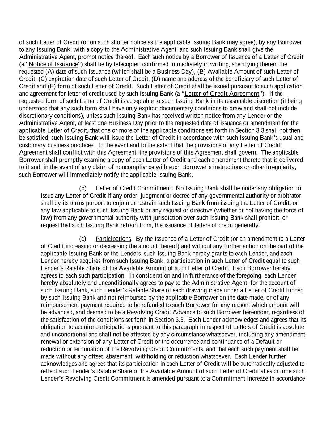 of such Letter of Credit (or on such shorter notice as the applicable Issuing Bank may agree), by any Borrower to any Issuing Bank, with a copy to the Administrative Agent, and such Issuing Bank shall give the Administrative Agent, prompt notice thereof. Each such notice by a Borrower of Issuance of a Letter of Credit (a “Notice of Issuance”) shall be by telecopier, confirmed immediately in writing, specifying therein the requested (A) date of such Issuance (which shall be a Business Day), (B) Available Amount of such Letter of Credit, (C) expiration date of such Letter of Credit, (D) name and address of the beneficiary of such Letter of Credit and (E) form of such Letter of Credit. Such Letter of Credit shall be issued pursuant to such application and agreement for letter of credit used by such Issuing Bank (a “Letter of Credit Agreement”). If the requested form of such Letter of Credit is acceptable to such Issuing Bank in its reasonable discretion (it being understood that any such form shall have only explicit documentary conditions to draw and shall not include discretionary conditions), unless such Issuing Bank has received written notice from any Lender or the Administrative Agent, at least one Business Day prior to the requested date of issuance or amendment for the applicable Letter of Credit, that one or more of the applicable conditions set forth in Section 3.3 shall not then be satisfied, such Issuing Bank will issue the Letter of Credit in accordance with such Issuing Bank’s usual and customary business practices. In the event and to the extent that the provisions of any Letter of Credit Agreement shall conflict with this Agreement, the provisions of this Agreement shall govern. The applicable Borrower shall promptly examine a copy of each Letter of Credit and each amendment thereto that is delivered to it and, in the event of any claim of noncompliance with such Borrower’s instructions or other irregularity, such Borrower will immediately notify the applicable Issuing Bank. (b) Letter of Credit Commitment. No Issuing Bank shall be under any obligation to issue any Letter of Credit if any order, judgment or decree of any governmental authority or arbitrator shall by its terms purport to enjoin or restrain such Issuing Bank from issuing the Letter of Credit, or any law applicable to such Issuing Bank or any request or directive (whether or not having the force of law) from any governmental authority with jurisdiction over such Issuing Bank shall prohibit, or request that such Issuing Bank refrain from, the issuance of letters of credit generally. (c) Participations. By the Issuance of a Letter of Credit (or an amendment to a Letter of Credit increasing or decreasing the amount thereof) and without any further action on the part of the applicable Issuing Bank or the Lenders, such Issuing Bank hereby grants to each Lender, and each Lender hereby acquires from such Issuing Bank, a participation in such Letter of Credit equal to such Lender’s Ratable Share of the Available Amount of such Letter of Credit. Each Borrower hereby agrees to each such participation. In consideration and in furtherance of the foregoing, each Lender hereby absolutely and unconditionally agrees to pay to the Administrative Agent, for the account of such Issuing Bank, such Lender’s Ratable Share of each drawing made under a Letter of Credit funded by such Issuing Bank and not reimbursed by the applicable Borrower on the date made, or of any reimbursement payment required to be refunded to such Borrower for any reason, which amount will be advanced, and deemed to be a Revolving Credit Advance to such Borrower hereunder, regardless of the satisfaction of the conditions set forth in Section 3.3. Each Lender acknowledges and agrees that its obligation to acquire participations pursuant to this paragraph in respect of Letters of Credit is absolute and unconditional and shall not be affected by any circumstance whatsoever, including any amendment, renewal or extension of any Letter of Credit or the occurrence and continuance of a Default or reduction or termination of the Revolving Credit Commitments, and that each such payment shall be made without any offset, abatement, withholding or reduction whatsoever. Each Lender further acknowledges and agrees that its participation in each Letter of Credit will be automatically adjusted to reflect such Lender’s Ratable Share of the Available Amount of such Letter of Credit at each time such Lender’s Revolving Credit Commitment is amended pursuant to a Commitment Increase in accordance