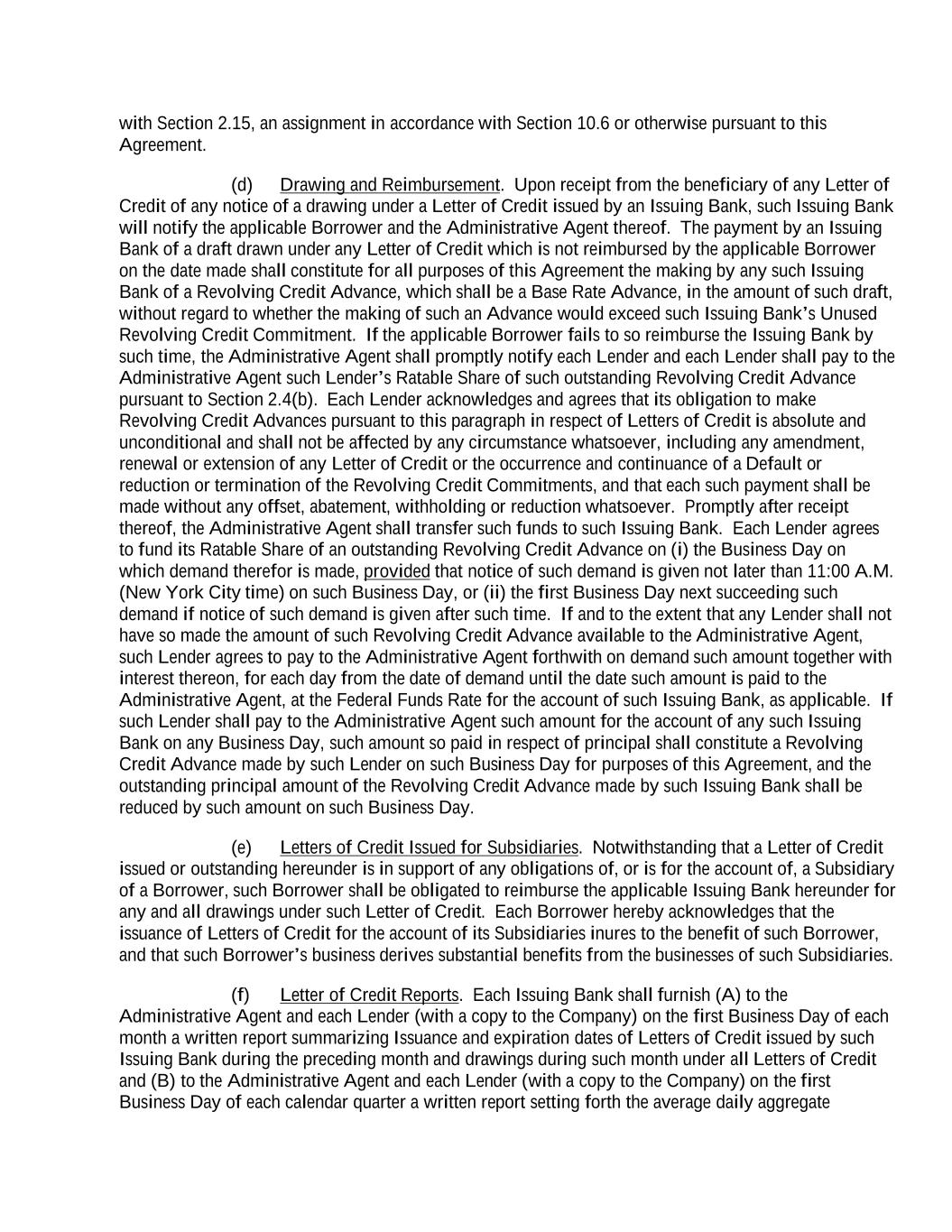 with Section 2.15, an assignment in accordance with Section 10.6 or otherwise pursuant to this Agreement. (d) Drawing and Reimbursement. Upon receipt from the beneficiary of any Letter of Credit of any notice of a drawing under a Letter of Credit issued by an Issuing Bank, such Issuing Bank will notify the applicable Borrower and the Administrative Agent thereof. The payment by an Issuing Bank of a draft drawn under any Letter of Credit which is not reimbursed by the applicable Borrower on the date made shall constitute for all purposes of this Agreement the making by any such Issuing Bank of a Revolving Credit Advance, which shall be a Base Rate Advance, in the amount of such draft, without regard to whether the making of such an Advance would exceed such Issuing Bank’s Unused Revolving Credit Commitment. If the applicable Borrower fails to so reimburse the Issuing Bank by such time, the Administrative Agent shall promptly notify each Lender and each Lender shall pay to the Administrative Agent such Lender’s Ratable Share of such outstanding Revolving Credit Advance pursuant to Section 2.4(b). Each Lender acknowledges and agrees that its obligation to make Revolving Credit Advances pursuant to this paragraph in respect of Letters of Credit is absolute and unconditional and shall not be affected by any circumstance whatsoever, including any amendment, renewal or extension of any Letter of Credit or the occurrence and continuance of a Default or reduction or termination of the Revolving Credit Commitments, and that each such payment shall be made without any offset, abatement, withholding or reduction whatsoever. Promptly after receipt thereof, the Administrative Agent shall transfer such funds to such Issuing Bank. Each Lender agrees to fund its Ratable Share of an outstanding Revolving Credit Advance on (i) the Business Day on which demand therefor is made, provided that notice of such demand is given not later than 11:00 A.M. (New York City time) on such Business Day, or (ii) the first Business Day next succeeding such demand if notice of such demand is given after such time. If and to the extent that any Lender shall not have so made the amount of such Revolving Credit Advance available to the Administrative Agent, such Lender agrees to pay to the Administrative Agent forthwith on demand such amount together with interest thereon, for each day from the date of demand until the date such amount is paid to the Administrative Agent, at the Federal Funds Rate for the account of such Issuing Bank, as applicable. If such Lender shall pay to the Administrative Agent such amount for the account of any such Issuing Bank on any Business Day, such amount so paid in respect of principal shall constitute a Revolving Credit Advance made by such Lender on such Business Day for purposes of this Agreement, and the outstanding principal amount of the Revolving Credit Advance made by such Issuing Bank shall be reduced by such amount on such Business Day. (e) Letters of Credit Issued for Subsidiaries. Notwithstanding that a Letter of Credit issued or outstanding hereunder is in support of any obligations of, or is for the account of, a Subsidiary of a Borrower, such Borrower shall be obligated to reimburse the applicable Issuing Bank hereunder for any and all drawings under such Letter of Credit. Each Borrower hereby acknowledges that the issuance of Letters of Credit for the account of its Subsidiaries inures to the benefit of such Borrower, and that such Borrower’s business derives substantial benefits from the businesses of such Subsidiaries. (f) Letter of Credit Reports. Each Issuing Bank shall furnish (A) to the Administrative Agent and each Lender (with a copy to the Company) on the first Business Day of each month a written report summarizing Issuance and expiration dates of Letters of Credit issued by such Issuing Bank during the preceding month and drawings during such month under all Letters of Credit and (B) to the Administrative Agent and each Lender (with a copy to the Company) on the first Business Day of each calendar quarter a written report setting forth the average daily aggregate