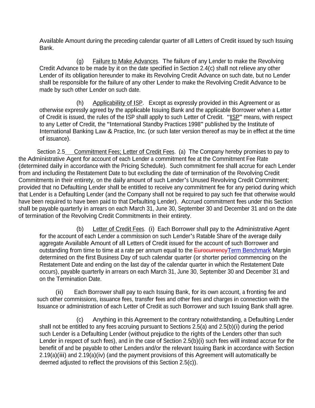 Available Amount during the preceding calendar quarter of all Letters of Credit issued by such Issuing Bank. (g) Failure to Make Advances. The failure of any Lender to make the Revolving Credit Advance to be made by it on the date specified in Section 2.4(c) shall not relieve any other Lender of its obligation hereunder to make its Revolving Credit Advance on such date, but no Lender shall be responsible for the failure of any other Lender to make the Revolving Credit Advance to be made by such other Lender on such date. (h) Applicability of ISP. Except as expressly provided in this Agreement or as otherwise expressly agreed by the applicable Issuing Bank and the applicable Borrower when a Letter of Credit is issued, the rules of the ISP shall apply to such Letter of Credit. “ISP” means, with respect to any Letter of Credit, the “International Standby Practices 1998” published by the Institute of International Banking Law & Practice, Inc. (or such later version thereof as may be in effect at the time of issuance). Section 2.5 Commitment Fees; Letter of Credit Fees. (a) The Company hereby promises to pay to the Administrative Agent for account of each Lender a commitment fee at the Commitment Fee Rate (determined daily in accordance with the Pricing Schedule). Such commitment fee shall accrue for each Lender from and including the Restatement Date to but excluding the date of termination of the Revolving Credit Commitments in their entirety, on the daily amount of such Lender’s Unused Revolving Credit Commitment; provided that no Defaulting Lender shall be entitled to receive any commitment fee for any period during which that Lender is a Defaulting Lender (and the Company shall not be required to pay such fee that otherwise would have been required to have been paid to that Defaulting Lender). Accrued commitment fees under this Section shall be payable quarterly in arrears on each March 31, June 30, September 30 and December 31 and on the date of termination of the Revolving Credit Commitments in their entirety. (b) Letter of Credit Fees. (i) Each Borrower shall pay to the Administrative Agent for the account of each Lender a commission on such Lender’s Ratable Share of the average daily aggregate Available Amount of all Letters of Credit issued for the account of such Borrower and outstanding from time to time at a rate per annum equal to the EurocurrencyTerm Benchmark Margin determined on the first Business Day of such calendar quarter (or shorter period commencing on the Restatement Date and ending on the last day of the calendar quarter in which the Restatement Date occurs), payable quarterly in arrears on each March 31, June 30, September 30 and December 31 and on the Termination Date. (ii) Each Borrower shall pay to each Issuing Bank, for its own account, a fronting fee and such other commissions, issuance fees, transfer fees and other fees and charges in connection with the Issuance or administration of each Letter of Credit as such Borrower and such Issuing Bank shall agree. (c) Anything in this Agreement to the contrary notwithstanding, a Defaulting Lender shall not be entitled to any fees accruing pursuant to Sections 2.5(a) and 2.5(b)(i) during the period such Lender is a Defaulting Lender (without prejudice to the rights of the Lenders other than such Lender in respect of such fees), and in the case of Section 2.5(b)(i) such fees will instead accrue for the benefit of and be payable to other Lenders and/or the relevant Issuing Bank in accordance with Section 2.19(a)(iii) and 2.19(a)(iv) (and the payment provisions of this Agreement will automatically be deemed adjusted to reflect the provisions of this Section 2.5(c)).