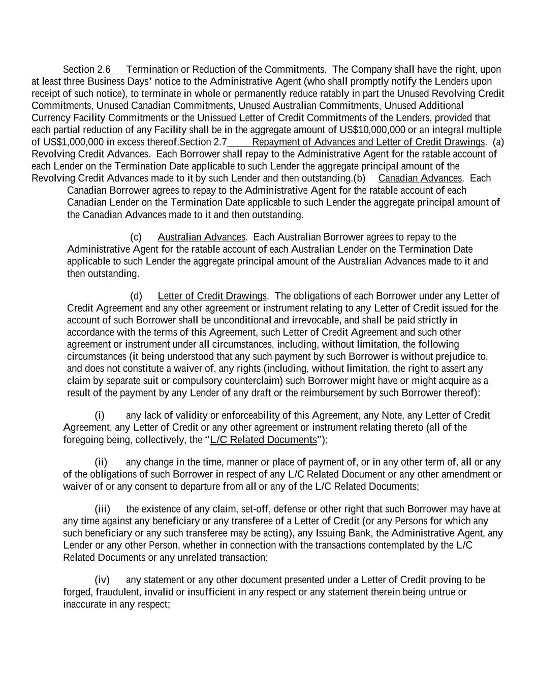 Section 2.6 Termination or Reduction of the Commitments. The Company shall have the right, upon at least three Business Days’ notice to the Administrative Agent (who shall promptly notify the Lenders upon receipt of such notice), to terminate in whole or permanently reduce ratably in part the Unused Revolving Credit Commitments, Unused Canadian Commitments, Unused Australian Commitments, Unused Additional Currency Facility Commitments or the Unissued Letter of Credit Commitments of the Lenders, provided that each partial reduction of any Facility shall be in the aggregate amount of US$10,000,000 or an integral multiple of US$1,000,000 in excess thereof.Section 2.7 Repayment of Advances and Letter of Credit Drawings. (a) Revolving Credit Advances. Each Borrower shall repay to the Administrative Agent for the ratable account of each Lender on the Termination Date applicable to such Lender the aggregate principal amount of the Revolving Credit Advances made to it by such Lender and then outstanding.(b) Canadian Advances. Each Canadian Borrower agrees to repay to the Administrative Agent for the ratable account of each Canadian Lender on the Termination Date applicable to such Lender the aggregate principal amount of the Canadian Advances made to it and then outstanding. (c) Australian Advances. Each Australian Borrower agrees to repay to the Administrative Agent for the ratable account of each Australian Lender on the Termination Date applicable to such Lender the aggregate principal amount of the Australian Advances made to it and then outstanding. (d) Letter of Credit Drawings. The obligations of each Borrower under any Letter of Credit Agreement and any other agreement or instrument relating to any Letter of Credit issued for the account of such Borrower shall be unconditional and irrevocable, and shall be paid strictly in accordance with the terms of this Agreement, such Letter of Credit Agreement and such other agreement or instrument under all circumstances, including, without limitation, the following circumstances (it being understood that any such payment by such Borrower is without prejudice to, and does not constitute a waiver of, any rights (including, without limitation, the right to assert any claim by separate suit or compulsory counterclaim) such Borrower might have or might acquire as a result of the payment by any Lender of any draft or the reimbursement by such Borrower thereof): (i) any lack of validity or enforceability of this Agreement, any Note, any Letter of Credit Agreement, any Letter of Credit or any other agreement or instrument relating thereto (all of the foregoing being, collectively, the “L/C Related Documents”); (ii) any change in the time, manner or place of payment of, or in any other term of, all or any of the obligations of such Borrower in respect of any L/C Related Document or any other amendment or waiver of or any consent to departure from all or any of the L/C Related Documents; (iii) the existence of any claim, set-off, defense or other right that such Borrower may have at any time against any beneficiary or any transferee of a Letter of Credit (or any Persons for which any such beneficiary or any such transferee may be acting), any Issuing Bank, the Administrative Agent, any Lender or any other Person, whether in connection with the transactions contemplated by the L/C Related Documents or any unrelated transaction; (iv) any statement or any other document presented under a Letter of Credit proving to be forged, fraudulent, invalid or insufficient in any respect or any statement therein being untrue or inaccurate in any respect;
