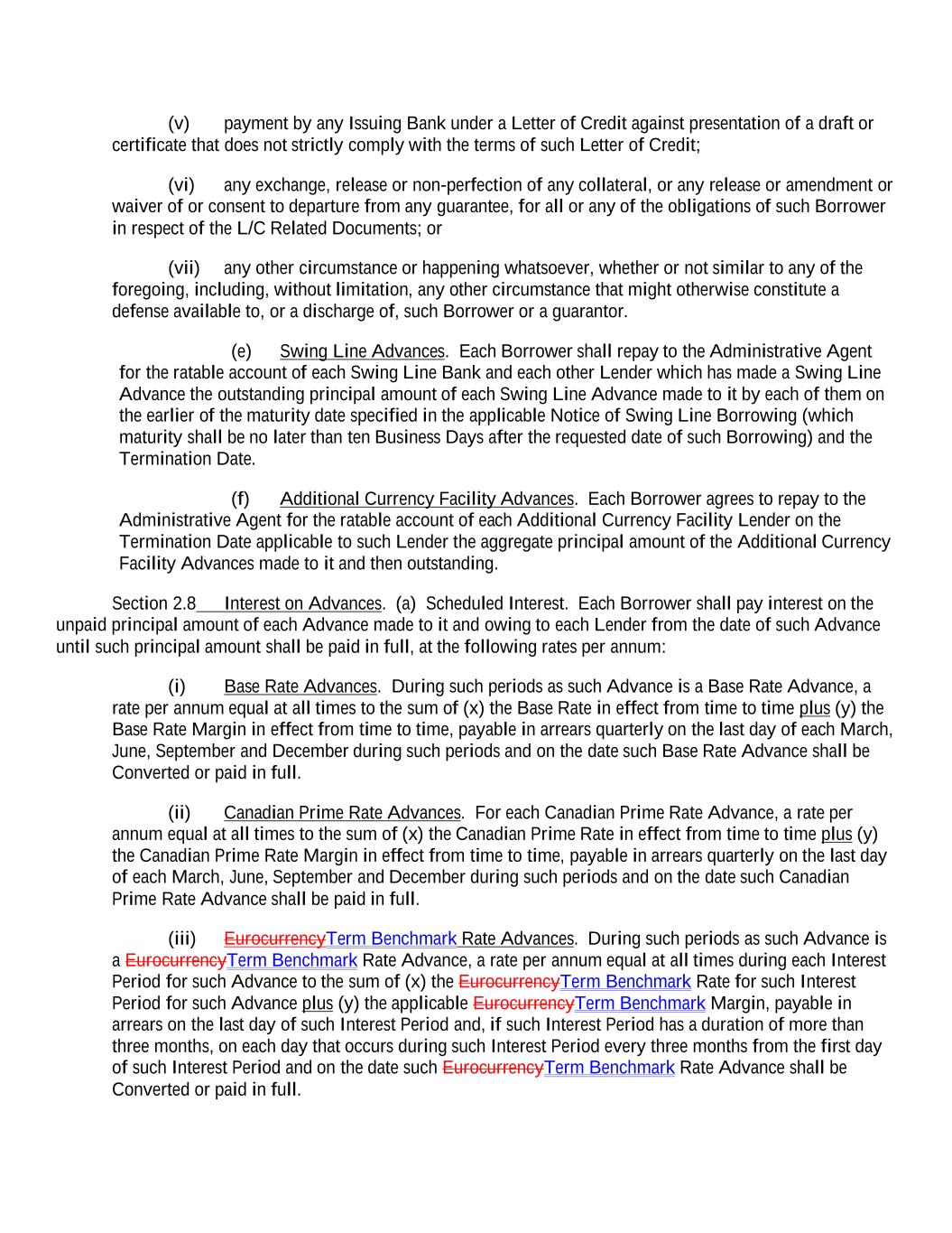 (v) payment by any Issuing Bank under a Letter of Credit against presentation of a draft or certificate that does not strictly comply with the terms of such Letter of Credit; (vi) any exchange, release or non-perfection of any collateral, or any release or amendment or waiver of or consent to departure from any guarantee, for all or any of the obligations of such Borrower in respect of the L/C Related Documents; or (vii) any other circumstance or happening whatsoever, whether or not similar to any of the foregoing, including, without limitation, any other circumstance that might otherwise constitute a defense available to, or a discharge of, such Borrower or a guarantor. (e) Swing Line Advances. Each Borrower shall repay to the Administrative Agent for the ratable account of each Swing Line Bank and each other Lender which has made a Swing Line Advance the outstanding principal amount of each Swing Line Advance made to it by each of them on the earlier of the maturity date specified in the applicable Notice of Swing Line Borrowing (which maturity shall be no later than ten Business Days after the requested date of such Borrowing) and the Termination Date. (f) Additional Currency Facility Advances. Each Borrower agrees to repay to the Administrative Agent for the ratable account of each Additional Currency Facility Lender on the Termination Date applicable to such Lender the aggregate principal amount of the Additional Currency Facility Advances made to it and then outstanding. Section 2.8 Interest on Advances. (a) Scheduled Interest. Each Borrower shall pay interest on the unpaid principal amount of each Advance made to it and owing to each Lender from the date of such Advance until such principal amount shall be paid in full, at the following rates per annum: (i) Base Rate Advances. During such periods as such Advance is a Base Rate Advance, a rate per annum equal at all times to the sum of (x) the Base Rate in effect from time to time plus (y) the Base Rate Margin in effect from time to time, payable in arrears quarterly on the last day of each March, June, September and December during such periods and on the date such Base Rate Advance shall be Converted or paid in full. (ii) Canadian Prime Rate Advances. For each Canadian Prime Rate Advance, a rate per annum equal at all times to the sum of (x) the Canadian Prime Rate in effect from time to time plus (y) the Canadian Prime Rate Margin in effect from time to time, payable in arrears quarterly on the last day of each March, June, September and December during such periods and on the date such Canadian Prime Rate Advance shall be paid in full. (iii) EurocurrencyTerm Benchmark Rate Advances. During such periods as such Advance is a EurocurrencyTerm Benchmark Rate Advance, a rate per annum equal at all times during each Interest Period for such Advance to the sum of (x) the EurocurrencyTerm Benchmark Rate for such Interest Period for such Advance plus (y) the applicable EurocurrencyTerm Benchmark Margin, payable in arrears on the last day of such Interest Period and, if such Interest Period has a duration of more than three months, on each day that occurs during such Interest Period every three months from the first day of such Interest Period and on the date such EurocurrencyTerm Benchmark Rate Advance shall be Converted or paid in full.
