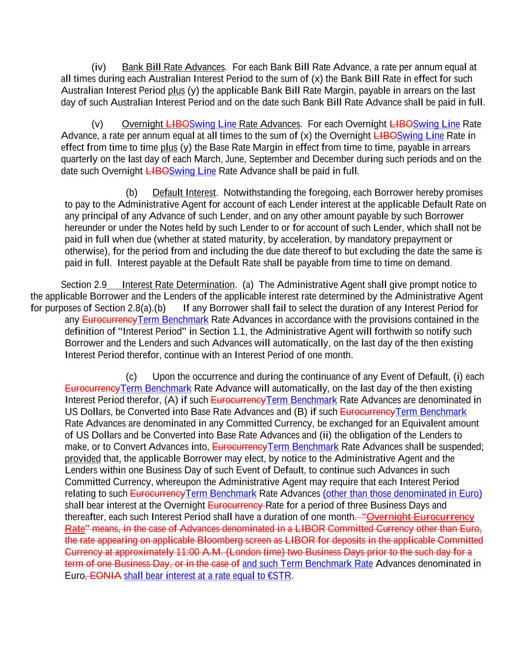(iv) Bank Bill Rate Advances. For each Bank Bill Rate Advance, a rate per annum equal at all times during each Australian Interest Period to the sum of (x) the Bank Bill Rate in effect for such Australian Interest Period plus (y) the applicable Bank Bill Rate Margin, payable in arrears on the last day of such Australian Interest Period and on the date such Bank Bill Rate Advance shall be paid in full. (v) Overnight LIBOSwing Line Rate Advances. For each Overnight LIBOSwing Line Rate Advance, a rate per annum equal at all times to the sum of (x) the Overnight LIBOSwing Line Rate in effect from time to time plus (y) the Base Rate Margin in effect from time to time, payable in arrears quarterly on the last day of each March, June, September and December during such periods and on the date such Overnight LIBOSwing Line Rate Advance shall be paid in full. (b) Default Interest. Notwithstanding the foregoing, each Borrower hereby promises to pay to the Administrative Agent for account of each Lender interest at the applicable Default Rate on any principal of any Advance of such Lender, and on any other amount payable by such Borrower hereunder or under the Notes held by such Lender to or for account of such Lender, which shall not be paid in full when due (whether at stated maturity, by acceleration, by mandatory prepayment or otherwise), for the period from and including the due date thereof to but excluding the date the same is paid in full. Interest payable at the Default Rate shall be payable from time to time on demand. Section 2.9 Interest Rate Determination. (a) The Administrative Agent shall give prompt notice to the applicable Borrower and the Lenders of the applicable interest rate determined by the Administrative Agent for purposes of Section 2.8(a).(b) If any Borrower shall fail to select the duration of any Interest Period for any EurocurrencyTerm Benchmark Rate Advances in accordance with the provisions contained in the definition of “Interest Period” in Section 1.1, the Administrative Agent will forthwith so notify such Borrower and the Lenders and such Advances will automatically, on the last day of the then existing Interest Period therefor, continue with an Interest Period of one month. (c) Upon the occurrence and during the continuance of any Event of Default, (i) each EurocurrencyTerm Benchmark Rate Advance will automatically, on the last day of the then existing Interest Period therefor, (A) if such EurocurrencyTerm Benchmark Rate Advances are denominated in US Dollars, be Converted into Base Rate Advances and (B) if such EurocurrencyTerm Benchmark Rate Advances are denominated in any Committed Currency, be exchanged for an Equivalent amount of US Dollars and be Converted into Base Rate Advances and (ii) the obligation of the Lenders to make, or to Convert Advances into, EurocurrencyTerm Benchmark Rate Advances shall be suspended; provided that, the applicable Borrower may elect, by notice to the Administrative Agent and the Lenders within one Business Day of such Event of Default, to continue such Advances in such Committed Currency, whereupon the Administrative Agent may require that each Interest Period relating to such EurocurrencyTerm Benchmark Rate Advances (other than those denominated in Euro) shall bear interest at the Overnight Eurocurrency Rate for a period of three Business Days and thereafter, each such Interest Period shall have a duration of one month. “Overnight Eurocurrency Rate” means, in the case of Advances denominated in a LIBOR Committed Currency other than Euro, the rate appearing on applicable Bloomberg screen as LIBOR for deposits in the applicable Committed Currency at approximately 11:00 A.M. (London time) two Business Days prior to the such day for a term of one Business Day, or in the case of and such Term Benchmark Rate Advances denominated in Euro, EONIA shall bear interest at a rate equal to €STR.