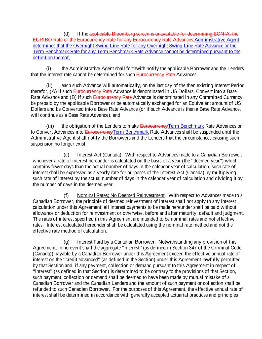 (d) If the applicable Bloomberg screen is unavailable for determining EONIA, the EURIBO Rate or the Eurocurrency Rate for any Eurocurrency Rate Advances,Administrative Agent determines that the Overnight Swing Line Rate for any Overnight Swing Line Rate Advance or the Term Benchmark Rate for any Term Benchmark Rate Advance cannot be determined pursuant to the definition thereof, (i) the Administrative Agent shall forthwith notify the applicable Borrower and the Lenders that the interest rate cannot be determined for such Eurocurrency Rate Advances, (ii) each such Advance will automatically, on the last day of the then existing Interest Period therefor, (A) if such Eurocurrency Rate Advance is denominated in US Dollars, Convert into a Base Rate Advance and (B) if such Eurocurrency Rate Advance is denominated in any Committed Currency, be prepaid by the applicable Borrower or be automatically exchanged for an Equivalent amount of US Dollars and be Converted into a Base Rate Advance (or if such Advance is then a Base Rate Advance, will continue as a Base Rate Advance), and (iii) the obligation of the Lenders to make EurocurrencyTerm Benchmark Rate Advances or to Convert Advances into EurocurrencyTerm Benchmark Rate Advances shall be suspended until the Administrative Agent shall notify the Borrowers and the Lenders that the circumstances causing such suspension no longer exist. (e) Interest Act (Canada). With respect to Advances made to a Canadian Borrower, whenever a rate of interest hereunder is calculated on the basis of a year (the “deemed year”) which contains fewer days than the actual number of days in the calendar year of calculation, such rate of interest shall be expressed as a yearly rate for purposes of the Interest Act (Canada) by multiplying such rate of interest by the actual number of days in the calendar year of calculation and dividing it by the number of days in the deemed year. (f) Nominal Rates; No Deemed Reinvestment. With respect to Advances made to a Canadian Borrower, the principle of deemed reinvestment of interest shall not apply to any interest calculation under this Agreement; all interest payments to be made hereunder shall be paid without allowance or deduction for reinvestment or otherwise, before and after maturity, default and judgment. The rates of interest specified in this Agreement are intended to be nominal rates and not effective rates. Interest calculated hereunder shall be calculated using the nominal rate method and not the effective rate method of calculation. (g) Interest Paid by a Canadian Borrower. Notwithstanding any provision of this Agreement, in no event shall the aggregate “interest” (as defined in Section 347 of the Criminal Code (Canada)) payable by a Canadian Borrower under this Agreement exceed the effective annual rate of interest on the “credit advanced” (as defined in the Section) under this Agreement lawfully permitted by that Section and, if any payment, collection or demand pursuant to this Agreement in respect of “interest” (as defined in that Section) is determined to be contrary to the provisions of that Section, such payment, collection or demand shall be deemed to have been made by mutual mistake of a Canadian Borrower and the Canadian Lenders and the amount of such payment or collection shall be refunded to such Canadian Borrower. For the purposes of this Agreement, the effective annual rate of interest shall be determined in accordance with generally accepted actuarial practices and principles