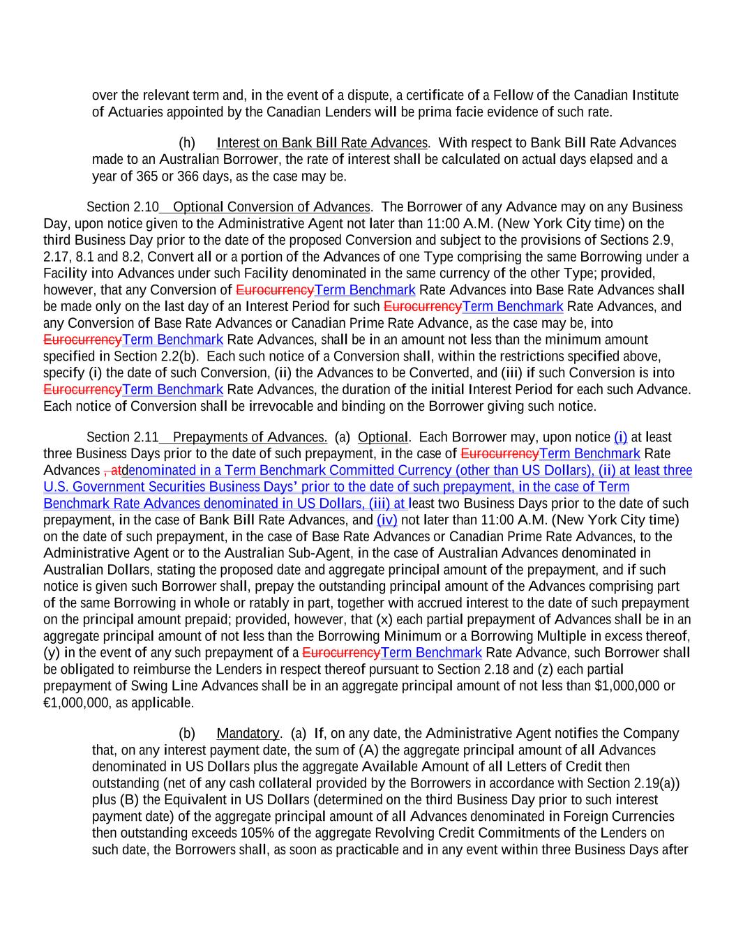 over the relevant term and, in the event of a dispute, a certificate of a Fellow of the Canadian Institute of Actuaries appointed by the Canadian Lenders will be prima facie evidence of such rate. (h) Interest on Bank Bill Rate Advances. With respect to Bank Bill Rate Advances made to an Australian Borrower, the rate of interest shall be calculated on actual days elapsed and a year of 365 or 366 days, as the case may be. Section 2.10 Optional Conversion of Advances. The Borrower of any Advance may on any Business Day, upon notice given to the Administrative Agent not later than 11:00 A.M. (New York City time) on the third Business Day prior to the date of the proposed Conversion and subject to the provisions of Sections 2.9, 2.17, 8.1 and 8.2, Convert all or a portion of the Advances of one Type comprising the same Borrowing under a Facility into Advances under such Facility denominated in the same currency of the other Type; provided, however, that any Conversion of EurocurrencyTerm Benchmark Rate Advances into Base Rate Advances shall be made only on the last day of an Interest Period for such EurocurrencyTerm Benchmark Rate Advances, and any Conversion of Base Rate Advances or Canadian Prime Rate Advance, as the case may be, into EurocurrencyTerm Benchmark Rate Advances, shall be in an amount not less than the minimum amount specified in Section 2.2(b). Each such notice of a Conversion shall, within the restrictions specified above, specify (i) the date of such Conversion, (ii) the Advances to be Converted, and (iii) if such Conversion is into EurocurrencyTerm Benchmark Rate Advances, the duration of the initial Interest Period for each such Advance. Each notice of Conversion shall be irrevocable and binding on the Borrower giving such notice. Section 2.11 Prepayments of Advances. (a) Optional. Each Borrower may, upon notice (i) at least three Business Days prior to the date of such prepayment, in the case of EurocurrencyTerm Benchmark Rate Advances , atdenominated in a Term Benchmark Committed Currency (other than US Dollars), (ii) at least three U.S. Government Securities Business Days’ prior to the date of such prepayment, in the case of Term Benchmark Rate Advances denominated in US Dollars, (iii) at least two Business Days prior to the date of such prepayment, in the case of Bank Bill Rate Advances, and (iv) not later than 11:00 A.M. (New York City time) on the date of such prepayment, in the case of Base Rate Advances or Canadian Prime Rate Advances, to the Administrative Agent or to the Australian Sub-Agent, in the case of Australian Advances denominated in Australian Dollars, stating the proposed date and aggregate principal amount of the prepayment, and if such notice is given such Borrower shall, prepay the outstanding principal amount of the Advances comprising part of the same Borrowing in whole or ratably in part, together with accrued interest to the date of such prepayment on the principal amount prepaid; provided, however, that (x) each partial prepayment of Advances shall be in an aggregate principal amount of not less than the Borrowing Minimum or a Borrowing Multiple in excess thereof, (y) in the event of any such prepayment of a EurocurrencyTerm Benchmark Rate Advance, such Borrower shall be obligated to reimburse the Lenders in respect thereof pursuant to Section 2.18 and (z) each partial prepayment of Swing Line Advances shall be in an aggregate principal amount of not less than $1,000,000 or €1,000,000, as applicable. (b) Mandatory. (a) If, on any date, the Administrative Agent notifies the Company that, on any interest payment date, the sum of (A) the aggregate principal amount of all Advances denominated in US Dollars plus the aggregate Available Amount of all Letters of Credit then outstanding (net of any cash collateral provided by the Borrowers in accordance with Section 2.19(a)) plus (B) the Equivalent in US Dollars (determined on the third Business Day prior to such interest payment date) of the aggregate principal amount of all Advances denominated in Foreign Currencies then outstanding exceeds 105% of the aggregate Revolving Credit Commitments of the Lenders on such date, the Borrowers shall, as soon as practicable and in any event within three Business Days after