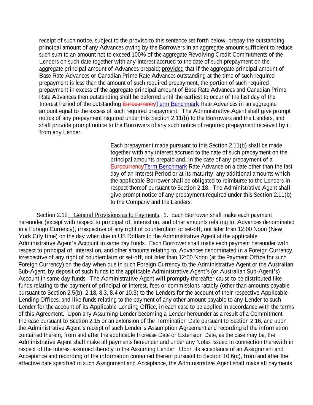 receipt of such notice, subject to the proviso to this sentence set forth below, prepay the outstanding principal amount of any Advances owing by the Borrowers in an aggregate amount sufficient to reduce such sum to an amount not to exceed 100% of the aggregate Revolving Credit Commitments of the Lenders on such date together with any interest accrued to the date of such prepayment on the aggregate principal amount of Advances prepaid; provided that if the aggregate principal amount of Base Rate Advances or Canadian Prime Rate Advances outstanding at the time of such required prepayment is less than the amount of such required prepayment, the portion of such required prepayment in excess of the aggregate principal amount of Base Rate Advances and Canadian Prime Rate Advances then outstanding shall be deferred until the earliest to occur of the last day of the Interest Period of the outstanding EurocurrencyTerm Benchmark Rate Advances in an aggregate amount equal to the excess of such required prepayment. The Administrative Agent shall give prompt notice of any prepayment required under this Section 2.11(b) to the Borrowers and the Lenders, and shall provide prompt notice to the Borrowers of any such notice of required prepayment received by it from any Lender. Each prepayment made pursuant to this Section 2.11(b) shall be made together with any interest accrued to the date of such prepayment on the principal amounts prepaid and, in the case of any prepayment of a EurocurrencyTerm Benchmark Rate Advance on a date other than the last day of an Interest Period or at its maturity, any additional amounts which the applicable Borrower shall be obligated to reimburse to the Lenders in respect thereof pursuant to Section 2.18. The Administrative Agent shall give prompt notice of any prepayment required under this Section 2.11(b) to the Company and the Lenders. Section 2.12 General Provisions as to Payments. 1. Each Borrower shall make each payment hereunder (except with respect to principal of, interest on, and other amounts relating to, Advances denominated in a Foreign Currency), irrespective of any right of counterclaim or set-off, not later than 12:00 Noon (New York City time) on the day when due in US Dollars to the Administrative Agent at the applicable Administrative Agent’s Account in same day funds. Each Borrower shall make each payment hereunder with respect to principal of, interest on, and other amounts relating to, Advances denominated in a Foreign Currency, irrespective of any right of counterclaim or set-off, not later than 12:00 Noon (at the Payment Office for such Foreign Currency) on the day when due in such Foreign Currency to the Administrative Agent or the Australian Sub-Agent, by deposit of such funds to the applicable Administrative Agent’s (or Australian Sub-Agent’s) Account in same day funds. The Administrative Agent will promptly thereafter cause to be distributed like funds relating to the payment of principal or interest, fees or commissions ratably (other than amounts payable pursuant to Section 2.5(b), 2.18, 8.3, 8.4 or 10.3) to the Lenders for the account of their respective Applicable Lending Offices, and like funds relating to the payment of any other amount payable to any Lender to such Lender for the account of its Applicable Lending Office, in each case to be applied in accordance with the terms of this Agreement. Upon any Assuming Lender becoming a Lender hereunder as a result of a Commitment Increase pursuant to Section 2.15 or an extension of the Termination Date pursuant to Section 2.16, and upon the Administrative Agent’s receipt of such Lender’s Assumption Agreement and recording of the information contained therein, from and after the applicable Increase Date or Extension Date, as the case may be, the Administrative Agent shall make all payments hereunder and under any Notes issued in connection therewith in respect of the interest assumed thereby to the Assuming Lender. Upon its acceptance of an Assignment and Acceptance and recording of the information contained therein pursuant to Section 10.6(c), from and after the effective date specified in such Assignment and Acceptance, the Administrative Agent shall make all payments