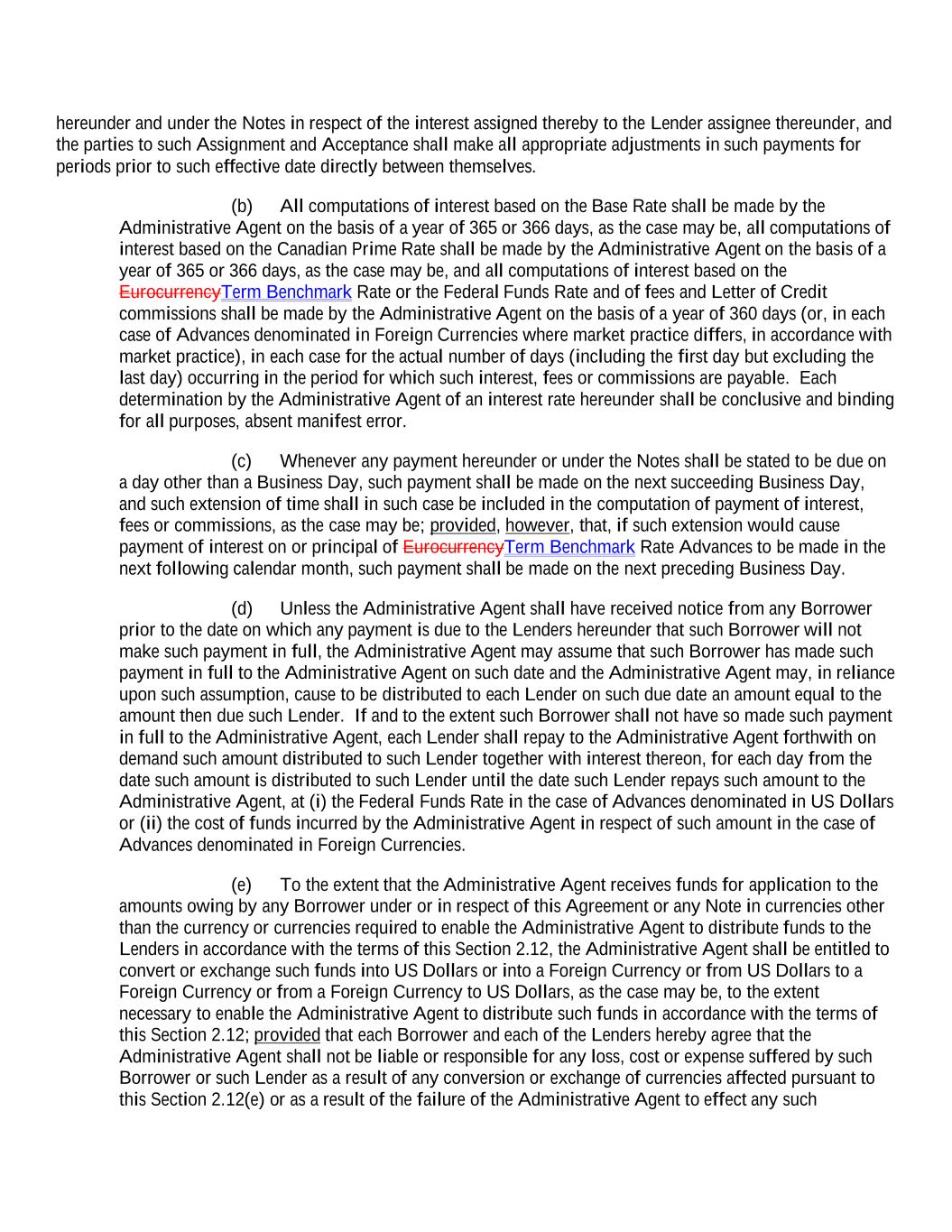 hereunder and under the Notes in respect of the interest assigned thereby to the Lender assignee thereunder, and the parties to such Assignment and Acceptance shall make all appropriate adjustments in such payments for periods prior to such effective date directly between themselves. (b) All computations of interest based on the Base Rate shall be made by the Administrative Agent on the basis of a year of 365 or 366 days, as the case may be, all computations of interest based on the Canadian Prime Rate shall be made by the Administrative Agent on the basis of a year of 365 or 366 days, as the case may be, and all computations of interest based on the EurocurrencyTerm Benchmark Rate or the Federal Funds Rate and of fees and Letter of Credit commissions shall be made by the Administrative Agent on the basis of a year of 360 days (or, in each case of Advances denominated in Foreign Currencies where market practice differs, in accordance with market practice), in each case for the actual number of days (including the first day but excluding the last day) occurring in the period for which such interest, fees or commissions are payable. Each determination by the Administrative Agent of an interest rate hereunder shall be conclusive and binding for all purposes, absent manifest error. (c) Whenever any payment hereunder or under the Notes shall be stated to be due on a day other than a Business Day, such payment shall be made on the next succeeding Business Day, and such extension of time shall in such case be included in the computation of payment of interest, fees or commissions, as the case may be; provided, however, that, if such extension would cause payment of interest on or principal of EurocurrencyTerm Benchmark Rate Advances to be made in the next following calendar month, such payment shall be made on the next preceding Business Day. (d) Unless the Administrative Agent shall have received notice from any Borrower prior to the date on which any payment is due to the Lenders hereunder that such Borrower will not make such payment in full, the Administrative Agent may assume that such Borrower has made such payment in full to the Administrative Agent on such date and the Administrative Agent may, in reliance upon such assumption, cause to be distributed to each Lender on such due date an amount equal to the amount then due such Lender. If and to the extent such Borrower shall not have so made such payment in full to the Administrative Agent, each Lender shall repay to the Administrative Agent forthwith on demand such amount distributed to such Lender together with interest thereon, for each day from the date such amount is distributed to such Lender until the date such Lender repays such amount to the Administrative Agent, at (i) the Federal Funds Rate in the case of Advances denominated in US Dollars or (ii) the cost of funds incurred by the Administrative Agent in respect of such amount in the case of Advances denominated in Foreign Currencies. (e) To the extent that the Administrative Agent receives funds for application to the amounts owing by any Borrower under or in respect of this Agreement or any Note in currencies other than the currency or currencies required to enable the Administrative Agent to distribute funds to the Lenders in accordance with the terms of this Section 2.12, the Administrative Agent shall be entitled to convert or exchange such funds into US Dollars or into a Foreign Currency or from US Dollars to a Foreign Currency or from a Foreign Currency to US Dollars, as the case may be, to the extent necessary to enable the Administrative Agent to distribute such funds in accordance with the terms of this Section 2.12; provided that each Borrower and each of the Lenders hereby agree that the Administrative Agent shall not be liable or responsible for any loss, cost or expense suffered by such Borrower or such Lender as a result of any conversion or exchange of currencies affected pursuant to this Section 2.12(e) or as a result of the failure of the Administrative Agent to effect any such