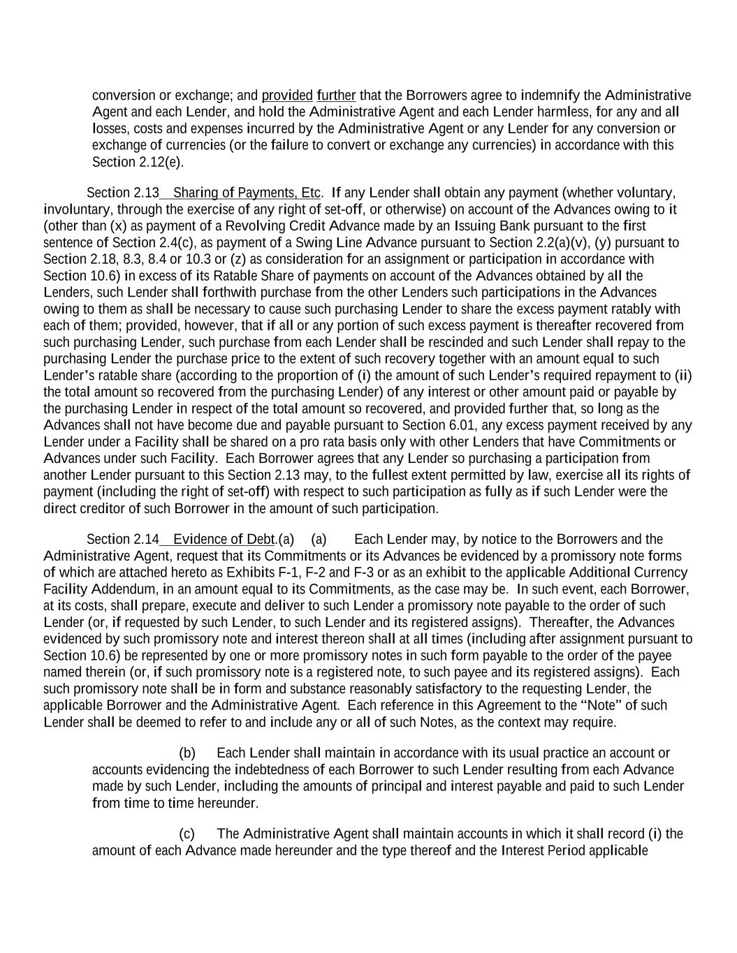 conversion or exchange; and provided further that the Borrowers agree to indemnify the Administrative Agent and each Lender, and hold the Administrative Agent and each Lender harmless, for any and all losses, costs and expenses incurred by the Administrative Agent or any Lender for any conversion or exchange of currencies (or the failure to convert or exchange any currencies) in accordance with this Section 2.12(e). Section 2.13 Sharing of Payments, Etc. If any Lender shall obtain any payment (whether voluntary, involuntary, through the exercise of any right of set-off, or otherwise) on account of the Advances owing to it (other than (x) as payment of a Revolving Credit Advance made by an Issuing Bank pursuant to the first sentence of Section 2.4(c), as payment of a Swing Line Advance pursuant to Section 2.2(a)(v), (y) pursuant to Section 2.18, 8.3, 8.4 or 10.3 or (z) as consideration for an assignment or participation in accordance with Section 10.6) in excess of its Ratable Share of payments on account of the Advances obtained by all the Lenders, such Lender shall forthwith purchase from the other Lenders such participations in the Advances owing to them as shall be necessary to cause such purchasing Lender to share the excess payment ratably with each of them; provided, however, that if all or any portion of such excess payment is thereafter recovered from such purchasing Lender, such purchase from each Lender shall be rescinded and such Lender shall repay to the purchasing Lender the purchase price to the extent of such recovery together with an amount equal to such Lender’s ratable share (according to the proportion of (i) the amount of such Lender’s required repayment to (ii) the total amount so recovered from the purchasing Lender) of any interest or other amount paid or payable by the purchasing Lender in respect of the total amount so recovered, and provided further that, so long as the Advances shall not have become due and payable pursuant to Section 6.01, any excess payment received by any Lender under a Facility shall be shared on a pro rata basis only with other Lenders that have Commitments or Advances under such Facility. Each Borrower agrees that any Lender so purchasing a participation from another Lender pursuant to this Section 2.13 may, to the fullest extent permitted by law, exercise all its rights of payment (including the right of set-off) with respect to such participation as fully as if such Lender were the direct creditor of such Borrower in the amount of such participation. Section 2.14 Evidence of Debt.(a) (a) Each Lender may, by notice to the Borrowers and the Administrative Agent, request that its Commitments or its Advances be evidenced by a promissory note forms of which are attached hereto as Exhibits F-1, F-2 and F-3 or as an exhibit to the applicable Additional Currency Facility Addendum, in an amount equal to its Commitments, as the case may be. In such event, each Borrower, at its costs, shall prepare, execute and deliver to such Lender a promissory note payable to the order of such Lender (or, if requested by such Lender, to such Lender and its registered assigns). Thereafter, the Advances evidenced by such promissory note and interest thereon shall at all times (including after assignment pursuant to Section 10.6) be represented by one or more promissory notes in such form payable to the order of the payee named therein (or, if such promissory note is a registered note, to such payee and its registered assigns). Each such promissory note shall be in form and substance reasonably satisfactory to the requesting Lender, the applicable Borrower and the Administrative Agent. Each reference in this Agreement to the “Note” of such Lender shall be deemed to refer to and include any or all of such Notes, as the context may require. (b) Each Lender shall maintain in accordance with its usual practice an account or accounts evidencing the indebtedness of each Borrower to such Lender resulting from each Advance made by such Lender, including the amounts of principal and interest payable and paid to such Lender from time to time hereunder. (c) The Administrative Agent shall maintain accounts in which it shall record (i) the amount of each Advance made hereunder and the type thereof and the Interest Period applicable