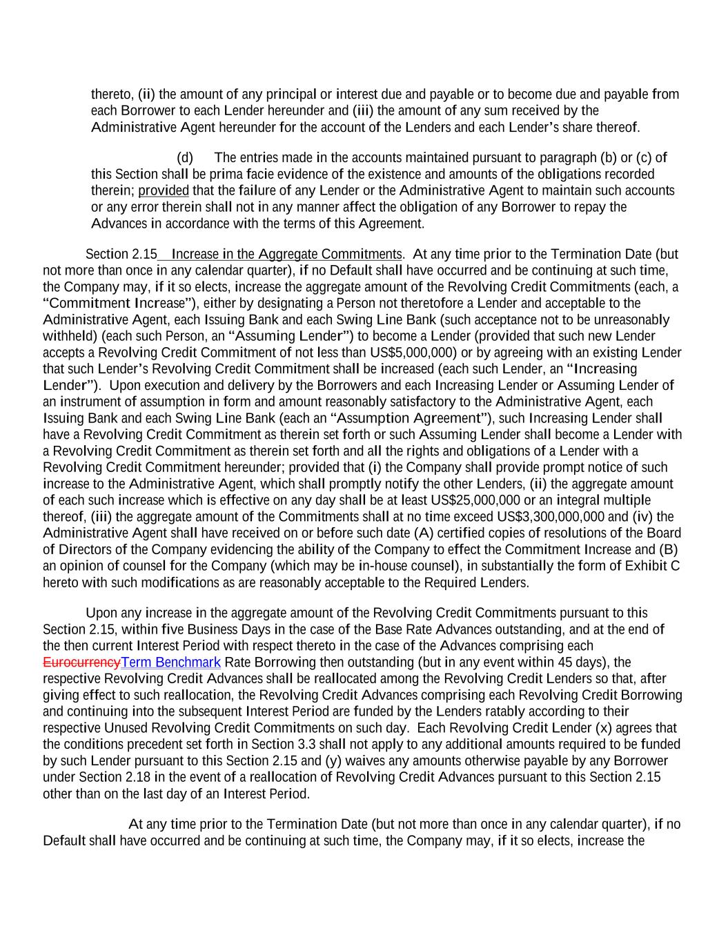 thereto, (ii) the amount of any principal or interest due and payable or to become due and payable from each Borrower to each Lender hereunder and (iii) the amount of any sum received by the Administrative Agent hereunder for the account of the Lenders and each Lender’s share thereof. (d) The entries made in the accounts maintained pursuant to paragraph (b) or (c) of this Section shall be prima facie evidence of the existence and amounts of the obligations recorded therein; provided that the failure of any Lender or the Administrative Agent to maintain such accounts or any error therein shall not in any manner affect the obligation of any Borrower to repay the Advances in accordance with the terms of this Agreement. Section 2.15 Increase in the Aggregate Commitments. At any time prior to the Termination Date (but not more than once in any calendar quarter), if no Default shall have occurred and be continuing at such time, the Company may, if it so elects, increase the aggregate amount of the Revolving Credit Commitments (each, a “Commitment Increase”), either by designating a Person not theretofore a Lender and acceptable to the Administrative Agent, each Issuing Bank and each Swing Line Bank (such acceptance not to be unreasonably withheld) (each such Person, an “Assuming Lender”) to become a Lender (provided that such new Lender accepts a Revolving Credit Commitment of not less than US$5,000,000) or by agreeing with an existing Lender that such Lender’s Revolving Credit Commitment shall be increased (each such Lender, an “Increasing Lender”). Upon execution and delivery by the Borrowers and each Increasing Lender or Assuming Lender of an instrument of assumption in form and amount reasonably satisfactory to the Administrative Agent, each Issuing Bank and each Swing Line Bank (each an “Assumption Agreement”), such Increasing Lender shall have a Revolving Credit Commitment as therein set forth or such Assuming Lender shall become a Lender with a Revolving Credit Commitment as therein set forth and all the rights and obligations of a Lender with a Revolving Credit Commitment hereunder; provided that (i) the Company shall provide prompt notice of such increase to the Administrative Agent, which shall promptly notify the other Lenders, (ii) the aggregate amount of each such increase which is effective on any day shall be at least US$25,000,000 or an integral multiple thereof, (iii) the aggregate amount of the Commitments shall at no time exceed US$3,300,000,000 and (iv) the Administrative Agent shall have received on or before such date (A) certified copies of resolutions of the Board of Directors of the Company evidencing the ability of the Company to effect the Commitment Increase and (B) an opinion of counsel for the Company (which may be in-house counsel), in substantially the form of Exhibit C hereto with such modifications as are reasonably acceptable to the Required Lenders. Upon any increase in the aggregate amount of the Revolving Credit Commitments pursuant to this Section 2.15, within five Business Days in the case of the Base Rate Advances outstanding, and at the end of the then current Interest Period with respect thereto in the case of the Advances comprising each EurocurrencyTerm Benchmark Rate Borrowing then outstanding (but in any event within 45 days), the respective Revolving Credit Advances shall be reallocated among the Revolving Credit Lenders so that, after giving effect to such reallocation, the Revolving Credit Advances comprising each Revolving Credit Borrowing and continuing into the subsequent Interest Period are funded by the Lenders ratably according to their respective Unused Revolving Credit Commitments on such day. Each Revolving Credit Lender (x) agrees that the conditions precedent set forth in Section 3.3 shall not apply to any additional amounts required to be funded by such Lender pursuant to this Section 2.15 and (y) waives any amounts otherwise payable by any Borrower under Section 2.18 in the event of a reallocation of Revolving Credit Advances pursuant to this Section 2.15 other than on the last day of an Interest Period. At any time prior to the Termination Date (but not more than once in any calendar quarter), if no Default shall have occurred and be continuing at such time, the Company may, if it so elects, increase the