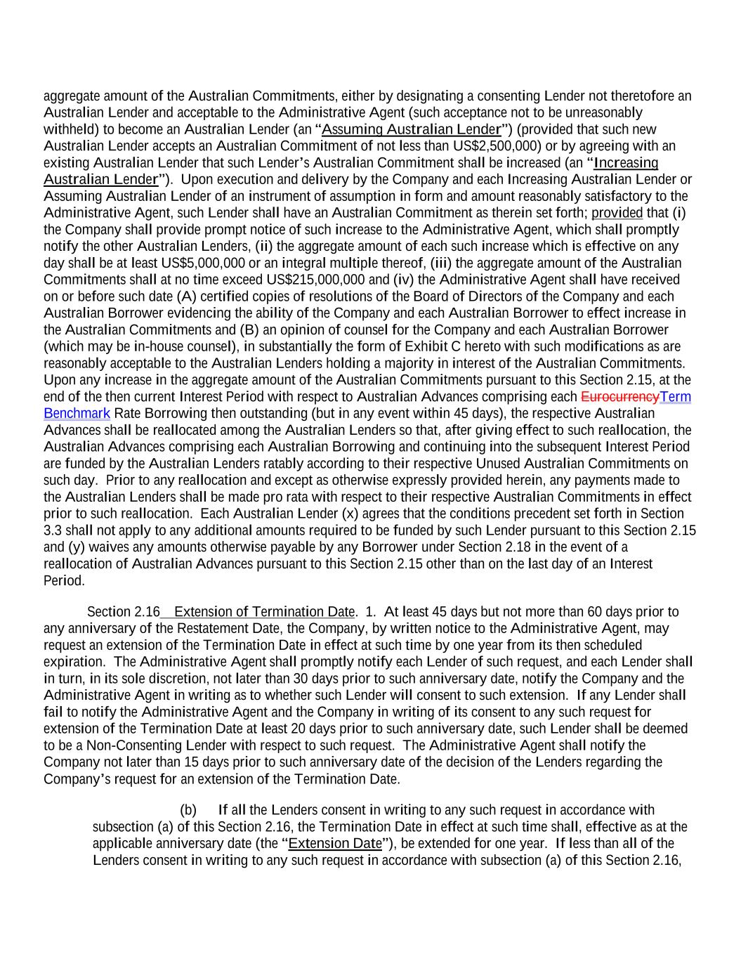 aggregate amount of the Australian Commitments, either by designating a consenting Lender not theretofore an Australian Lender and acceptable to the Administrative Agent (such acceptance not to be unreasonably withheld) to become an Australian Lender (an “Assuming Australian Lender”) (provided that such new Australian Lender accepts an Australian Commitment of not less than US$2,500,000) or by agreeing with an existing Australian Lender that such Lender’s Australian Commitment shall be increased (an “Increasing Australian Lender”). Upon execution and delivery by the Company and each Increasing Australian Lender or Assuming Australian Lender of an instrument of assumption in form and amount reasonably satisfactory to the Administrative Agent, such Lender shall have an Australian Commitment as therein set forth; provided that (i) the Company shall provide prompt notice of such increase to the Administrative Agent, which shall promptly notify the other Australian Lenders, (ii) the aggregate amount of each such increase which is effective on any day shall be at least US$5,000,000 or an integral multiple thereof, (iii) the aggregate amount of the Australian Commitments shall at no time exceed US$215,000,000 and (iv) the Administrative Agent shall have received on or before such date (A) certified copies of resolutions of the Board of Directors of the Company and each Australian Borrower evidencing the ability of the Company and each Australian Borrower to effect increase in the Australian Commitments and (B) an opinion of counsel for the Company and each Australian Borrower (which may be in-house counsel), in substantially the form of Exhibit C hereto with such modifications as are reasonably acceptable to the Australian Lenders holding a majority in interest of the Australian Commitments. Upon any increase in the aggregate amount of the Australian Commitments pursuant to this Section 2.15, at the end of the then current Interest Period with respect to Australian Advances comprising each EurocurrencyTerm Benchmark Rate Borrowing then outstanding (but in any event within 45 days), the respective Australian Advances shall be reallocated among the Australian Lenders so that, after giving effect to such reallocation, the Australian Advances comprising each Australian Borrowing and continuing into the subsequent Interest Period are funded by the Australian Lenders ratably according to their respective Unused Australian Commitments on such day. Prior to any reallocation and except as otherwise expressly provided herein, any payments made to the Australian Lenders shall be made pro rata with respect to their respective Australian Commitments in effect prior to such reallocation. Each Australian Lender (x) agrees that the conditions precedent set forth in Section 3.3 shall not apply to any additional amounts required to be funded by such Lender pursuant to this Section 2.15 and (y) waives any amounts otherwise payable by any Borrower under Section 2.18 in the event of a reallocation of Australian Advances pursuant to this Section 2.15 other than on the last day of an Interest Period. Section 2.16 Extension of Termination Date. 1. At least 45 days but not more than 60 days prior to any anniversary of the Restatement Date, the Company, by written notice to the Administrative Agent, may request an extension of the Termination Date in effect at such time by one year from its then scheduled expiration. The Administrative Agent shall promptly notify each Lender of such request, and each Lender shall in turn, in its sole discretion, not later than 30 days prior to such anniversary date, notify the Company and the Administrative Agent in writing as to whether such Lender will consent to such extension. If any Lender shall fail to notify the Administrative Agent and the Company in writing of its consent to any such request for extension of the Termination Date at least 20 days prior to such anniversary date, such Lender shall be deemed to be a Non-Consenting Lender with respect to such request. The Administrative Agent shall notify the Company not later than 15 days prior to such anniversary date of the decision of the Lenders regarding the Company’s request for an extension of the Termination Date. (b) If all the Lenders consent in writing to any such request in accordance with subsection (a) of this Section 2.16, the Termination Date in effect at such time shall, effective as at the applicable anniversary date (the “Extension Date”), be extended for one year. If less than all of the Lenders consent in writing to any such request in accordance with subsection (a) of this Section 2.16,
