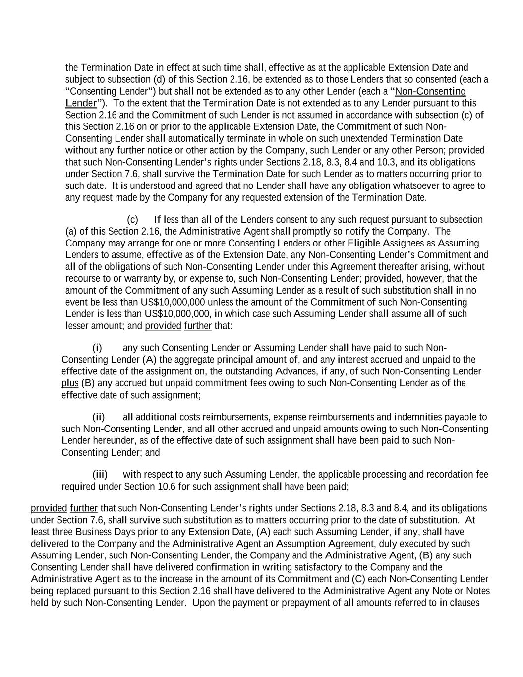 the Termination Date in effect at such time shall, effective as at the applicable Extension Date and subject to subsection (d) of this Section 2.16, be extended as to those Lenders that so consented (each a “Consenting Lender”) but shall not be extended as to any other Lender (each a “Non-Consenting Lender”). To the extent that the Termination Date is not extended as to any Lender pursuant to this Section 2.16 and the Commitment of such Lender is not assumed in accordance with subsection (c) of this Section 2.16 on or prior to the applicable Extension Date, the Commitment of such Non- Consenting Lender shall automatically terminate in whole on such unextended Termination Date without any further notice or other action by the Company, such Lender or any other Person; provided that such Non-Consenting Lender’s rights under Sections 2.18, 8.3, 8.4 and 10.3, and its obligations under Section 7.6, shall survive the Termination Date for such Lender as to matters occurring prior to such date. It is understood and agreed that no Lender shall have any obligation whatsoever to agree to any request made by the Company for any requested extension of the Termination Date. (c) If less than all of the Lenders consent to any such request pursuant to subsection (a) of this Section 2.16, the Administrative Agent shall promptly so notify the Company. The Company may arrange for one or more Consenting Lenders or other Eligible Assignees as Assuming Lenders to assume, effective as of the Extension Date, any Non-Consenting Lender’s Commitment and all of the obligations of such Non-Consenting Lender under this Agreement thereafter arising, without recourse to or warranty by, or expense to, such Non-Consenting Lender; provided, however, that the amount of the Commitment of any such Assuming Lender as a result of such substitution shall in no event be less than US$10,000,000 unless the amount of the Commitment of such Non-Consenting Lender is less than US$10,000,000, in which case such Assuming Lender shall assume all of such lesser amount; and provided further that: (i) any such Consenting Lender or Assuming Lender shall have paid to such Non- Consenting Lender (A) the aggregate principal amount of, and any interest accrued and unpaid to the effective date of the assignment on, the outstanding Advances, if any, of such Non-Consenting Lender plus (B) any accrued but unpaid commitment fees owing to such Non-Consenting Lender as of the effective date of such assignment; (ii) all additional costs reimbursements, expense reimbursements and indemnities payable to such Non-Consenting Lender, and all other accrued and unpaid amounts owing to such Non-Consenting Lender hereunder, as of the effective date of such assignment shall have been paid to such Non- Consenting Lender; and (iii) with respect to any such Assuming Lender, the applicable processing and recordation fee required under Section 10.6 for such assignment shall have been paid; provided further that such Non-Consenting Lender’s rights under Sections 2.18, 8.3 and 8.4, and its obligations under Section 7.6, shall survive such substitution as to matters occurring prior to the date of substitution. At least three Business Days prior to any Extension Date, (A) each such Assuming Lender, if any, shall have delivered to the Company and the Administrative Agent an Assumption Agreement, duly executed by such Assuming Lender, such Non-Consenting Lender, the Company and the Administrative Agent, (B) any such Consenting Lender shall have delivered confirmation in writing satisfactory to the Company and the Administrative Agent as to the increase in the amount of its Commitment and (C) each Non-Consenting Lender being replaced pursuant to this Section 2.16 shall have delivered to the Administrative Agent any Note or Notes held by such Non-Consenting Lender. Upon the payment or prepayment of all amounts referred to in clauses