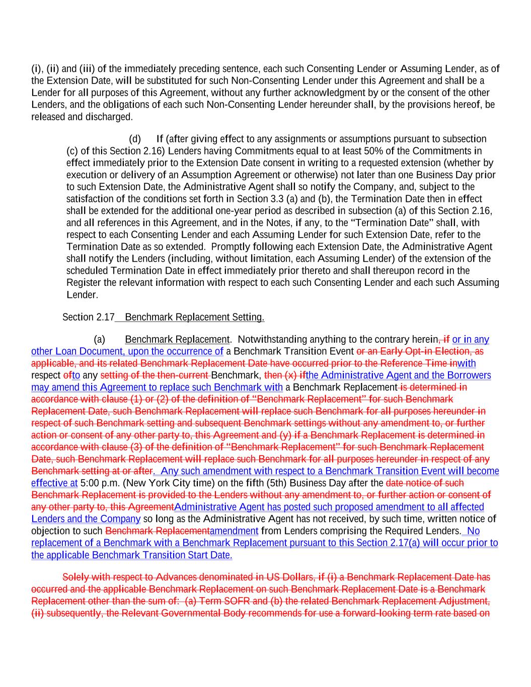 (i), (ii) and (iii) of the immediately preceding sentence, each such Consenting Lender or Assuming Lender, as of the Extension Date, will be substituted for such Non-Consenting Lender under this Agreement and shall be a Lender for all purposes of this Agreement, without any further acknowledgment by or the consent of the other Lenders, and the obligations of each such Non-Consenting Lender hereunder shall, by the provisions hereof, be released and discharged. (d) If (after giving effect to any assignments or assumptions pursuant to subsection (c) of this Section 2.16) Lenders having Commitments equal to at least 50% of the Commitments in effect immediately prior to the Extension Date consent in writing to a requested extension (whether by execution or delivery of an Assumption Agreement or otherwise) not later than one Business Day prior to such Extension Date, the Administrative Agent shall so notify the Company, and, subject to the satisfaction of the conditions set forth in Section 3.3 (a) and (b), the Termination Date then in effect shall be extended for the additional one-year period as described in subsection (a) of this Section 2.16, and all references in this Agreement, and in the Notes, if any, to the “Termination Date” shall, with respect to each Consenting Lender and each Assuming Lender for such Extension Date, refer to the Termination Date as so extended. Promptly following each Extension Date, the Administrative Agent shall notify the Lenders (including, without limitation, each Assuming Lender) of the extension of the scheduled Termination Date in effect immediately prior thereto and shall thereupon record in the Register the relevant information with respect to each such Consenting Lender and each such Assuming Lender. Section 2.17 Benchmark Replacement Setting. (a) Benchmark Replacement. Notwithstanding anything to the contrary herein, if or in any other Loan Document, upon the occurrence of a Benchmark Transition Event or an Early Opt-in Election, as applicable, and its related Benchmark Replacement Date have occurred prior to the Reference Time inwith respect ofto any setting of the then-current Benchmark, then (x) ifthe Administrative Agent and the Borrowers may amend this Agreement to replace such Benchmark with a Benchmark Replacement is determined in accordance with clause (1) or (2) of the definition of “Benchmark Replacement” for such Benchmark Replacement Date, such Benchmark Replacement will replace such Benchmark for all purposes hereunder in respect of such Benchmark setting and subsequent Benchmark settings without any amendment to, or further action or consent of any other party to, this Agreement and (y) if a Benchmark Replacement is determined in accordance with clause (3) of the definition of “Benchmark Replacement” for such Benchmark Replacement Date, such Benchmark Replacement will replace such Benchmark for all purposes hereunder in respect of any Benchmark setting at or after. Any such amendment with respect to a Benchmark Transition Event will become effective at 5:00 p.m. (New York City time) on the fifth (5th) Business Day after the date notice of such Benchmark Replacement is provided to the Lenders without any amendment to, or further action or consent of any other party to, this AgreementAdministrative Agent has posted such proposed amendment to all affected Lenders and the Company so long as the Administrative Agent has not received, by such time, written notice of objection to such Benchmark Replacementamendment from Lenders comprising the Required Lenders. No replacement of a Benchmark with a Benchmark Replacement pursuant to this Section 2.17(a) will occur prior to the applicable Benchmark Transition Start Date. Solely with respect to Advances denominated in US Dollars, if (i) a Benchmark Replacement Date has occurred and the applicable Benchmark Replacement on such Benchmark Replacement Date is a Benchmark Replacement other than the sum of: (a) Term SOFR and (b) the related Benchmark Replacement Adjustment, (ii) subsequently, the Relevant Governmental Body recommends for use a forward-looking term rate based on