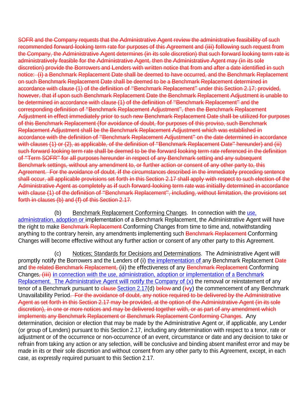 SOFR and the Company requests that the Administrative Agent review the administrative feasibility of such recommended forward-looking term rate for purposes of this Agreement and (iii) following such request from the Company, the Administrative Agent determines (in its sole discretion) that such forward looking term rate is administratively feasible for the Administrative Agent, then the Administrative Agent may (in its sole discretion) provide the Borrowers and Lenders with written notice that from and after a date identified in such notice: (i) a Benchmark Replacement Date shall be deemed to have occurred, and the Benchmark Replacement on such Benchmark Replacement Date shall be deemed to be a Benchmark Replacement determined in accordance with clause (1) of the definition of “Benchmark Replacement” under this Section 2.17; provided, however, that if upon such Benchmark Replacement Date the Benchmark Replacement Adjustment is unable to be determined in accordance with clause (1) of the definition of “Benchmark Replacement” and the corresponding definition of “Benchmark Replacement Adjustment”, then the Benchmark Replacement Adjustment in effect immediately prior to such new Benchmark Replacement Date shall be utilized for purposes of this Benchmark Replacement (for avoidance of doubt, for purposes of this proviso, such Benchmark Replacement Adjustment shall be the Benchmark Replacement Adjustment which was established in accordance with the definition of “Benchmark Replacement Adjustment” on the date determined in accordance with clauses (1) or (2), as applicable, of the definition of “Benchmark Replacement Date” hereunder) and (ii) such forward looking term rate shall be deemed to be the forward looking term rate referenced in the definition of “Term SOFR” for all purposes hereunder in respect of any Benchmark setting and any subsequent Benchmark settings, without any amendment to, or further action or consent of any other party to, this Agreement. For the avoidance of doubt, if the circumstances described in the immediately preceding sentence shall occur, all applicable provisions set forth in this Section 2.17 shall apply with respect to such election of the Administrative Agent as completely as if such forward-looking term rate was initially determined in accordance with clause (1) of the definition of “Benchmark Replacement”, including, without limitation, the provisions set forth in clauses (b) and (f) of this Section 2.17. (b) Benchmark Replacement Conforming Changes. In connection with the use, administration, adoption or implementation of a Benchmark Replacement, the Administrative Agent will have the right to make Benchmark Replacement Conforming Changes from time to time and, notwithstanding anything to the contrary herein, any amendments implementing such Benchmark Replacement Conforming Changes will become effective without any further action or consent of any other party to this Agreement. (c) Notices; Standards for Decisions and Determinations. The Administrative Agent will promptly notify the Borrowers and the Lenders of (i) the implementation of any Benchmark Replacement Date and the related Benchmark Replacement, (ii) the effectiveness of any Benchmark Replacement Conforming Changes, (iii) in connection with the use, administration, adoption or implementation of a Benchmark Replacement. The Administrative Agent will notify the Company of (x) the removal or reinstatement of any tenor of a Benchmark pursuant to clause Section 2.17(d) below and (ivy) the commencement of any Benchmark Unavailability Period. For the avoidance of doubt, any notice required to be delivered by the Administrative Agent as set forth in this Section 2.17 may be provided, at the option of the Administrative Agent (in its sole discretion), in one or more notices and may be delivered together with, or as part of any amendment which implements any Benchmark Replacement or Benchmark Replacement Conforming Changes. Any determination, decision or election that may be made by the Administrative Agent or, if applicable, any Lender (or group of Lenders) pursuant to this Section 2.17, including any determination with respect to a tenor, rate or adjustment or of the occurrence or non-occurrence of an event, circumstance or date and any decision to take or refrain from taking any action or any selection, will be conclusive and binding absent manifest error and may be made in its or their sole discretion and without consent from any other party to this Agreement, except, in each case, as expressly required pursuant to this Section 2.17.