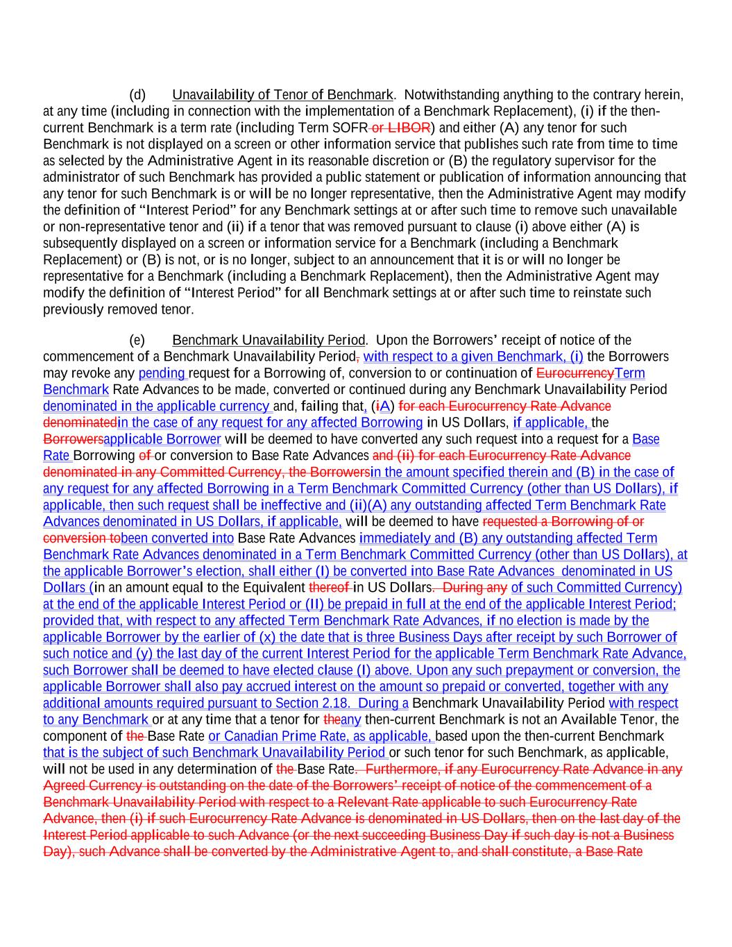(d) Unavailability of Tenor of Benchmark. Notwithstanding anything to the contrary herein, at any time (including in connection with the implementation of a Benchmark Replacement), (i) if the then- current Benchmark is a term rate (including Term SOFR or LIBOR) and either (A) any tenor for such Benchmark is not displayed on a screen or other information service that publishes such rate from time to time as selected by the Administrative Agent in its reasonable discretion or (B) the regulatory supervisor for the administrator of such Benchmark has provided a public statement or publication of information announcing that any tenor for such Benchmark is or will be no longer representative, then the Administrative Agent may modify the definition of “Interest Period” for any Benchmark settings at or after such time to remove such unavailable or non-representative tenor and (ii) if a tenor that was removed pursuant to clause (i) above either (A) is subsequently displayed on a screen or information service for a Benchmark (including a Benchmark Replacement) or (B) is not, or is no longer, subject to an announcement that it is or will no longer be representative for a Benchmark (including a Benchmark Replacement), then the Administrative Agent may modify the definition of “Interest Period” for all Benchmark settings at or after such time to reinstate such previously removed tenor. (e) Benchmark Unavailability Period. Upon the Borrowers’ receipt of notice of the commencement of a Benchmark Unavailability Period, with respect to a given Benchmark, (i) the Borrowers may revoke any pending request for a Borrowing of, conversion to or continuation of EurocurrencyTerm Benchmark Rate Advances to be made, converted or continued during any Benchmark Unavailability Period denominated in the applicable currency and, failing that, (iA) for each Eurocurrency Rate Advance denominatedin the case of any request for any affected Borrowing in US Dollars, if applicable, the Borrowersapplicable Borrower will be deemed to have converted any such request into a request for a Base Rate Borrowing of or conversion to Base Rate Advances and (ii) for each Eurocurrency Rate Advance denominated in any Committed Currency, the Borrowersin the amount specified therein and (B) in the case of any request for any affected Borrowing in a Term Benchmark Committed Currency (other than US Dollars), if applicable, then such request shall be ineffective and (ii)(A) any outstanding affected Term Benchmark Rate Advances denominated in US Dollars, if applicable, will be deemed to have requested a Borrowing of or conversion tobeen converted into Base Rate Advances immediately and (B) any outstanding affected Term Benchmark Rate Advances denominated in a Term Benchmark Committed Currency (other than US Dollars), at the applicable Borrower’s election, shall either (I) be converted into Base Rate Advances denominated in US Dollars (in an amount equal to the Equivalent thereof in US Dollars. During any of such Committed Currency) at the end of the applicable Interest Period or (II) be prepaid in full at the end of the applicable Interest Period; provided that, with respect to any affected Term Benchmark Rate Advances, if no election is made by the applicable Borrower by the earlier of (x) the date that is three Business Days after receipt by such Borrower of such notice and (y) the last day of the current Interest Period for the applicable Term Benchmark Rate Advance, such Borrower shall be deemed to have elected clause (I) above. Upon any such prepayment or conversion, the applicable Borrower shall also pay accrued interest on the amount so prepaid or converted, together with any additional amounts required pursuant to Section 2.18. During a Benchmark Unavailability Period with respect to any Benchmark or at any time that a tenor for theany then-current Benchmark is not an Available Tenor, the component of the Base Rate or Canadian Prime Rate, as applicable, based upon the then-current Benchmark that is the subject of such Benchmark Unavailability Period or such tenor for such Benchmark, as applicable, will not be used in any determination of the Base Rate. Furthermore, if any Eurocurrency Rate Advance in any Agreed Currency is outstanding on the date of the Borrowers’ receipt of notice of the commencement of a Benchmark Unavailability Period with respect to a Relevant Rate applicable to such Eurocurrency Rate Advance, then (i) if such Eurocurrency Rate Advance is denominated in US Dollars, then on the last day of the Interest Period applicable to such Advance (or the next succeeding Business Day if such day is not a Business Day), such Advance shall be converted by the Administrative Agent to, and shall constitute, a Base Rate