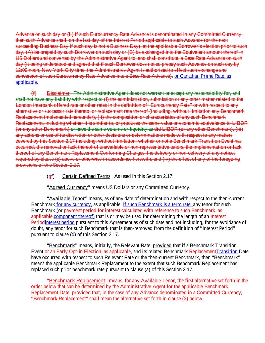 Advance on such day or (ii) if such Eurocurrency Rate Advance is denominated in any Committed Currency, then such Advance shall, on the last day of the Interest Period applicable to such Advance (or the next succeeding Business Day if such day is not a Business Day), at the applicable Borrower’s election prior to such day, (A) be prepaid by such Borrower on such day or (B) be exchanged into the Equivalent amount thereof in US Dollars and converted by the Administrative Agent to, and shall constitute, a Base Rate Advance on such day (it being understood and agreed that if such Borrower does not so prepay such Advance on such day by 12:00 noon, New York City time, the Administrative Agent is authorized to effect such exchange and conversion of such Eurocurrency Rate Advance into a Base Rate Advance). or Canadian Prime Rate, as applicable. (f) Disclaimer. The Administrative Agent does not warrant or accept any responsibility for, and shall not have any liability with respect to (i) the administration, submission or any other matter related to the London interbank offered rate or other rates in the definition of “Eurocurrency Rate” or with respect to any alternative or successor rate thereto, or replacement rate thereof (including, without limitation any Benchmark Replacement implemented hereunder), (ii) the composition or characteristics of any such Benchmark Replacement, including whether it is similar to, or produces the same value or economic equivalence to LIBOR (or any other Benchmark) or have the same volume or liquidity as did LIBOR (or any other Benchmark), (iii) any actions or use of its discretion or other decisions or determinations made with respect to any matters covered by this Section 2.17 including, without limitation, whether or not a Benchmark Transition Event has occurred, the removal or lack thereof of unavailable or non-representative tenors, the implementation or lack thereof of any Benchmark Replacement Conforming Changes, the delivery or non-delivery of any notices required by clause (c) above or otherwise in accordance herewith, and (iv) the effect of any of the foregoing provisions of this Section 2.17. (gf) Certain Defined Terms. As used in this Section 2.17: “Agreed Currency” means US Dollars or any Committed Currency. “Available Tenor” means, as of any date of determination and with respect to the then-current Benchmark for any currency, as applicable, if such Benchmark is a term rate, any tenor for such Benchmark (or payment period for interest calculated with reference to such Benchmark, as applicable,component thereof) that is or may be used for determining the length of an Interest Periodinterest period pursuant to this Agreement as of such date and not including, for the avoidance of doubt, any tenor for such Benchmark that is then-removed from the definition of “Interest Period” pursuant to clause (d) of this Section 2.17. “Benchmark” means, initially, the Relevant Rate; provided that if a Benchmark Transition Event or an Early Opt-in Election, as applicable, and its related Benchmark ReplacementTransition Date have occurred with respect to such Relevant Rate or the then-current Benchmark, then “Benchmark” means the applicable Benchmark Replacement to the extent that such Benchmark Replacement has replaced such prior benchmark rate pursuant to clause (a) of this Section 2.17. “Benchmark Replacement” means, for any Available Tenor, the first alternative set forth in the order below that can be determined by the Administrative Agent for the applicable Benchmark Replacement Date; provided that, in the case of any Advance denominated in a Committed Currency, “Benchmark Replacement” shall mean the alternative set forth in clause (3) below: