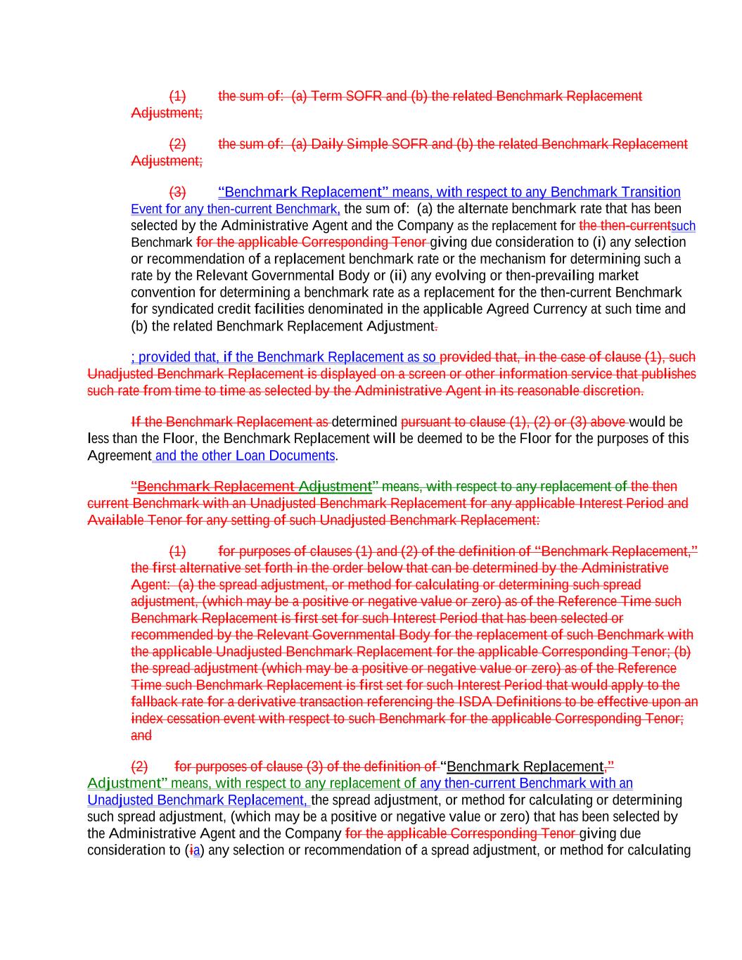 (1) the sum of: (a) Term SOFR and (b) the related Benchmark Replacement Adjustment; (2) the sum of: (a) Daily Simple SOFR and (b) the related Benchmark Replacement Adjustment; (3) “Benchmark Replacement” means, with respect to any Benchmark Transition Event for any then-current Benchmark, the sum of: (a) the alternate benchmark rate that has been selected by the Administrative Agent and the Company as the replacement for the then-currentsuch Benchmark for the applicable Corresponding Tenor giving due consideration to (i) any selection or recommendation of a replacement benchmark rate or the mechanism for determining such a rate by the Relevant Governmental Body or (ii) any evolving or then-prevailing market convention for determining a benchmark rate as a replacement for the then-current Benchmark for syndicated credit facilities denominated in the applicable Agreed Currency at such time and (b) the related Benchmark Replacement Adjustment. ; provided that, if the Benchmark Replacement as so provided that, in the case of clause (1), such Unadjusted Benchmark Replacement is displayed on a screen or other information service that publishes such rate from time to time as selected by the Administrative Agent in its reasonable discretion. If the Benchmark Replacement as determined pursuant to clause (1), (2) or (3) above would be less than the Floor, the Benchmark Replacement will be deemed to be the Floor for the purposes of this Agreement and the other Loan Documents. “Benchmark Replacement Adjustment” means, with respect to any replacement of the then current Benchmark with an Unadjusted Benchmark Replacement for any applicable Interest Period and Available Tenor for any setting of such Unadjusted Benchmark Replacement: (1) for purposes of clauses (1) and (2) of the definition of “Benchmark Replacement,” the first alternative set forth in the order below that can be determined by the Administrative Agent: (a) the spread adjustment, or method for calculating or determining such spread adjustment, (which may be a positive or negative value or zero) as of the Reference Time such Benchmark Replacement is first set for such Interest Period that has been selected or recommended by the Relevant Governmental Body for the replacement of such Benchmark with the applicable Unadjusted Benchmark Replacement for the applicable Corresponding Tenor; (b) the spread adjustment (which may be a positive or negative value or zero) as of the Reference Time such Benchmark Replacement is first set for such Interest Period that would apply to the fallback rate for a derivative transaction referencing the ISDA Definitions to be effective upon an index cessation event with respect to such Benchmark for the applicable Corresponding Tenor; and (2) for purposes of clause (3) of the definition of “Benchmark Replacement,” Adjustment” means, with respect to any replacement of any then-current Benchmark with an Unadjusted Benchmark Replacement, the spread adjustment, or method for calculating or determining such spread adjustment, (which may be a positive or negative value or zero) that has been selected by the Administrative Agent and the Company for the applicable Corresponding Tenor giving due consideration to (ia) any selection or recommendation of a spread adjustment, or method for calculating