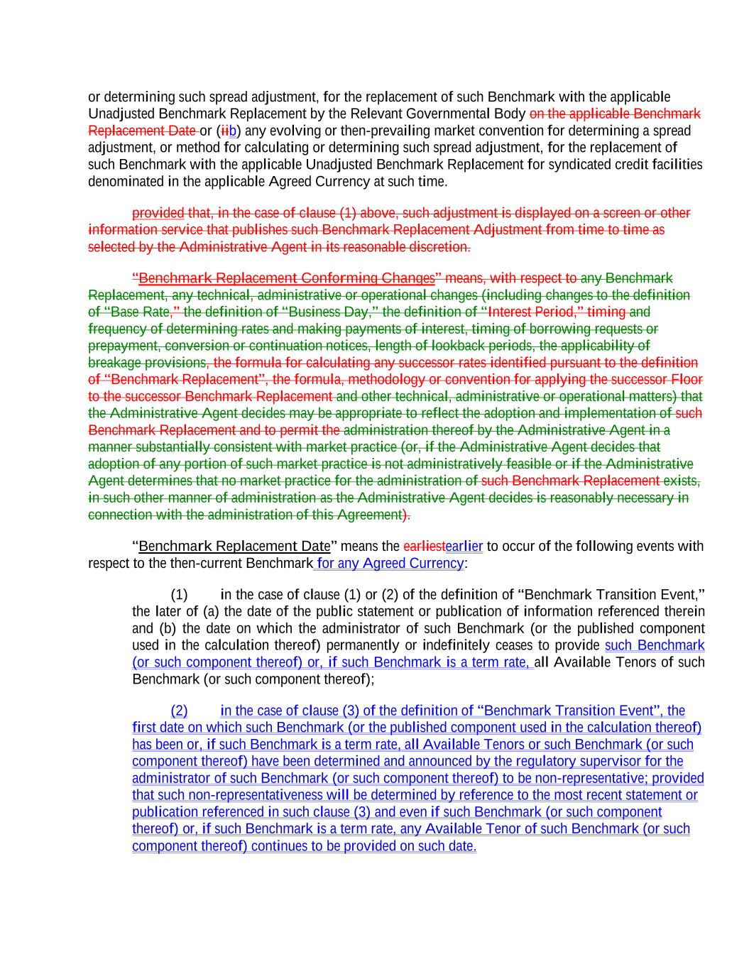 or determining such spread adjustment, for the replacement of such Benchmark with the applicable Unadjusted Benchmark Replacement by the Relevant Governmental Body on the applicable Benchmark Replacement Date or (iib) any evolving or then-prevailing market convention for determining a spread adjustment, or method for calculating or determining such spread adjustment, for the replacement of such Benchmark with the applicable Unadjusted Benchmark Replacement for syndicated credit facilities denominated in the applicable Agreed Currency at such time. provided that, in the case of clause (1) above, such adjustment is displayed on a screen or other information service that publishes such Benchmark Replacement Adjustment from time to time as selected by the Administrative Agent in its reasonable discretion. “Benchmark Replacement Conforming Changes” means, with respect to any Benchmark Replacement, any technical, administrative or operational changes (including changes to the definition of “Base Rate,” the definition of “Business Day,” the definition of “Interest Period,” timing and frequency of determining rates and making payments of interest, timing of borrowing requests or prepayment, conversion or continuation notices, length of lookback periods, the applicability of breakage provisions, the formula for calculating any successor rates identified pursuant to the definition of “Benchmark Replacement”, the formula, methodology or convention for applying the successor Floor to the successor Benchmark Replacement and other technical, administrative or operational matters) that the Administrative Agent decides may be appropriate to reflect the adoption and implementation of such Benchmark Replacement and to permit the administration thereof by the Administrative Agent in a manner substantially consistent with market practice (or, if the Administrative Agent decides that adoption of any portion of such market practice is not administratively feasible or if the Administrative Agent determines that no market practice for the administration of such Benchmark Replacement exists, in such other manner of administration as the Administrative Agent decides is reasonably necessary in connection with the administration of this Agreement). “Benchmark Replacement Date” means the earliestearlier to occur of the following events with respect to the then-current Benchmark for any Agreed Currency: (1) in the case of clause (1) or (2) of the definition of “Benchmark Transition Event,” the later of (a) the date of the public statement or publication of information referenced therein and (b) the date on which the administrator of such Benchmark (or the published component used in the calculation thereof) permanently or indefinitely ceases to provide such Benchmark (or such component thereof) or, if such Benchmark is a term rate, all Available Tenors of such Benchmark (or such component thereof); (2) in the case of clause (3) of the definition of “Benchmark Transition Event”, the first date on which such Benchmark (or the published component used in the calculation thereof) has been or, if such Benchmark is a term rate, all Available Tenors or such Benchmark (or such component thereof) have been determined and announced by the regulatory supervisor for the administrator of such Benchmark (or such component thereof) to be non-representative; provided that such non-representativeness will be determined by reference to the most recent statement or publication referenced in such clause (3) and even if such Benchmark (or such component thereof) or, if such Benchmark is a term rate, any Available Tenor of such Benchmark (or such component thereof) continues to be provided on such date.