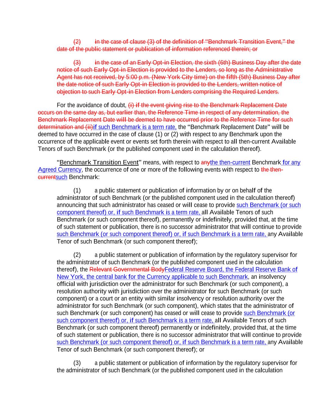 (2) in the case of clause (3) of the definition of “Benchmark Transition Event,” the date of the public statement or publication of information referenced therein; or (3) in the case of an Early Opt-in Election, the sixth (6th) Business Day after the date notice of such Early Opt-in Election is provided to the Lenders, so long as the Administrative Agent has not received, by 5:00 p.m. (New York City time) on the fifth (5th) Business Day after the date notice of such Early Opt-in Election is provided to the Lenders, written notice of objection to such Early Opt-in Election from Lenders comprising the Required Lenders. For the avoidance of doubt, (i) if the event giving rise to the Benchmark Replacement Date occurs on the same day as, but earlier than, the Reference Time in respect of any determination, the Benchmark Replacement Date will be deemed to have occurred prior to the Reference Time for such determination and (ii)if such Benchmark is a term rate, the “Benchmark Replacement Date” will be deemed to have occurred in the case of clause (1) or (2) with respect to any Benchmark upon the occurrence of the applicable event or events set forth therein with respect to all then-current Available Tenors of such Benchmark (or the published component used in the calculation thereof). “Benchmark Transition Event” means, with respect to anythe then-current Benchmark for any Agreed Currency, the occurrence of one or more of the following events with respect to the then- currentsuch Benchmark: (1) a public statement or publication of information by or on behalf of the administrator of such Benchmark (or the published component used in the calculation thereof) announcing that such administrator has ceased or will cease to provide such Benchmark (or such component thereof) or, if such Benchmark is a term rate, all Available Tenors of such Benchmark (or such component thereof), permanently or indefinitely, provided that, at the time of such statement or publication, there is no successor administrator that will continue to provide such Benchmark (or such component thereof) or, if such Benchmark is a term rate, any Available Tenor of such Benchmark (or such component thereof); (2) a public statement or publication of information by the regulatory supervisor for the administrator of such Benchmark (or the published component used in the calculation thereof), the Relevant Governmental BodyFederal Reserve Board, the Federal Reserve Bank of New York, the central bank for the Currency applicable to such Benchmark, an insolvency official with jurisdiction over the administrator for such Benchmark (or such component), a resolution authority with jurisdiction over the administrator for such Benchmark (or such component) or a court or an entity with similar insolvency or resolution authority over the administrator for such Benchmark (or such component), which states that the administrator of such Benchmark (or such component) has ceased or will cease to provide such Benchmark (or such component thereof) or, if such Benchmark is a term rate, all Available Tenors of such Benchmark (or such component thereof) permanently or indefinitely, provided that, at the time of such statement or publication, there is no successor administrator that will continue to provide such Benchmark (or such component thereof) or, if such Benchmark is a term rate, any Available Tenor of such Benchmark (or such component thereof); or (3) a public statement or publication of information by the regulatory supervisor for the administrator of such Benchmark (or the published component used in the calculation