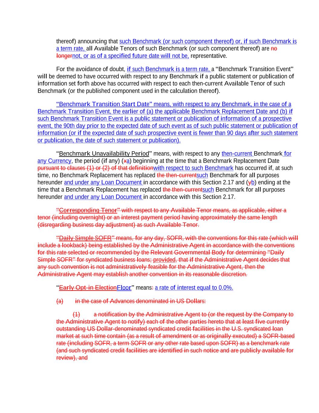 thereof) announcing that such Benchmark (or such component thereof) or, if such Benchmark is a term rate, all Available Tenors of such Benchmark (or such component thereof) are no longernot, or as of a specified future date will not be, representative. For the avoidance of doubt, if such Benchmark is a term rate, a “Benchmark Transition Event” will be deemed to have occurred with respect to any Benchmark if a public statement or publication of information set forth above has occurred with respect to each then-current Available Tenor of such Benchmark (or the published component used in the calculation thereof). “Benchmark Transition Start Date” means, with respect to any Benchmark, in the case of a Benchmark Transition Event, the earlier of (a) the applicable Benchmark Replacement Date and (b) if such Benchmark Transition Event is a public statement or publication of information of a prospective event, the 90th day prior to the expected date of such event as of such public statement or publication of information (or if the expected date of such prospective event is fewer than 90 days after such statement or publication, the date of such statement or publication). “Benchmark Unavailability Period” means, with respect to any then-current Benchmark for any Currency, the period (if any) (xa) beginning at the time that a Benchmark Replacement Date pursuant to clauses (1) or (2) of that definitionwith respect to such Benchmark has occurred if, at such time, no Benchmark Replacement has replaced the then-currentsuch Benchmark for all purposes hereunder and under any Loan Document in accordance with this Section 2.17 and (yb) ending at the time that a Benchmark Replacement has replaced the then-currentsuch Benchmark for all purposes hereunder and under any Loan Document in accordance with this Section 2.17. “Corresponding Tenor” with respect to any Available Tenor means, as applicable, either a tenor (including overnight) or an interest payment period having approximately the same length (disregarding business day adjustment) as such Available Tenor. “Daily Simple SOFR” means, for any day, SOFR, with the conventions for this rate (which will include a lookback) being established by the Administrative Agent in accordance with the conventions for this rate selected or recommended by the Relevant Governmental Body for determining “Daily Simple SOFR” for syndicated business loans; provided, that if the Administrative Agent decides that any such convention is not administratively feasible for the Administrative Agent, then the Administrative Agent may establish another convention in its reasonable discretion. “Early Opt-in ElectionFloor” means: a rate of interest equal to 0.0%. (a) in the case of Advances denominated in US Dollars: (1) a notification by the Administrative Agent to (or the request by the Company to the Administrative Agent to notify) each of the other parties hereto that at least five currently outstanding US Dollar-denominated syndicated credit facilities in the U.S. syndicated loan market at such time contain (as a result of amendment or as originally executed) a SOFR-based rate (including SOFR, a term SOFR or any other rate based upon SOFR) as a benchmark rate (and such syndicated credit facilities are identified in such notice and are publicly available for review), and