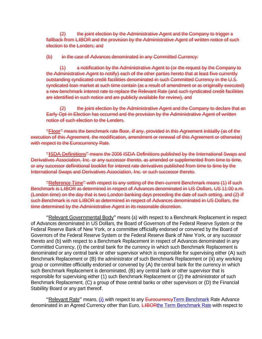 (2) the joint election by the Administrative Agent and the Company to trigger a fallback from LIBOR and the provision by the Administrative Agent of written notice of such election to the Lenders; and (b) in the case of Advances denominated in any Committed Currency: (1) a notification by the Administrative Agent to (or the request by the Company to the Administrative Agent to notify) each of the other parties hereto that at least five currently outstanding syndicated credit facilities denominated in such Committed Currency in the U.S. syndicated loan market at such time contain (as a result of amendment or as originally executed) a new benchmark interest rate to replace the Relevant Rate (and such syndicated credit facilities are identified in such notice and are publicly available for review), and (2) the joint election by the Administrative Agent and the Company to declare that an Early Opt-in Election has occurred and the provision by the Administrative Agent of written notice of such election to the Lenders. “Floor” means the benchmark rate floor, if any, provided in this Agreement initially (as of the execution of this Agreement, the modification, amendment or renewal of this Agreement or otherwise) with respect to the Eurocurrency Rate. “ISDA Definitions” means the 2006 ISDA Definitions published by the International Swaps and Derivatives Association, Inc. or any successor thereto, as amended or supplemented from time to time, or any successor definitional booklet for interest rate derivatives published from time to time by the International Swaps and Derivatives Association, Inc. or such successor thereto. “Reference Time” with respect to any setting of the then-current Benchmark means (1) if such Benchmark is LIBOR as determined in respect of Advances denominated in US Dollars, US 11:00 a.m. (London time) on the day that is two London banking days preceding the date of such setting, and (2) if such Benchmark is not LIBOR as determined in respect of Advances denominated in US Dollars, the time determined by the Administrative Agent in its reasonable discretion. “Relevant Governmental Body” means (a) with respect to a Benchmark Replacement in respect of Advances denominated in US Dollars, the Board of Governors of the Federal Reserve System or the Federal Reserve Bank of New York, or a committee officially endorsed or convened by the Board of Governors of the Federal Reserve System or the Federal Reserve Bank of New York, or any successor thereto and (b) with respect to a Benchmark Replacement in respect of Advances denominated in any Committed Currency, (i) the central bank for the currency in which such Benchmark Replacement is denominated or any central bank or other supervisor which is responsible for supervising either (A) such Benchmark Replacement or (B) the administrator of such Benchmark Replacement or (ii) any working group or committee officially endorsed or convened by (A) the central bank for the currency in which such Benchmark Replacement is denominated, (B) any central bank or other supervisor that is responsible for supervising either (1) such Benchmark Replacement or (2) the administrator of such Benchmark Replacement, (C) a group of those central banks or other supervisors or (D) the Financial Stability Board or any part thereof. “Relevant Rate” means, (i) with respect to any EurocurrencyTerm Benchmark Rate Advance denominated in an Agreed Currency other than Euro, LIBORthe Term Benchmark Rate with respect to