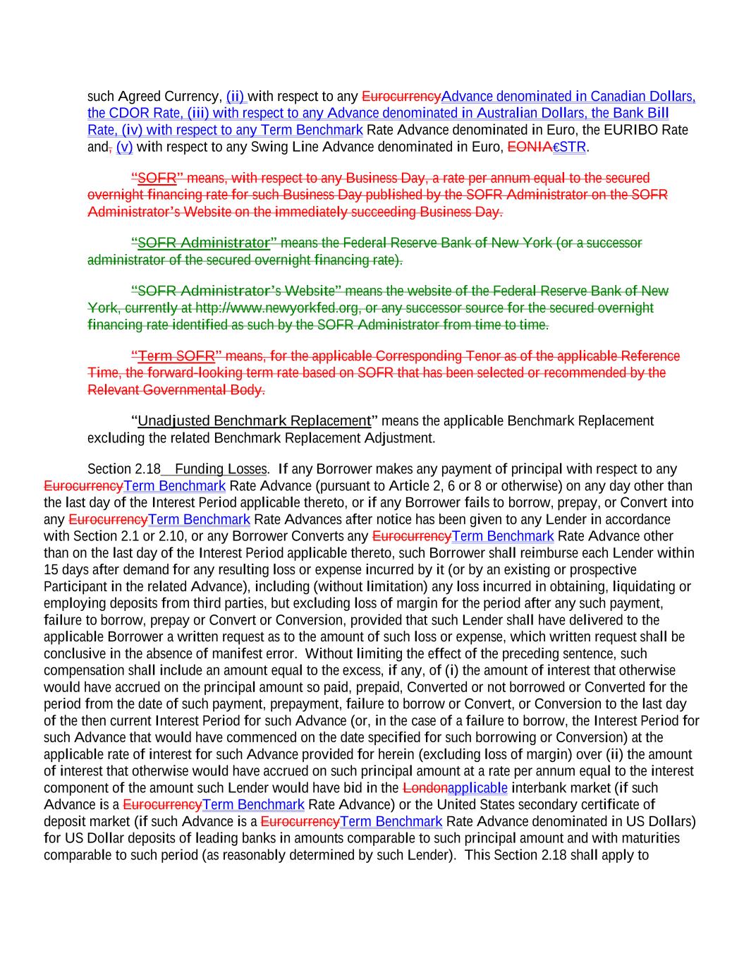 such Agreed Currency, (ii) with respect to any EurocurrencyAdvance denominated in Canadian Dollars, the CDOR Rate, (iii) with respect to any Advance denominated in Australian Dollars, the Bank Bill Rate, (iv) with respect to any Term Benchmark Rate Advance denominated in Euro, the EURIBO Rate and, (v) with respect to any Swing Line Advance denominated in Euro, EONIA€STR. “SOFR” means, with respect to any Business Day, a rate per annum equal to the secured overnight financing rate for such Business Day published by the SOFR Administrator on the SOFR Administrator’s Website on the immediately succeeding Business Day. “SOFR Administrator” means the Federal Reserve Bank of New York (or a successor administrator of the secured overnight financing rate). “SOFR Administrator’s Website” means the website of the Federal Reserve Bank of New York, currently at http://www.newyorkfed.org, or any successor source for the secured overnight financing rate identified as such by the SOFR Administrator from time to time. “Term SOFR” means, for the applicable Corresponding Tenor as of the applicable Reference Time, the forward-looking term rate based on SOFR that has been selected or recommended by the Relevant Governmental Body. “Unadjusted Benchmark Replacement” means the applicable Benchmark Replacement excluding the related Benchmark Replacement Adjustment. Section 2.18 Funding Losses. If any Borrower makes any payment of principal with respect to any EurocurrencyTerm Benchmark Rate Advance (pursuant to Article 2, 6 or 8 or otherwise) on any day other than the last day of the Interest Period applicable thereto, or if any Borrower fails to borrow, prepay, or Convert into any EurocurrencyTerm Benchmark Rate Advances after notice has been given to any Lender in accordance with Section 2.1 or 2.10, or any Borrower Converts any EurocurrencyTerm Benchmark Rate Advance other than on the last day of the Interest Period applicable thereto, such Borrower shall reimburse each Lender within 15 days after demand for any resulting loss or expense incurred by it (or by an existing or prospective Participant in the related Advance), including (without limitation) any loss incurred in obtaining, liquidating or employing deposits from third parties, but excluding loss of margin for the period after any such payment, failure to borrow, prepay or Convert or Conversion, provided that such Lender shall have delivered to the applicable Borrower a written request as to the amount of such loss or expense, which written request shall be conclusive in the absence of manifest error. Without limiting the effect of the preceding sentence, such compensation shall include an amount equal to the excess, if any, of (i) the amount of interest that otherwise would have accrued on the principal amount so paid, prepaid, Converted or not borrowed or Converted for the period from the date of such payment, prepayment, failure to borrow or Convert, or Conversion to the last day of the then current Interest Period for such Advance (or, in the case of a failure to borrow, the Interest Period for such Advance that would have commenced on the date specified for such borrowing or Conversion) at the applicable rate of interest for such Advance provided for herein (excluding loss of margin) over (ii) the amount of interest that otherwise would have accrued on such principal amount at a rate per annum equal to the interest component of the amount such Lender would have bid in the Londonapplicable interbank market (if such Advance is a EurocurrencyTerm Benchmark Rate Advance) or the United States secondary certificate of deposit market (if such Advance is a EurocurrencyTerm Benchmark Rate Advance denominated in US Dollars) for US Dollar deposits of leading banks in amounts comparable to such principal amount and with maturities comparable to such period (as reasonably determined by such Lender). This Section 2.18 shall apply to
