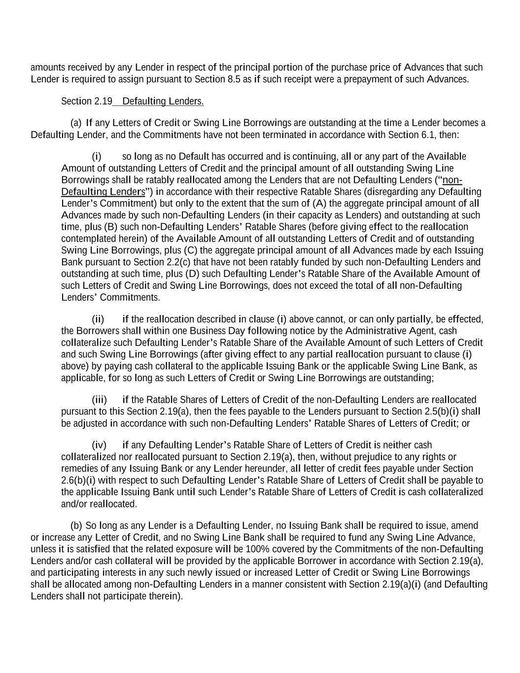 amounts received by any Lender in respect of the principal portion of the purchase price of Advances that such Lender is required to assign pursuant to Section 8.5 as if such receipt were a prepayment of such Advances. Section 2.19 Defaulting Lenders. (a) If any Letters of Credit or Swing Line Borrowings are outstanding at the time a Lender becomes a Defaulting Lender, and the Commitments have not been terminated in accordance with Section 6.1, then: (i) so long as no Default has occurred and is continuing, all or any part of the Available Amount of outstanding Letters of Credit and the principal amount of all outstanding Swing Line Borrowings shall be ratably reallocated among the Lenders that are not Defaulting Lenders (“non- Defaulting Lenders”) in accordance with their respective Ratable Shares (disregarding any Defaulting Lender’s Commitment) but only to the extent that the sum of (A) the aggregate principal amount of all Advances made by such non-Defaulting Lenders (in their capacity as Lenders) and outstanding at such time, plus (B) such non-Defaulting Lenders’ Ratable Shares (before giving effect to the reallocation contemplated herein) of the Available Amount of all outstanding Letters of Credit and of outstanding Swing Line Borrowings, plus (C) the aggregate principal amount of all Advances made by each Issuing Bank pursuant to Section 2.2(c) that have not been ratably funded by such non-Defaulting Lenders and outstanding at such time, plus (D) such Defaulting Lender’s Ratable Share of the Available Amount of such Letters of Credit and Swing Line Borrowings, does not exceed the total of all non-Defaulting Lenders’ Commitments. (ii) if the reallocation described in clause (i) above cannot, or can only partially, be effected, the Borrowers shall within one Business Day following notice by the Administrative Agent, cash collateralize such Defaulting Lender’s Ratable Share of the Available Amount of such Letters of Credit and such Swing Line Borrowings (after giving effect to any partial reallocation pursuant to clause (i) above) by paying cash collateral to the applicable Issuing Bank or the applicable Swing Line Bank, as applicable, for so long as such Letters of Credit or Swing Line Borrowings are outstanding; (iii) if the Ratable Shares of Letters of Credit of the non-Defaulting Lenders are reallocated pursuant to this Section 2.19(a), then the fees payable to the Lenders pursuant to Section 2.5(b)(i) shall be adjusted in accordance with such non-Defaulting Lenders’ Ratable Shares of Letters of Credit; or (iv) if any Defaulting Lender’s Ratable Share of Letters of Credit is neither cash collateralized nor reallocated pursuant to Section 2.19(a), then, without prejudice to any rights or remedies of any Issuing Bank or any Lender hereunder, all letter of credit fees payable under Section 2.6(b)(i) with respect to such Defaulting Lender’s Ratable Share of Letters of Credit shall be payable to the applicable Issuing Bank until such Lender’s Ratable Share of Letters of Credit is cash collateralized and/or reallocated. (b) So long as any Lender is a Defaulting Lender, no Issuing Bank shall be required to issue, amend or increase any Letter of Credit, and no Swing Line Bank shall be required to fund any Swing Line Advance, unless it is satisfied that the related exposure will be 100% covered by the Commitments of the non-Defaulting Lenders and/or cash collateral will be provided by the applicable Borrower in accordance with Section 2.19(a), and participating interests in any such newly issued or increased Letter of Credit or Swing Line Borrowings shall be allocated among non-Defaulting Lenders in a manner consistent with Section 2.19(a)(i) (and Defaulting Lenders shall not participate therein).