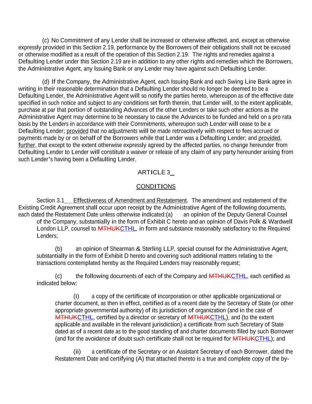 (c) No Commitment of any Lender shall be increased or otherwise affected, and, except as otherwise expressly provided in this Section 2.19, performance by the Borrowers of their obligations shall not be excused or otherwise modified as a result of the operation of this Section 2.19. The rights and remedies against a Defaulting Lender under this Section 2.19 are in addition to any other rights and remedies which the Borrowers, the Administrative Agent, any Issuing Bank or any Lender may have against such Defaulting Lender. (d) If the Company, the Administrative Agent, each Issuing Bank and each Swing Line Bank agree in writing in their reasonable determination that a Defaulting Lender should no longer be deemed to be a Defaulting Lender, the Administrative Agent will so notify the parties hereto, whereupon as of the effective date specified in such notice and subject to any conditions set forth therein, that Lender will, to the extent applicable, purchase at par that portion of outstanding Advances of the other Lenders or take such other actions as the Administrative Agent may determine to be necessary to cause the Advances to be funded and held on a pro rata basis by the Lenders in accordance with their Commitments, whereupon such Lender will cease to be a Defaulting Lender; provided that no adjustments will be made retroactively with respect to fees accrued or payments made by or on behalf of the Borrowers while that Lender was a Defaulting Lender; and provided, further, that except to the extent otherwise expressly agreed by the affected parties, no change hereunder from Defaulting Lender to Lender will constitute a waiver or release of any claim of any party hereunder arising from such Lender’s having been a Defaulting Lender. ARTICLE 3 CONDITIONS Section 3.1 Effectiveness of Amendment and Restatement. The amendment and restatement of the Existing Credit Agreement shall occur upon receipt by the Administrative Agent of the following documents, each dated the Restatement Date unless otherwise indicated:(a) an opinion of the Deputy General Counsel of the Company, substantially in the form of Exhibit C hereto and an opinion of Davis Polk & Wardwell London LLP, counsel to MTHUKCTHL, in form and substance reasonably satisfactory to the Required Lenders; (b) an opinion of Shearman & Sterling LLP, special counsel for the Administrative Agent, substantially in the form of Exhibit D hereto and covering such additional matters relating to the transactions contemplated hereby as the Required Lenders may reasonably request; (c) the following documents of each of the Company and MTHUKCTHL, each certified as indicated below: (i) a copy of the certificate of incorporation or other applicable organizational or charter document, as then in effect, certified as of a recent date by the Secretary of State (or other appropriate governmental authority) of its jurisdiction of organization (and in the case of MTHUKCTHL, certified by a director or secretary of MTHUKCTHL), and (to the extent applicable and available in the relevant jurisdiction) a certificate from such Secretary of State dated as of a recent date as to the good standing of and charter documents filed by such Borrower (and for the avoidance of doubt such certificate shall not be required for MTHUKCTHL); and (ii) a certificate of the Secretary or an Assistant Secretary of each Borrower, dated the Restatement Date and certifying (A) that attached thereto is a true and complete copy of the by-