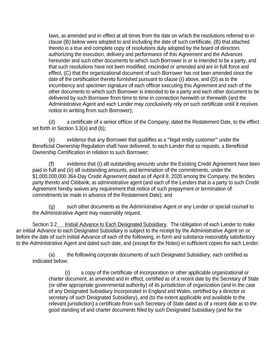 laws, as amended and in effect at all times from the date on which the resolutions referred to in clause (B) below were adopted to and including the date of such certificate, (B) that attached thereto is a true and complete copy of resolutions duly adopted by the board of directors authorizing the execution, delivery and performance of this Agreement and the Advances hereunder and such other documents to which such Borrower is or is intended to be a party, and that such resolutions have not been modified, rescinded or amended and are in full force and effect, (C) that the organizational document of such Borrower has not been amended since the date of the certification thereto furnished pursuant to clause (i) above, and (D) as to the incumbency and specimen signature of each officer executing this Agreement and each of the other documents to which such Borrower is intended to be a party and each other document to be delivered by such Borrower from time to time in connection herewith or therewith (and the Administrative Agent and each Lender may conclusively rely on such certificate until it receives notice in writing from such Borrower); (d) a certificate of a senior officer of the Company, dated the Restatement Date, to the effect set forth in Section 3.3(a) and (b); (e) evidence that any Borrower that qualifies as a “legal entity customer” under the Beneficial Ownership Regulation shall have delivered, to each Lender that so requests, a Beneficial Ownership Certification in relation to such Borrower; (f) evidence that (i) all outstanding amounts under the Existing Credit Agreement have been paid in full and (ii) all outstanding amounts, and termination of the commitments, under the $1,000,000,000 364-Day Credit Agreement dated as of April 8, 2020 among the Company, the lenders party thereto and Citibank, as administrative agent (and each of the Lenders that is a party to such Credit Agreement hereby waives any requirement that notice of such prepayment or termination of commitments be made in advance of the Restatement Date); and (g) such other documents as the Administrative Agent or any Lender or special counsel to the Administrative Agent may reasonably request. Section 3.2 Initial Advance to Each Designated Subsidiary. The obligation of each Lender to make an initial Advance to each Designated Subsidiary is subject to the receipt by the Administrative Agent on or before the date of such initial Advance of each of the following, in form and substance reasonably satisfactory to the Administrative Agent and dated such date, and (except for the Notes) in sufficient copies for each Lender: (a) the following corporate documents of such Designated Subsidiary, each certified as indicated below: (i) a copy of the certificate of incorporation or other applicable organizational or charter document, as amended and in effect, certified as of a recent date by the Secretary of State (or other appropriate governmental authority) of its jurisdiction of organization (and in the case of any Designated Subsidiary incorporated in England and Wales, certified by a director or secretary of such Designated Subsidiary), and (to the extent applicable and available to the relevant jurisdiction) a certificate from such Secretary of State dated as of a recent date as to the good standing of and charter documents filed by such Designated Subsidiary (and for the