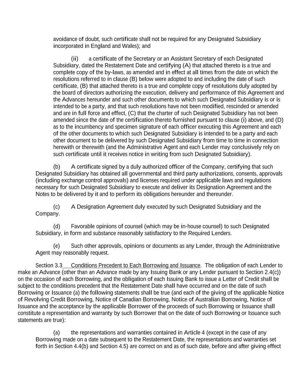 avoidance of doubt, such certificate shall not be required for any Designated Subsidiary incorporated in England and Wales); and (ii) a certificate of the Secretary or an Assistant Secretary of each Designated Subsidiary, dated the Restatement Date and certifying (A) that attached thereto is a true and complete copy of the by-laws, as amended and in effect at all times from the date on which the resolutions referred to in clause (B) below were adopted to and including the date of such certificate, (B) that attached thereto is a true and complete copy of resolutions duly adopted by the board of directors authorizing the execution, delivery and performance of this Agreement and the Advances hereunder and such other documents to which such Designated Subsidiary is or is intended to be a party, and that such resolutions have not been modified, rescinded or amended and are in full force and effect, (C) that the charter of such Designated Subsidiary has not been amended since the date of the certification thereto furnished pursuant to clause (i) above, and (D) as to the incumbency and specimen signature of each officer executing this Agreement and each of the other documents to which such Designated Subsidiary is intended to be a party and each other document to be delivered by such Designated Subsidiary from time to time in connection herewith or therewith (and the Administrative Agent and each Lender may conclusively rely on such certificate until it receives notice in writing from such Designated Subsidiary). (b) A certificate signed by a duly authorized officer of the Company, certifying that such Designated Subsidiary has obtained all governmental and third party authorizations, consents, approvals (including exchange control approvals) and licenses required under applicable laws and regulations necessary for such Designated Subsidiary to execute and deliver its Designation Agreement and the Notes to be delivered by it and to perform its obligations hereunder and thereunder. (c) A Designation Agreement duly executed by such Designated Subsidiary and the Company. (d) Favorable opinions of counsel (which may be in-house counsel) to such Designated Subsidiary, in form and substance reasonably satisfactory to the Required Lenders. (e) Such other approvals, opinions or documents as any Lender, through the Administrative Agent may reasonably request. Section 3.3 Conditions Precedent to Each Borrowing and Issuance. The obligation of each Lender to make an Advance (other than an Advance made by any Issuing Bank or any Lender pursuant to Section 2.4(c)) on the occasion of each Borrowing, and the obligation of each Issuing Bank to issue a Letter of Credit shall be subject to the conditions precedent that the Restatement Date shall have occurred and on the date of such Borrowing or Issuance (a) the following statements shall be true (and each of the giving of the applicable Notice of Revolving Credit Borrowing, Notice of Canadian Borrowing, Notice of Australian Borrowing, Notice of Issuance and the acceptance by the applicable Borrower of the proceeds of such Borrowing or Issuance shall constitute a representation and warranty by such Borrower that on the date of such Borrowing or Issuance such statements are true): (a) the representations and warranties contained in Article 4 (except in the case of any Borrowing made on a date subsequent to the Restatement Date, the representations and warranties set forth in Section 4.4(b) and Section 4.5) are correct on and as of such date, before and after giving effect