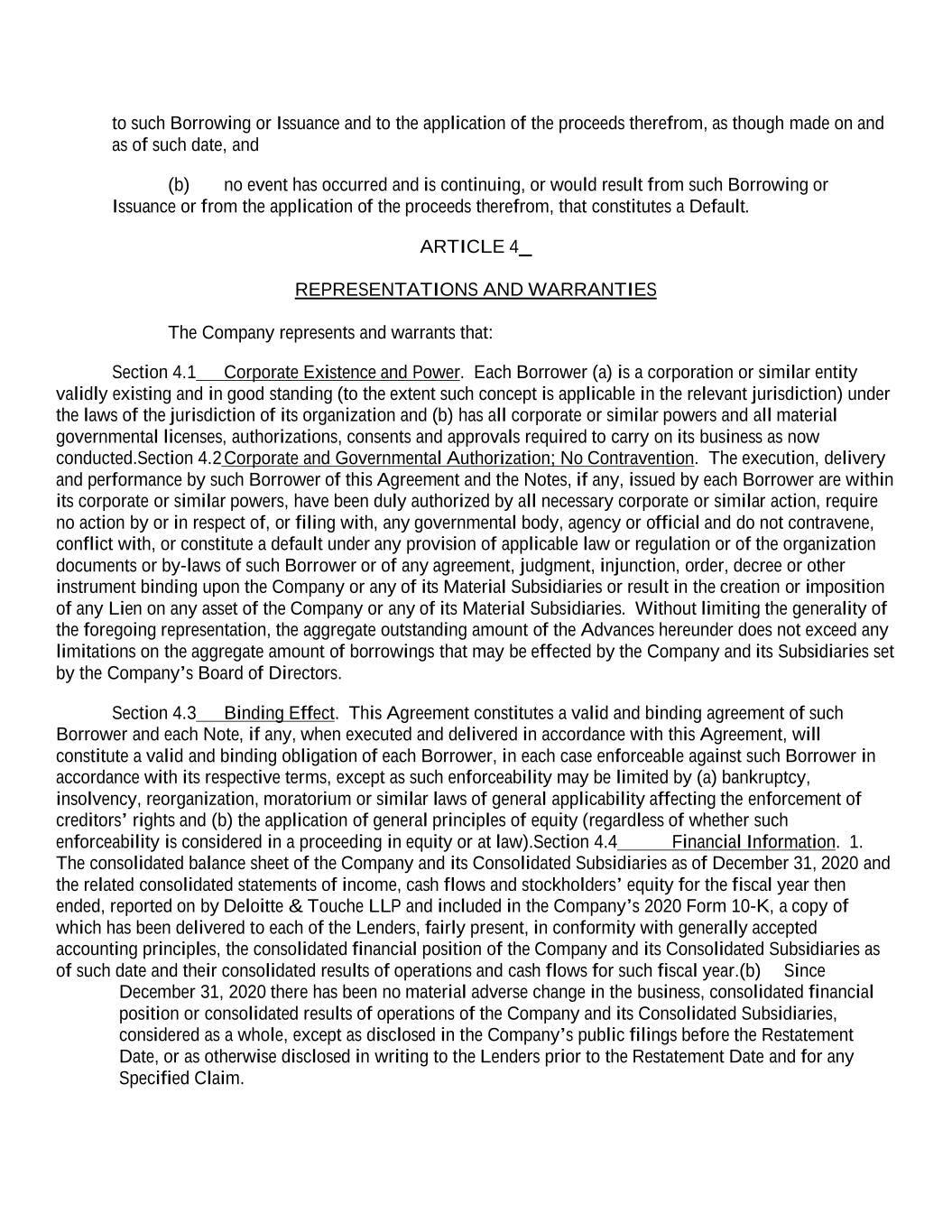 to such Borrowing or Issuance and to the application of the proceeds therefrom, as though made on and as of such date, and (b) no event has occurred and is continuing, or would result from such Borrowing or Issuance or from the application of the proceeds therefrom, that constitutes a Default. ARTICLE 4 REPRESENTATIONS AND WARRANTIES The Company represents and warrants that: Section 4.1 Corporate Existence and Power. Each Borrower (a) is a corporation or similar entity validly existing and in good standing (to the extent such concept is applicable in the relevant jurisdiction) under the laws of the jurisdiction of its organization and (b) has all corporate or similar powers and all material governmental licenses, authorizations, consents and approvals required to carry on its business as now conducted.Section 4.2 Corporate and Governmental Authorization; No Contravention. The execution, delivery and performance by such Borrower of this Agreement and the Notes, if any, issued by each Borrower are within its corporate or similar powers, have been duly authorized by all necessary corporate or similar action, require no action by or in respect of, or filing with, any governmental body, agency or official and do not contravene, conflict with, or constitute a default under any provision of applicable law or regulation or of the organization documents or by-laws of such Borrower or of any agreement, judgment, injunction, order, decree or other instrument binding upon the Company or any of its Material Subsidiaries or result in the creation or imposition of any Lien on any asset of the Company or any of its Material Subsidiaries. Without limiting the generality of the foregoing representation, the aggregate outstanding amount of the Advances hereunder does not exceed any limitations on the aggregate amount of borrowings that may be effected by the Company and its Subsidiaries set by the Company’s Board of Directors. Section 4.3 Binding Effect. This Agreement constitutes a valid and binding agreement of such Borrower and each Note, if any, when executed and delivered in accordance with this Agreement, will constitute a valid and binding obligation of each Borrower, in each case enforceable against such Borrower in accordance with its respective terms, except as such enforceability may be limited by (a) bankruptcy, insolvency, reorganization, moratorium or similar laws of general applicability affecting the enforcement of creditors’ rights and (b) the application of general principles of equity (regardless of whether such enforceability is considered in a proceeding in equity or at law).Section 4.4 Financial Information. 1. The consolidated balance sheet of the Company and its Consolidated Subsidiaries as of December 31, 2020 and the related consolidated statements of income, cash flows and stockholders’ equity for the fiscal year then ended, reported on by Deloitte & Touche LLP and included in the Company’s 2020 Form 10-K, a copy of which has been delivered to each of the Lenders, fairly present, in conformity with generally accepted accounting principles, the consolidated financial position of the Company and its Consolidated Subsidiaries as of such date and their consolidated results of operations and cash flows for such fiscal year.(b) Since December 31, 2020 there has been no material adverse change in the business, consolidated financial position or consolidated results of operations of the Company and its Consolidated Subsidiaries, considered as a whole, except as disclosed in the Company’s public filings before the Restatement Date, or as otherwise disclosed in writing to the Lenders prior to the Restatement Date and for any Specified Claim.