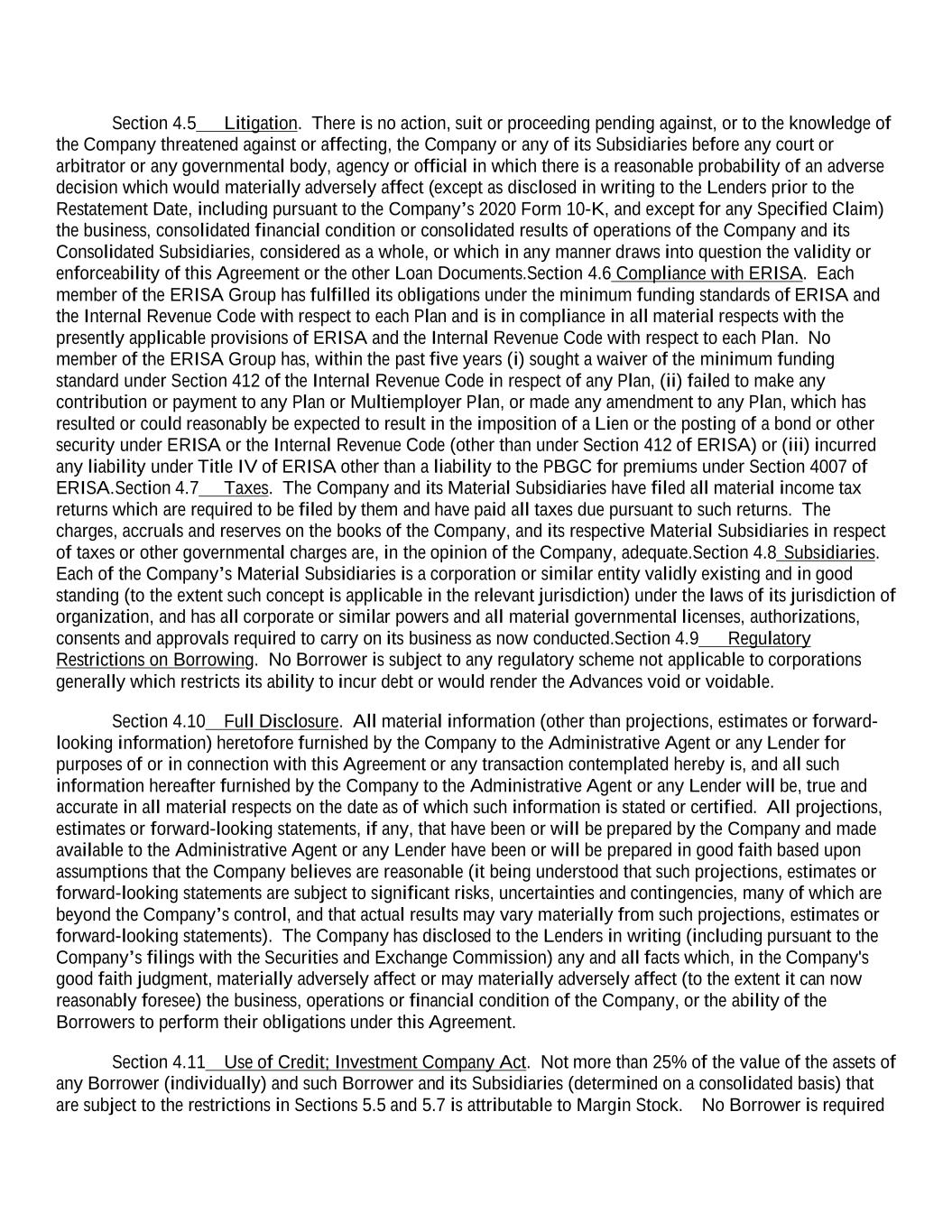 Section 4.5 Litigation. There is no action, suit or proceeding pending against, or to the knowledge of the Company threatened against or affecting, the Company or any of its Subsidiaries before any court or arbitrator or any governmental body, agency or official in which there is a reasonable probability of an adverse decision which would materially adversely affect (except as disclosed in writing to the Lenders prior to the Restatement Date, including pursuant to the Company’s 2020 Form 10-K, and except for any Specified Claim) the business, consolidated financial condition or consolidated results of operations of the Company and its Consolidated Subsidiaries, considered as a whole, or which in any manner draws into question the validity or enforceability of this Agreement or the other Loan Documents.Section 4.6 Compliance with ERISA. Each member of the ERISA Group has fulfilled its obligations under the minimum funding standards of ERISA and the Internal Revenue Code with respect to each Plan and is in compliance in all material respects with the presently applicable provisions of ERISA and the Internal Revenue Code with respect to each Plan. No member of the ERISA Group has, within the past five years (i) sought a waiver of the minimum funding standard under Section 412 of the Internal Revenue Code in respect of any Plan, (ii) failed to make any contribution or payment to any Plan or Multiemployer Plan, or made any amendment to any Plan, which has resulted or could reasonably be expected to result in the imposition of a Lien or the posting of a bond or other security under ERISA or the Internal Revenue Code (other than under Section 412 of ERISA) or (iii) incurred any liability under Title IV of ERISA other than a liability to the PBGC for premiums under Section 4007 of ERISA.Section 4.7 Taxes. The Company and its Material Subsidiaries have filed all material income tax returns which are required to be filed by them and have paid all taxes due pursuant to such returns. The charges, accruals and reserves on the books of the Company, and its respective Material Subsidiaries in respect of taxes or other governmental charges are, in the opinion of the Company, adequate.Section 4.8 Subsidiaries. Each of the Company’s Material Subsidiaries is a corporation or similar entity validly existing and in good standing (to the extent such concept is applicable in the relevant jurisdiction) under the laws of its jurisdiction of organization, and has all corporate or similar powers and all material governmental licenses, authorizations, consents and approvals required to carry on its business as now conducted.Section 4.9 Regulatory Restrictions on Borrowing. No Borrower is subject to any regulatory scheme not applicable to corporations generally which restricts its ability to incur debt or would render the Advances void or voidable. Section 4.10 Full Disclosure. All material information (other than projections, estimates or forward- looking information) heretofore furnished by the Company to the Administrative Agent or any Lender for purposes of or in connection with this Agreement or any transaction contemplated hereby is, and all such information hereafter furnished by the Company to the Administrative Agent or any Lender will be, true and accurate in all material respects on the date as of which such information is stated or certified. All projections, estimates or forward-looking statements, if any, that have been or will be prepared by the Company and made available to the Administrative Agent or any Lender have been or will be prepared in good faith based upon assumptions that the Company believes are reasonable (it being understood that such projections, estimates or forward-looking statements are subject to significant risks, uncertainties and contingencies, many of which are beyond the Company’s control, and that actual results may vary materially from such projections, estimates or forward-looking statements). The Company has disclosed to the Lenders in writing (including pursuant to the Company’s filings with the Securities and Exchange Commission) any and all facts which, in the Company's good faith judgment, materially adversely affect or may materially adversely affect (to the extent it can now reasonably foresee) the business, operations or financial condition of the Company, or the ability of the Borrowers to perform their obligations under this Agreement. Section 4.11 Use of Credit; Investment Company Act. Not more than 25% of the value of the assets of any Borrower (individually) and such Borrower and its Subsidiaries (determined on a consolidated basis) that are subject to the restrictions in Sections 5.5 and 5.7 is attributable to Margin Stock. No Borrower is required
