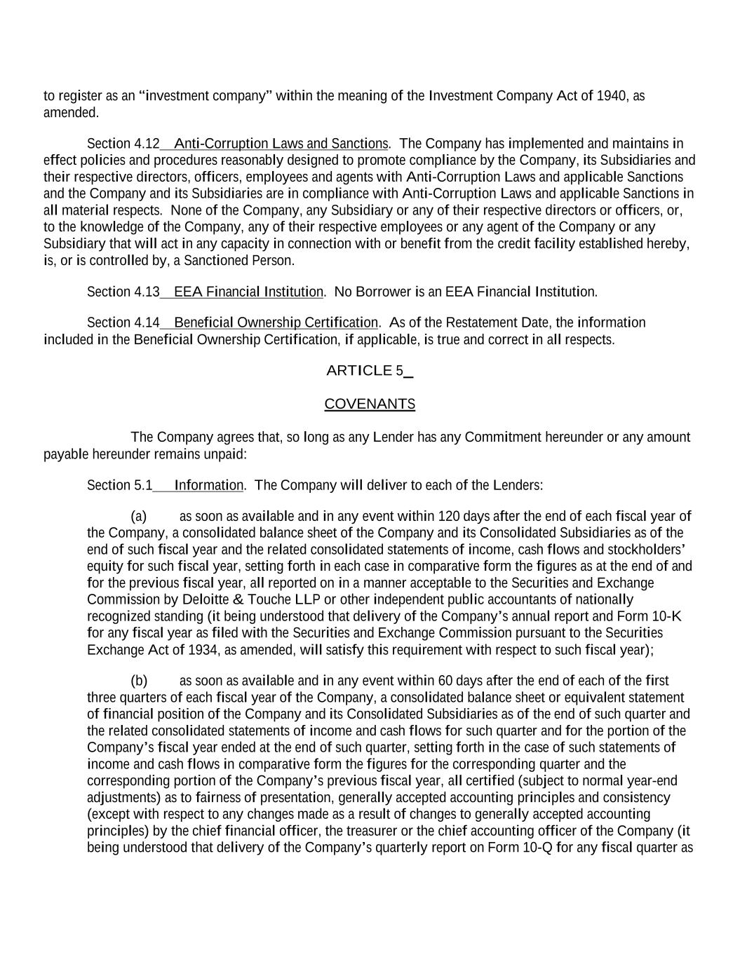 to register as an “investment company” within the meaning of the Investment Company Act of 1940, as amended. Section 4.12 Anti-Corruption Laws and Sanctions. The Company has implemented and maintains in effect policies and procedures reasonably designed to promote compliance by the Company, its Subsidiaries and their respective directors, officers, employees and agents with Anti-Corruption Laws and applicable Sanctions and the Company and its Subsidiaries are in compliance with Anti-Corruption Laws and applicable Sanctions in all material respects. None of the Company, any Subsidiary or any of their respective directors or officers, or, to the knowledge of the Company, any of their respective employees or any agent of the Company or any Subsidiary that will act in any capacity in connection with or benefit from the credit facility established hereby, is, or is controlled by, a Sanctioned Person. Section 4.13 EEA Financial Institution. No Borrower is an EEA Financial Institution. Section 4.14 Beneficial Ownership Certification. As of the Restatement Date, the information included in the Beneficial Ownership Certification, if applicable, is true and correct in all respects. ARTICLE 5 COVENANTS The Company agrees that, so long as any Lender has any Commitment hereunder or any amount payable hereunder remains unpaid: Section 5.1 Information. The Company will deliver to each of the Lenders: (a) as soon as available and in any event within 120 days after the end of each fiscal year of the Company, a consolidated balance sheet of the Company and its Consolidated Subsidiaries as of the end of such fiscal year and the related consolidated statements of income, cash flows and stockholders’ equity for such fiscal year, setting forth in each case in comparative form the figures as at the end of and for the previous fiscal year, all reported on in a manner acceptable to the Securities and Exchange Commission by Deloitte & Touche LLP or other independent public accountants of nationally recognized standing (it being understood that delivery of the Company’s annual report and Form 10-K for any fiscal year as filed with the Securities and Exchange Commission pursuant to the Securities Exchange Act of 1934, as amended, will satisfy this requirement with respect to such fiscal year); (b) as soon as available and in any event within 60 days after the end of each of the first three quarters of each fiscal year of the Company, a consolidated balance sheet or equivalent statement of financial position of the Company and its Consolidated Subsidiaries as of the end of such quarter and the related consolidated statements of income and cash flows for such quarter and for the portion of the Company’s fiscal year ended at the end of such quarter, setting forth in the case of such statements of income and cash flows in comparative form the figures for the corresponding quarter and the corresponding portion of the Company’s previous fiscal year, all certified (subject to normal year-end adjustments) as to fairness of presentation, generally accepted accounting principles and consistency (except with respect to any changes made as a result of changes to generally accepted accounting principles) by the chief financial officer, the treasurer or the chief accounting officer of the Company (it being understood that delivery of the Company’s quarterly report on Form 10-Q for any fiscal quarter as