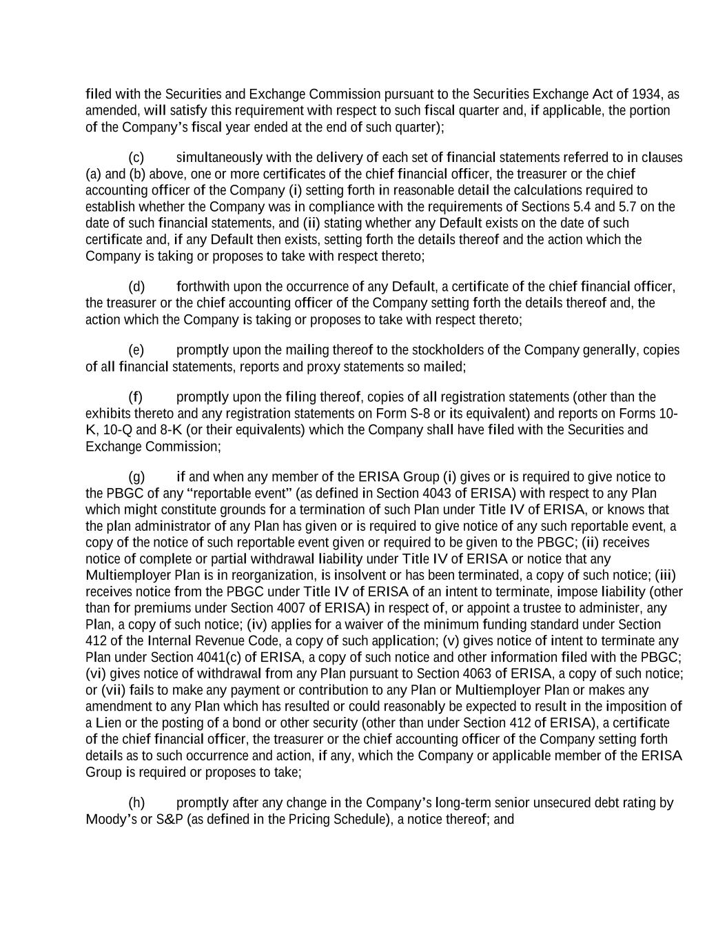 filed with the Securities and Exchange Commission pursuant to the Securities Exchange Act of 1934, as amended, will satisfy this requirement with respect to such fiscal quarter and, if applicable, the portion of the Company’s fiscal year ended at the end of such quarter); (c) simultaneously with the delivery of each set of financial statements referred to in clauses (a) and (b) above, one or more certificates of the chief financial officer, the treasurer or the chief accounting officer of the Company (i) setting forth in reasonable detail the calculations required to establish whether the Company was in compliance with the requirements of Sections 5.4 and 5.7 on the date of such financial statements, and (ii) stating whether any Default exists on the date of such certificate and, if any Default then exists, setting forth the details thereof and the action which the Company is taking or proposes to take with respect thereto; (d) forthwith upon the occurrence of any Default, a certificate of the chief financial officer, the treasurer or the chief accounting officer of the Company setting forth the details thereof and, the action which the Company is taking or proposes to take with respect thereto; (e) promptly upon the mailing thereof to the stockholders of the Company generally, copies of all financial statements, reports and proxy statements so mailed; (f) promptly upon the filing thereof, copies of all registration statements (other than the exhibits thereto and any registration statements on Form S-8 or its equivalent) and reports on Forms 10- K, 10-Q and 8-K (or their equivalents) which the Company shall have filed with the Securities and Exchange Commission; (g) if and when any member of the ERISA Group (i) gives or is required to give notice to the PBGC of any “reportable event” (as defined in Section 4043 of ERISA) with respect to any Plan which might constitute grounds for a termination of such Plan under Title IV of ERISA, or knows that the plan administrator of any Plan has given or is required to give notice of any such reportable event, a copy of the notice of such reportable event given or required to be given to the PBGC; (ii) receives notice of complete or partial withdrawal liability under Title IV of ERISA or notice that any Multiemployer Plan is in reorganization, is insolvent or has been terminated, a copy of such notice; (iii) receives notice from the PBGC under Title IV of ERISA of an intent to terminate, impose liability (other than for premiums under Section 4007 of ERISA) in respect of, or appoint a trustee to administer, any Plan, a copy of such notice; (iv) applies for a waiver of the minimum funding standard under Section 412 of the Internal Revenue Code, a copy of such application; (v) gives notice of intent to terminate any Plan under Section 4041(c) of ERISA, a copy of such notice and other information filed with the PBGC; (vi) gives notice of withdrawal from any Plan pursuant to Section 4063 of ERISA, a copy of such notice; or (vii) fails to make any payment or contribution to any Plan or Multiemployer Plan or makes any amendment to any Plan which has resulted or could reasonably be expected to result in the imposition of a Lien or the posting of a bond or other security (other than under Section 412 of ERISA), a certificate of the chief financial officer, the treasurer or the chief accounting officer of the Company setting forth details as to such occurrence and action, if any, which the Company or applicable member of the ERISA Group is required or proposes to take; (h) promptly after any change in the Company’s long-term senior unsecured debt rating by Moody’s or S&P (as defined in the Pricing Schedule), a notice thereof; and