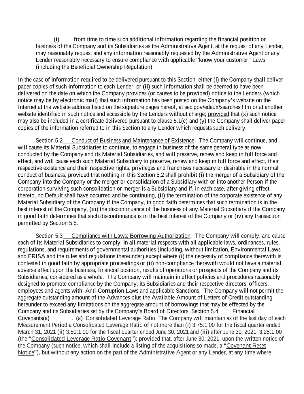(i) from time to time such additional information regarding the financial position or business of the Company and its Subsidiaries as the Administrative Agent, at the request of any Lender, may reasonably request and any information reasonably requested by the Administrative Agent or any Lender reasonably necessary to ensure compliance with applicable “know your customer” Laws (including the Beneficial Ownership Regulation). In the case of information required to be delivered pursuant to this Section, either (i) the Company shall deliver paper copies of such information to each Lender, or (ii) such information shall be deemed to have been delivered on the date on which the Company provides (or causes to be provided) notice to the Lenders (which notice may be by electronic mail) that such information has been posted on the Company’s website on the Internet at the website address listed on the signature pages hereof, at sec.gov/edaux/searches.htm or at another website identified in such notice and accessible by the Lenders without charge; provided that (x) such notice may also be included in a certificate delivered pursuant to clause 5.1(c) and (y) the Company shall deliver paper copies of the information referred to in this Section to any Lender which requests such delivery. Section 5.2 Conduct of Business and Maintenance of Existence. The Company will continue, and will cause its Material Subsidiaries to continue, to engage in business of the same general type as now conducted by the Company and its Material Subsidiaries, and will preserve, renew and keep in full force and effect, and will cause each such Material Subsidiary to preserve, renew and keep in full force and effect, their respective existence and their respective rights, privileges and franchises necessary or desirable in the normal conduct of business; provided that nothing in this Section 5.2 shall prohibit (i) the merger of a Subsidiary of the Company into the Company or the merger or consolidation of a Subsidiary with or into another Person if the corporation surviving such consolidation or merger is a Subsidiary and if, in each case, after giving effect thereto, no Default shall have occurred and be continuing, (ii) the termination of the corporate existence of any Material Subsidiary of the Company if the Company, in good faith determines that such termination is in the best interest of the Company, (iii) the discontinuance of the business of any Material Subsidiary if the Company in good faith determines that such discontinuance is in the best interest of the Company or (iv) any transaction permitted by Section 5.5. Section 5.3 Compliance with Laws; Borrowing Authorization. The Company will comply, and cause each of its Material Subsidiaries to comply, in all material respects with all applicable laws, ordinances, rules, regulations, and requirements of governmental authorities (including, without limitation, Environmental Laws and ERISA and the rules and regulations thereunder) except where (i) the necessity of compliance therewith is contested in good faith by appropriate proceedings or (ii) non-compliance therewith would not have a material adverse effect upon the business, financial position, results of operations or prospects of the Company and its Subsidiaries, considered as a whole. The Company will maintain in effect policies and procedures reasonably designed to promote compliance by the Company, its Subsidiaries and their respective directors, officers, employees and agents with Anti-Corruption Laws and applicable Sanctions. The Company will not permit the aggregate outstanding amount of the Advances plus the Available Amount of Letters of Credit outstanding hereunder to exceed any limitations on the aggregate amount of borrowings that may be effected by the Company and its Subsidiaries set by the Company’s Board of Directors. Section 5.4 Financial Covenants(a) . (a) Consolidated Leverage Ratio. The Company will maintain as of the last day of each Measurement Period a Consolidated Leverage Ratio of not more than (i) 3.75:1.00 for the fiscal quarter ended March 31, 2021 (ii) 3.50:1.00 for the fiscal quarter ended June 30, 2021 and (iii) after June 30, 2021, 3.25:1.00 (the “Consolidated Leverage Ratio Covenant”); provided that, after June 30, 2021, upon the written notice of the Company (such notice, which shall include a listing of the acquisitions so made, a “Covenant Reset Notice”), but without any action on the part of the Administrative Agent or any Lender, at any time where