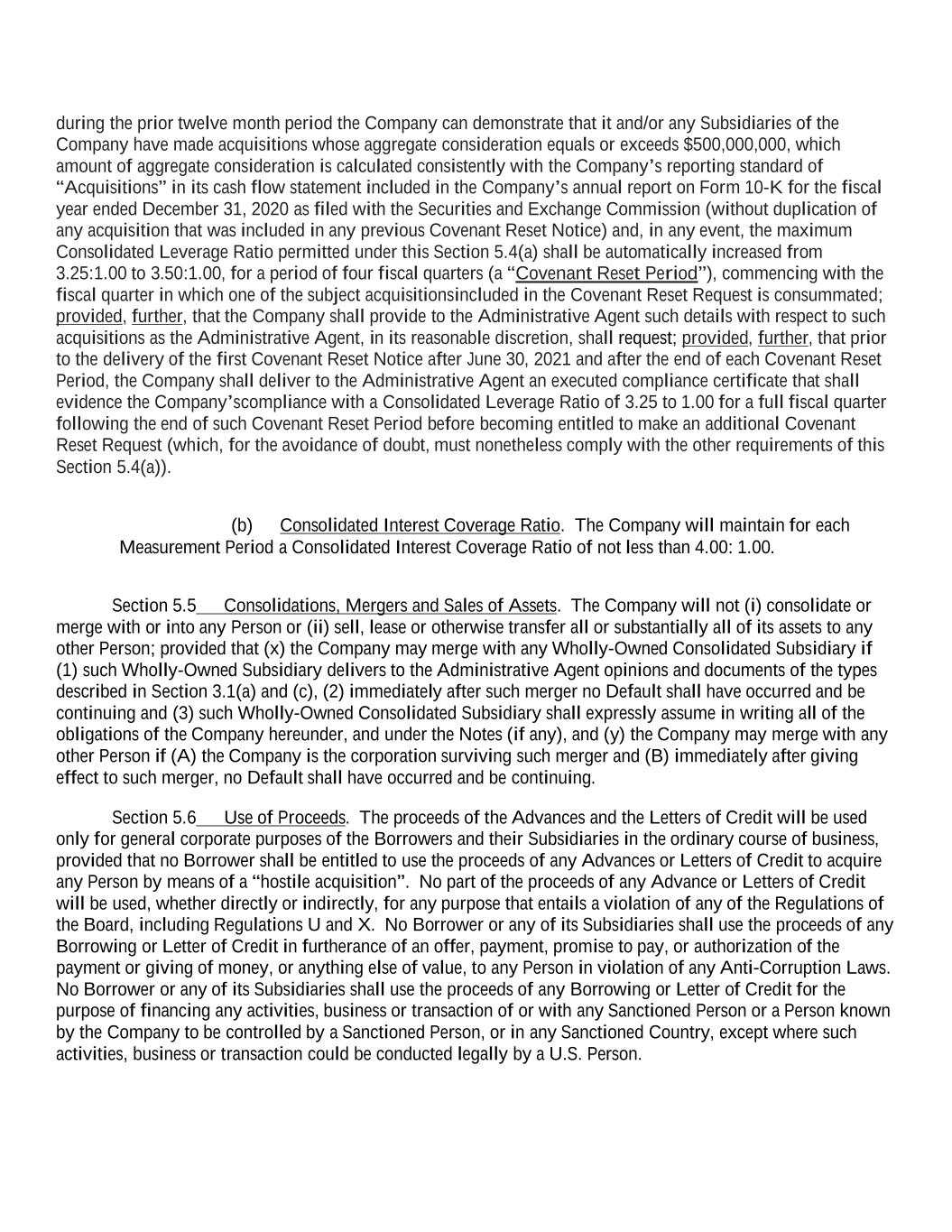 during the prior twelve month period the Company can demonstrate that it and/or any Subsidiaries of the Company have made acquisitions whose aggregate consideration equals or exceeds $500,000,000, which amount of aggregate consideration is calculated consistently with the Company’s reporting standard of “Acquisitions” in its cash flow statement included in the Company’s annual report on Form 10-K for the fiscal year ended December 31, 2020 as filed with the Securities and Exchange Commission (without duplication of any acquisition that was included in any previous Covenant Reset Notice) and, in any event, the maximum Consolidated Leverage Ratio permitted under this Section 5.4(a) shall be automatically increased from 3.25:1.00 to 3.50:1.00, for a period of four fiscal quarters (a “Covenant Reset Period”), commencing with the fiscal quarter in which one of the subject acquisitions included in the Covenant Reset Request is consummated; provided, further, that the Company shall provide to the Administrative Agent such details with respect to such acquisitions as the Administrative Agent, in its reasonable discretion, shall request; provided, further, that prior to the delivery of the first Covenant Reset Notice after June 30, 2021 and after the end of each Covenant Reset Period, the Company shall deliver to the Administrative Agent an executed compliance certificate that shall evidence the Company’s compliance with a Consolidated Leverage Ratio of 3.25 to 1.00 for a full fiscal quarter following the end of such Covenant Reset Period before becoming entitled to make an additional Covenant Reset Request (which, for the avoidance of doubt, must nonetheless comply with the other requirements of this Section 5.4(a)). (b) Consolidated Interest Coverage Ratio. The Company will maintain for each Measurement Period a Consolidated Interest Coverage Ratio of not less than 4.00: 1.00. Section 5.5 Consolidations, Mergers and Sales of Assets. The Company will not (i) consolidate or merge with or into any Person or (ii) sell, lease or otherwise transfer all or substantially all of its assets to any other Person; provided that (x) the Company may merge with any Wholly-Owned Consolidated Subsidiary if (1) such Wholly-Owned Subsidiary delivers to the Administrative Agent opinions and documents of the types described in Section 3.1(a) and (c), (2) immediately after such merger no Default shall have occurred and be continuing and (3) such Wholly-Owned Consolidated Subsidiary shall expressly assume in writing all of the obligations of the Company hereunder, and under the Notes (if any), and (y) the Company may merge with any other Person if (A) the Company is the corporation surviving such merger and (B) immediately after giving effect to such merger, no Default shall have occurred and be continuing. Section 5.6 Use of Proceeds. The proceeds of the Advances and the Letters of Credit will be used only for general corporate purposes of the Borrowers and their Subsidiaries in the ordinary course of business, provided that no Borrower shall be entitled to use the proceeds of any Advances or Letters of Credit to acquire any Person by means of a “hostile acquisition”. No part of the proceeds of any Advance or Letters of Credit will be used, whether directly or indirectly, for any purpose that entails a violation of any of the Regulations of the Board, including Regulations U and X. No Borrower or any of its Subsidiaries shall use the proceeds of any Borrowing or Letter of Credit in furtherance of an offer, payment, promise to pay, or authorization of the payment or giving of money, or anything else of value, to any Person in violation of any Anti-Corruption Laws. No Borrower or any of its Subsidiaries shall use the proceeds of any Borrowing or Letter of Credit for the purpose of financing any activities, business or transaction of or with any Sanctioned Person or a Person known by the Company to be controlled by a Sanctioned Person, or in any Sanctioned Country, except where such activities, business or transaction could be conducted legally by a U.S. Person.
