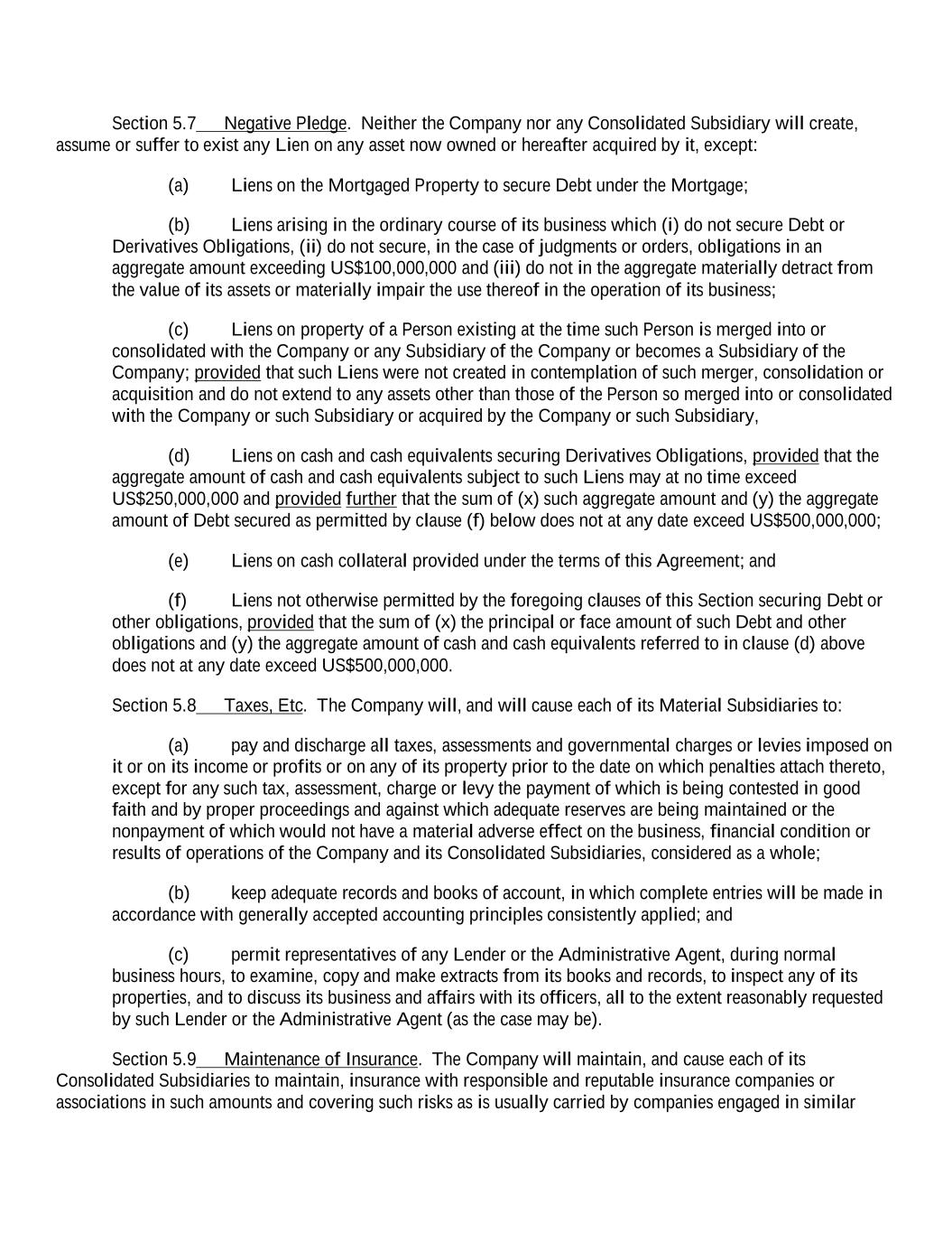 Section 5.7 Negative Pledge. Neither the Company nor any Consolidated Subsidiary will create, assume or suffer to exist any Lien on any asset now owned or hereafter acquired by it, except: (a) Liens on the Mortgaged Property to secure Debt under the Mortgage; (b) Liens arising in the ordinary course of its business which (i) do not secure Debt or Derivatives Obligations, (ii) do not secure, in the case of judgments or orders, obligations in an aggregate amount exceeding US$100,000,000 and (iii) do not in the aggregate materially detract from the value of its assets or materially impair the use thereof in the operation of its business; (c) Liens on property of a Person existing at the time such Person is merged into or consolidated with the Company or any Subsidiary of the Company or becomes a Subsidiary of the Company; provided that such Liens were not created in contemplation of such merger, consolidation or acquisition and do not extend to any assets other than those of the Person so merged into or consolidated with the Company or such Subsidiary or acquired by the Company or such Subsidiary, (d) Liens on cash and cash equivalents securing Derivatives Obligations, provided that the aggregate amount of cash and cash equivalents subject to such Liens may at no time exceed US$250,000,000 and provided further that the sum of (x) such aggregate amount and (y) the aggregate amount of Debt secured as permitted by clause (f) below does not at any date exceed US$500,000,000; (e) Liens on cash collateral provided under the terms of this Agreement; and (f) Liens not otherwise permitted by the foregoing clauses of this Section securing Debt or other obligations, provided that the sum of (x) the principal or face amount of such Debt and other obligations and (y) the aggregate amount of cash and cash equivalents referred to in clause (d) above does not at any date exceed US$500,000,000. Section 5.8 Taxes, Etc. The Company will, and will cause each of its Material Subsidiaries to: (a) pay and discharge all taxes, assessments and governmental charges or levies imposed on it or on its income or profits or on any of its property prior to the date on which penalties attach thereto, except for any such tax, assessment, charge or levy the payment of which is being contested in good faith and by proper proceedings and against which adequate reserves are being maintained or the nonpayment of which would not have a material adverse effect on the business, financial condition or results of operations of the Company and its Consolidated Subsidiaries, considered as a whole; (b) keep adequate records and books of account, in which complete entries will be made in accordance with generally accepted accounting principles consistently applied; and (c) permit representatives of any Lender or the Administrative Agent, during normal business hours, to examine, copy and make extracts from its books and records, to inspect any of its properties, and to discuss its business and affairs with its officers, all to the extent reasonably requested by such Lender or the Administrative Agent (as the case may be). Section 5.9 Maintenance of Insurance. The Company will maintain, and cause each of its Consolidated Subsidiaries to maintain, insurance with responsible and reputable insurance companies or associations in such amounts and covering such risks as is usually carried by companies engaged in similar