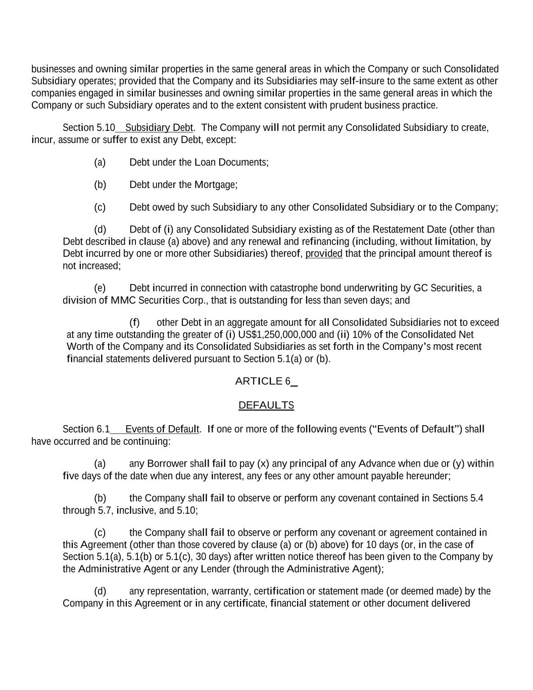businesses and owning similar properties in the same general areas in which the Company or such Consolidated Subsidiary operates; provided that the Company and its Subsidiaries may self-insure to the same extent as other companies engaged in similar businesses and owning similar properties in the same general areas in which the Company or such Subsidiary operates and to the extent consistent with prudent business practice. Section 5.10 Subsidiary Debt. The Company will not permit any Consolidated Subsidiary to create, incur, assume or suffer to exist any Debt, except: (a) Debt under the Loan Documents; (b) Debt under the Mortgage; (c) Debt owed by such Subsidiary to any other Consolidated Subsidiary or to the Company; (d) Debt of (i) any Consolidated Subsidiary existing as of the Restatement Date (other than Debt described in clause (a) above) and any renewal and refinancing (including, without limitation, by Debt incurred by one or more other Subsidiaries) thereof, provided that the principal amount thereof is not increased; (e) Debt incurred in connection with catastrophe bond underwriting by GC Securities, a division of MMC Securities Corp., that is outstanding for less than seven days; and (f) other Debt in an aggregate amount for all Consolidated Subsidiaries not to exceed at any time outstanding the greater of (i) US$1,250,000,000 and (ii) 10% of the Consolidated Net Worth of the Company and its Consolidated Subsidiaries as set forth in the Company’s most recent financial statements delivered pursuant to Section 5.1(a) or (b). ARTICLE 6 DEFAULTS Section 6.1 Events of Default. If one or more of the following events (“Events of Default”) shall have occurred and be continuing: (a) any Borrower shall fail to pay (x) any principal of any Advance when due or (y) within five days of the date when due any interest, any fees or any other amount payable hereunder; (b) the Company shall fail to observe or perform any covenant contained in Sections 5.4 through 5.7, inclusive, and 5.10; (c) the Company shall fail to observe or perform any covenant or agreement contained in this Agreement (other than those covered by clause (a) or (b) above) for 10 days (or, in the case of Section 5.1(a), 5.1(b) or 5.1(c), 30 days) after written notice thereof has been given to the Company by the Administrative Agent or any Lender (through the Administrative Agent); (d) any representation, warranty, certification or statement made (or deemed made) by the Company in this Agreement or in any certificate, financial statement or other document delivered