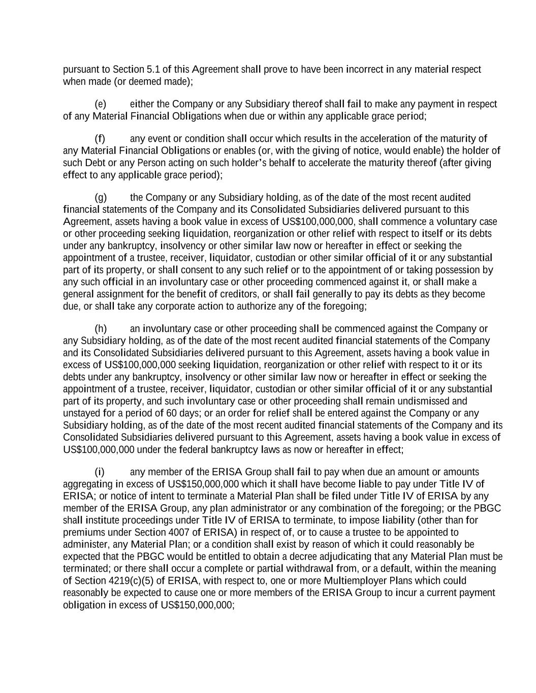 pursuant to Section 5.1 of this Agreement shall prove to have been incorrect in any material respect when made (or deemed made); (e) either the Company or any Subsidiary thereof shall fail to make any payment in respect of any Material Financial Obligations when due or within any applicable grace period; (f) any event or condition shall occur which results in the acceleration of the maturity of any Material Financial Obligations or enables (or, with the giving of notice, would enable) the holder of such Debt or any Person acting on such holder’s behalf to accelerate the maturity thereof (after giving effect to any applicable grace period); (g) the Company or any Subsidiary holding, as of the date of the most recent audited financial statements of the Company and its Consolidated Subsidiaries delivered pursuant to this Agreement, assets having a book value in excess of US$100,000,000, shall commence a voluntary case or other proceeding seeking liquidation, reorganization or other relief with respect to itself or its debts under any bankruptcy, insolvency or other similar law now or hereafter in effect or seeking the appointment of a trustee, receiver, liquidator, custodian or other similar official of it or any substantial part of its property, or shall consent to any such relief or to the appointment of or taking possession by any such official in an involuntary case or other proceeding commenced against it, or shall make a general assignment for the benefit of creditors, or shall fail generally to pay its debts as they become due, or shall take any corporate action to authorize any of the foregoing; (h) an involuntary case or other proceeding shall be commenced against the Company or any Subsidiary holding, as of the date of the most recent audited financial statements of the Company and its Consolidated Subsidiaries delivered pursuant to this Agreement, assets having a book value in excess of US$100,000,000 seeking liquidation, reorganization or other relief with respect to it or its debts under any bankruptcy, insolvency or other similar law now or hereafter in effect or seeking the appointment of a trustee, receiver, liquidator, custodian or other similar official of it or any substantial part of its property, and such involuntary case or other proceeding shall remain undismissed and unstayed for a period of 60 days; or an order for relief shall be entered against the Company or any Subsidiary holding, as of the date of the most recent audited financial statements of the Company and its Consolidated Subsidiaries delivered pursuant to this Agreement, assets having a book value in excess of US$100,000,000 under the federal bankruptcy laws as now or hereafter in effect; (i) any member of the ERISA Group shall fail to pay when due an amount or amounts aggregating in excess of US$150,000,000 which it shall have become liable to pay under Title IV of ERISA; or notice of intent to terminate a Material Plan shall be filed under Title IV of ERISA by any member of the ERISA Group, any plan administrator or any combination of the foregoing; or the PBGC shall institute proceedings under Title IV of ERISA to terminate, to impose liability (other than for premiums under Section 4007 of ERISA) in respect of, or to cause a trustee to be appointed to administer, any Material Plan; or a condition shall exist by reason of which it could reasonably be expected that the PBGC would be entitled to obtain a decree adjudicating that any Material Plan must be terminated; or there shall occur a complete or partial withdrawal from, or a default, within the meaning of Section 4219(c)(5) of ERISA, with respect to, one or more Multiemployer Plans which could reasonably be expected to cause one or more members of the ERISA Group to incur a current payment obligation in excess of US$150,000,000;