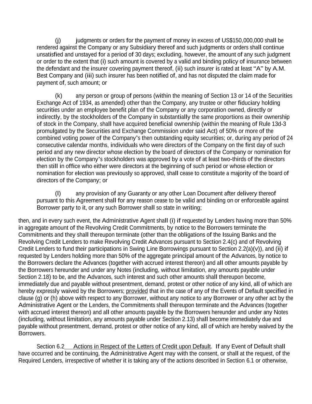 (j) judgments or orders for the payment of money in excess of US$150,000,000 shall be rendered against the Company or any Subsidiary thereof and such judgments or orders shall continue unsatisfied and unstayed for a period of 30 days; excluding, however, the amount of any such judgment or order to the extent that (i) such amount is covered by a valid and binding policy of insurance between the defendant and the insurer covering payment thereof, (ii) such insurer is rated at least “A” by A.M. Best Company and (iii) such insurer has been notified of, and has not disputed the claim made for payment of, such amount; or (k) any person or group of persons (within the meaning of Section 13 or 14 of the Securities Exchange Act of 1934, as amended) other than the Company, any trustee or other fiduciary holding securities under an employee benefit plan of the Company or any corporation owned, directly or indirectly, by the stockholders of the Company in substantially the same proportions as their ownership of stock in the Company, shall have acquired beneficial ownership (within the meaning of Rule 13d-3 promulgated by the Securities and Exchange Commission under said Act) of 50% or more of the combined voting power of the Company’s then outstanding equity securities; or, during any period of 24 consecutive calendar months, individuals who were directors of the Company on the first day of such period and any new director whose election by the board of directors of the Company or nomination for election by the Company’s stockholders was approved by a vote of at least two-thirds of the directors then still in office who either were directors at the beginning of such period or whose election or nomination for election was previously so approved, shall cease to constitute a majority of the board of directors of the Company; or (l) any provision of any Guaranty or any other Loan Document after delivery thereof pursuant to this Agreement shall for any reason cease to be valid and binding on or enforceable against Borrower party to it, or any such Borrower shall so state in writing; then, and in every such event, the Administrative Agent shall (i) if requested by Lenders having more than 50% in aggregate amount of the Revolving Credit Commitments, by notice to the Borrowers terminate the Commitments and they shall thereupon terminate (other than the obligations of the Issuing Banks and the Revolving Credit Lenders to make Revolving Credit Advances pursuant to Section 2.4(c) and of Revolving Credit Lenders to fund their participations in Swing Line Borrowings pursuant to Section 2.2(a)(v)), and (ii) if requested by Lenders holding more than 50% of the aggregate principal amount of the Advances, by notice to the Borrowers declare the Advances (together with accrued interest thereon) and all other amounts payable by the Borrowers hereunder and under any Notes (including, without limitation, any amounts payable under Section 2.18) to be, and the Advances, such interest and such other amounts shall thereupon become, immediately due and payable without presentment, demand, protest or other notice of any kind, all of which are hereby expressly waived by the Borrowers; provided that in the case of any of the Events of Default specified in clause (g) or (h) above with respect to any Borrower, without any notice to any Borrower or any other act by the Administrative Agent or the Lenders, the Commitments shall thereupon terminate and the Advances (together with accrued interest thereon) and all other amounts payable by the Borrowers hereunder and under any Notes (including, without limitation, any amounts payable under Section 2.13) shall become immediately due and payable without presentment, demand, protest or other notice of any kind, all of which are hereby waived by the Borrowers. Section 6.2 Actions in Respect of the Letters of Credit upon Default. If any Event of Default shall have occurred and be continuing, the Administrative Agent may with the consent, or shall at the request, of the Required Lenders, irrespective of whether it is taking any of the actions described in Section 6.1 or otherwise,