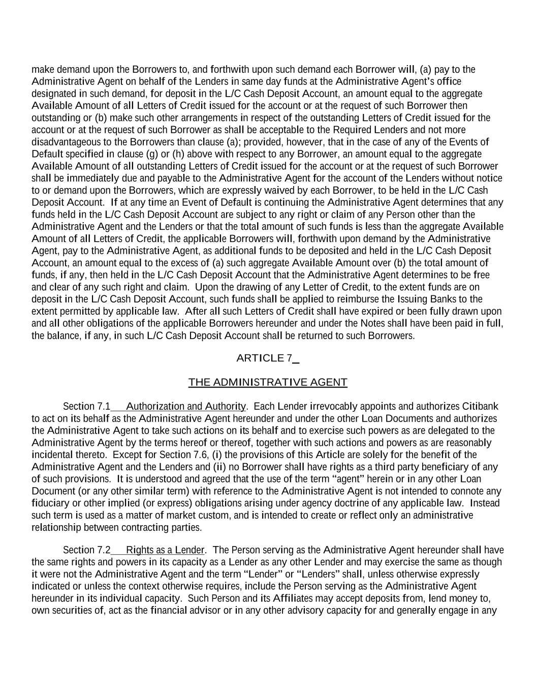 make demand upon the Borrowers to, and forthwith upon such demand each Borrower will, (a) pay to the Administrative Agent on behalf of the Lenders in same day funds at the Administrative Agent’s office designated in such demand, for deposit in the L/C Cash Deposit Account, an amount equal to the aggregate Available Amount of all Letters of Credit issued for the account or at the request of such Borrower then outstanding or (b) make such other arrangements in respect of the outstanding Letters of Credit issued for the account or at the request of such Borrower as shall be acceptable to the Required Lenders and not more disadvantageous to the Borrowers than clause (a); provided, however, that in the case of any of the Events of Default specified in clause (g) or (h) above with respect to any Borrower, an amount equal to the aggregate Available Amount of all outstanding Letters of Credit issued for the account or at the request of such Borrower shall be immediately due and payable to the Administrative Agent for the account of the Lenders without notice to or demand upon the Borrowers, which are expressly waived by each Borrower, to be held in the L/C Cash Deposit Account. If at any time an Event of Default is continuing the Administrative Agent determines that any funds held in the L/C Cash Deposit Account are subject to any right or claim of any Person other than the Administrative Agent and the Lenders or that the total amount of such funds is less than the aggregate Available Amount of all Letters of Credit, the applicable Borrowers will, forthwith upon demand by the Administrative Agent, pay to the Administrative Agent, as additional funds to be deposited and held in the L/C Cash Deposit Account, an amount equal to the excess of (a) such aggregate Available Amount over (b) the total amount of funds, if any, then held in the L/C Cash Deposit Account that the Administrative Agent determines to be free and clear of any such right and claim. Upon the drawing of any Letter of Credit, to the extent funds are on deposit in the L/C Cash Deposit Account, such funds shall be applied to reimburse the Issuing Banks to the extent permitted by applicable law. After all such Letters of Credit shall have expired or been fully drawn upon and all other obligations of the applicable Borrowers hereunder and under the Notes shall have been paid in full, the balance, if any, in such L/C Cash Deposit Account shall be returned to such Borrowers. ARTICLE 7 THE ADMINISTRATIVE AGENT Section 7.1 Authorization and Authority. Each Lender irrevocably appoints and authorizes Citibank to act on its behalf as the Administrative Agent hereunder and under the other Loan Documents and authorizes the Administrative Agent to take such actions on its behalf and to exercise such powers as are delegated to the Administrative Agent by the terms hereof or thereof, together with such actions and powers as are reasonably incidental thereto. Except for Section 7.6, (i) the provisions of this Article are solely for the benefit of the Administrative Agent and the Lenders and (ii) no Borrower shall have rights as a third party beneficiary of any of such provisions. It is understood and agreed that the use of the term “agent” herein or in any other Loan Document (or any other similar term) with reference to the Administrative Agent is not intended to connote any fiduciary or other implied (or express) obligations arising under agency doctrine of any applicable law. Instead such term is used as a matter of market custom, and is intended to create or reflect only an administrative relationship between contracting parties. Section 7.2 Rights as a Lender. The Person serving as the Administrative Agent hereunder shall have the same rights and powers in its capacity as a Lender as any other Lender and may exercise the same as though it were not the Administrative Agent and the term “Lender” or “Lenders” shall, unless otherwise expressly indicated or unless the context otherwise requires, include the Person serving as the Administrative Agent hereunder in its individual capacity. Such Person and its Affiliates may accept deposits from, lend money to, own securities of, act as the financial advisor or in any other advisory capacity for and generally engage in any