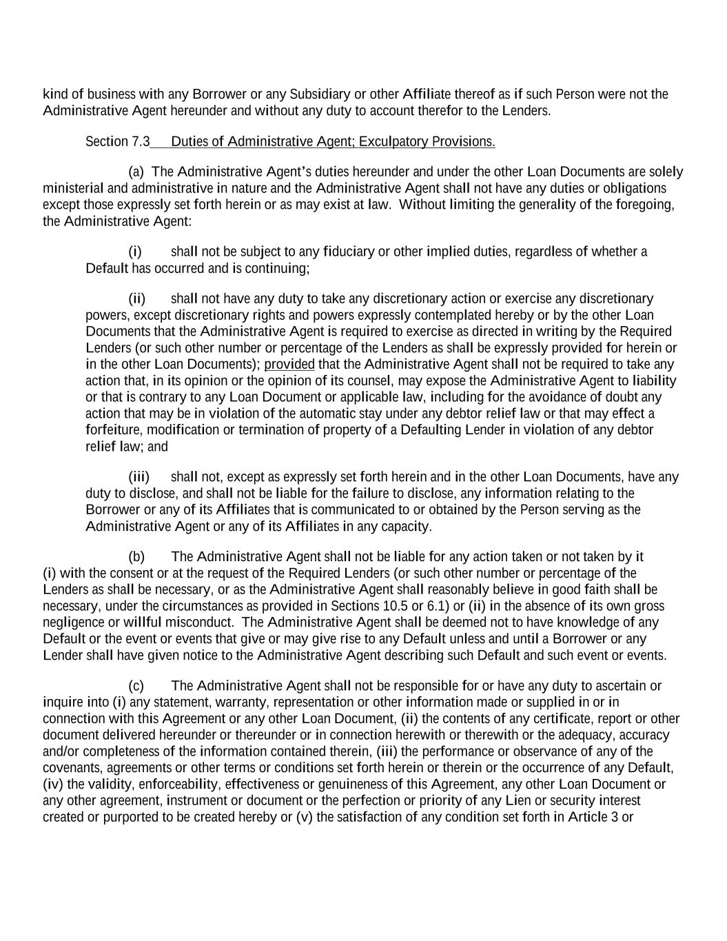 kind of business with any Borrower or any Subsidiary or other Affiliate thereof as if such Person were not the Administrative Agent hereunder and without any duty to account therefor to the Lenders. Section 7.3 Duties of Administrative Agent; Exculpatory Provisions. (a) The Administrative Agent’s duties hereunder and under the other Loan Documents are solely ministerial and administrative in nature and the Administrative Agent shall not have any duties or obligations except those expressly set forth herein or as may exist at law. Without limiting the generality of the foregoing, the Administrative Agent: (i) shall not be subject to any fiduciary or other implied duties, regardless of whether a Default has occurred and is continuing; (ii) shall not have any duty to take any discretionary action or exercise any discretionary powers, except discretionary rights and powers expressly contemplated hereby or by the other Loan Documents that the Administrative Agent is required to exercise as directed in writing by the Required Lenders (or such other number or percentage of the Lenders as shall be expressly provided for herein or in the other Loan Documents); provided that the Administrative Agent shall not be required to take any action that, in its opinion or the opinion of its counsel, may expose the Administrative Agent to liability or that is contrary to any Loan Document or applicable law, including for the avoidance of doubt any action that may be in violation of the automatic stay under any debtor relief law or that may effect a forfeiture, modification or termination of property of a Defaulting Lender in violation of any debtor relief law; and (iii) shall not, except as expressly set forth herein and in the other Loan Documents, have any duty to disclose, and shall not be liable for the failure to disclose, any information relating to the Borrower or any of its Affiliates that is communicated to or obtained by the Person serving as the Administrative Agent or any of its Affiliates in any capacity. (b) The Administrative Agent shall not be liable for any action taken or not taken by it (i) with the consent or at the request of the Required Lenders (or such other number or percentage of the Lenders as shall be necessary, or as the Administrative Agent shall reasonably believe in good faith shall be necessary, under the circumstances as provided in Sections 10.5 or 6.1) or (ii) in the absence of its own gross negligence or willful misconduct. The Administrative Agent shall be deemed not to have knowledge of any Default or the event or events that give or may give rise to any Default unless and until a Borrower or any Lender shall have given notice to the Administrative Agent describing such Default and such event or events. (c) The Administrative Agent shall not be responsible for or have any duty to ascertain or inquire into (i) any statement, warranty, representation or other information made or supplied in or in connection with this Agreement or any other Loan Document, (ii) the contents of any certificate, report or other document delivered hereunder or thereunder or in connection herewith or therewith or the adequacy, accuracy and/or completeness of the information contained therein, (iii) the performance or observance of any of the covenants, agreements or other terms or conditions set forth herein or therein or the occurrence of any Default, (iv) the validity, enforceability, effectiveness or genuineness of this Agreement, any other Loan Document or any other agreement, instrument or document or the perfection or priority of any Lien or security interest created or purported to be created hereby or (v) the satisfaction of any condition set forth in Article 3 or