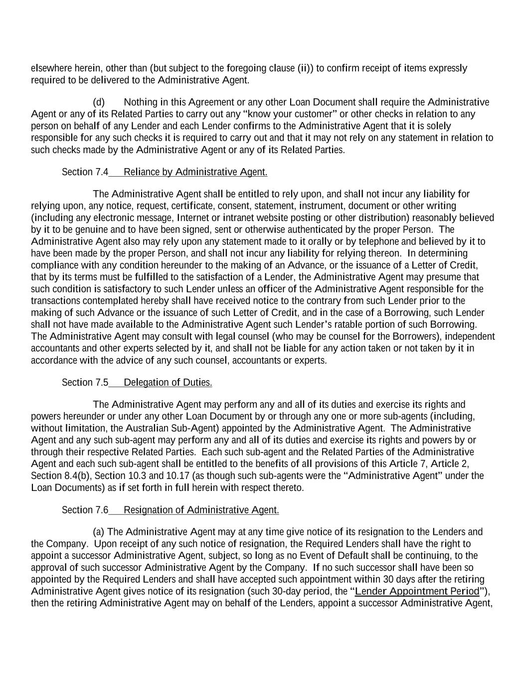 elsewhere herein, other than (but subject to the foregoing clause (ii)) to confirm receipt of items expressly required to be delivered to the Administrative Agent. (d) Nothing in this Agreement or any other Loan Document shall require the Administrative Agent or any of its Related Parties to carry out any “know your customer” or other checks in relation to any person on behalf of any Lender and each Lender confirms to the Administrative Agent that it is solely responsible for any such checks it is required to carry out and that it may not rely on any statement in relation to such checks made by the Administrative Agent or any of its Related Parties. Section 7.4 Reliance by Administrative Agent. The Administrative Agent shall be entitled to rely upon, and shall not incur any liability for relying upon, any notice, request, certificate, consent, statement, instrument, document or other writing (including any electronic message, Internet or intranet website posting or other distribution) reasonably believed by it to be genuine and to have been signed, sent or otherwise authenticated by the proper Person. The Administrative Agent also may rely upon any statement made to it orally or by telephone and believed by it to have been made by the proper Person, and shall not incur any liability for relying thereon. In determining compliance with any condition hereunder to the making of an Advance, or the issuance of a Letter of Credit, that by its terms must be fulfilled to the satisfaction of a Lender, the Administrative Agent may presume that such condition is satisfactory to such Lender unless an officer of the Administrative Agent responsible for the transactions contemplated hereby shall have received notice to the contrary from such Lender prior to the making of such Advance or the issuance of such Letter of Credit, and in the case of a Borrowing, such Lender shall not have made available to the Administrative Agent such Lender’s ratable portion of such Borrowing. The Administrative Agent may consult with legal counsel (who may be counsel for the Borrowers), independent accountants and other experts selected by it, and shall not be liable for any action taken or not taken by it in accordance with the advice of any such counsel, accountants or experts. Section 7.5 Delegation of Duties. The Administrative Agent may perform any and all of its duties and exercise its rights and powers hereunder or under any other Loan Document by or through any one or more sub-agents (including, without limitation, the Australian Sub-Agent) appointed by the Administrative Agent. The Administrative Agent and any such sub-agent may perform any and all of its duties and exercise its rights and powers by or through their respective Related Parties. Each such sub-agent and the Related Parties of the Administrative Agent and each such sub-agent shall be entitled to the benefits of all provisions of this Article 7, Article 2, Section 8.4(b), Section 10.3 and 10.17 (as though such sub-agents were the “Administrative Agent” under the Loan Documents) as if set forth in full herein with respect thereto. Section 7.6 Resignation of Administrative Agent. (a) The Administrative Agent may at any time give notice of its resignation to the Lenders and the Company. Upon receipt of any such notice of resignation, the Required Lenders shall have the right to appoint a successor Administrative Agent, subject, so long as no Event of Default shall be continuing, to the approval of such successor Administrative Agent by the Company. If no such successor shall have been so appointed by the Required Lenders and shall have accepted such appointment within 30 days after the retiring Administrative Agent gives notice of its resignation (such 30-day period, the “Lender Appointment Period”), then the retiring Administrative Agent may on behalf of the Lenders, appoint a successor Administrative Agent,