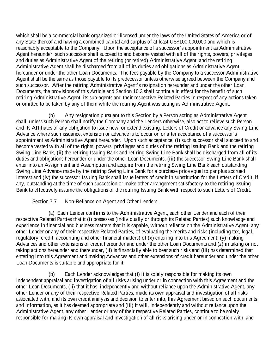 which shall be a commercial bank organized or licensed under the laws of the United States of America or of any State thereof and having a combined capital and surplus of at least US$100,000,000 and which is reasonably acceptable to the Company. Upon the acceptance of a successor’s appointment as Administrative Agent hereunder, such successor shall succeed to and become vested with all of the rights, powers, privileges and duties as Administrative Agent of the retiring (or retired) Administrative Agent, and the retiring Administrative Agent shall be discharged from all of its duties and obligations as Administrative Agent hereunder or under the other Loan Documents. The fees payable by the Company to a successor Administrative Agent shall be the same as those payable to its predecessor unless otherwise agreed between the Company and such successor. After the retiring Administrative Agent’s resignation hereunder and under the other Loan Documents, the provisions of this Article and Section 10.3 shall continue in effect for the benefit of such retiring Administrative Agent, its sub-agents and their respective Related Parties in respect of any actions taken or omitted to be taken by any of them while the retiring Agent was acting as Administrative Agent. (b) Any resignation pursuant to this Section by a Person acting as Administrative Agent shall, unless such Person shall notify the Company and the Lenders otherwise, also act to relieve such Person and its Affiliates of any obligation to issue new, or extend existing, Letters of Credit or advance any Swing Line Advance where such issuance, extension or advance is to occur on or after acceptance of a successor’s appointment as Administrative Agent hereunder. Upon such acceptance, (i) such successor shall succeed to and become vested with all of the rights, powers, privileges and duties of the retiring Issuing Bank and the retiring Swing Line Bank, (ii) the retiring Issuing Bank and retiring Swing Line Bank shall be discharged from all of its duties and obligations hereunder or under the other Loan Documents, (iii) the successor Swing Line Bank shall enter into an Assignment and Assumption and acquire from the retiring Swing Line Bank each outstanding Swing Line Advance made by the retiring Swing Line Bank for a purchase price equal to par plus accrued interest and (iv) the successor Issuing Bank shall issue letters of credit in substitution for the Letters of Credit, if any, outstanding at the time of such succession or make other arrangement satisfactory to the retiring Issuing Bank to effectively assume the obligations of the retiring Issuing Bank with respect to such Letters of Credit. Section 7.7 Non-Reliance on Agent and Other Lenders. (a) Each Lender confirms to the Administrative Agent, each other Lender and each of their respective Related Parties that it (i) possesses (individually or through its Related Parties) such knowledge and experience in financial and business matters that it is capable, without reliance on the Administrative Agent, any other Lender or any of their respective Related Parties, of evaluating the merits and risks (including tax, legal, regulatory, credit, accounting and other financial matters) of (x) entering into this Agreement, (y) making Advances and other extensions of credit hereunder and under the other Loan Documents and (z) in taking or not taking actions hereunder and thereunder, (ii) is financially able to bear such risks and (iii) has determined that entering into this Agreement and making Advances and other extensions of credit hereunder and under the other Loan Documents is suitable and appropriate for it. (b) Each Lender acknowledges that (i) it is solely responsible for making its own independent appraisal and investigation of all risks arising under or in connection with this Agreement and the other Loan Documents, (ii) that it has, independently and without reliance upon the Administrative Agent, any other Lender or any of their respective Related Parties, made its own appraisal and investigation of all risks associated with, and its own credit analysis and decision to enter into, this Agreement based on such documents and information, as it has deemed appropriate and (iii) it will, independently and without reliance upon the Administrative Agent, any other Lender or any of their respective Related Parties, continue to be solely responsible for making its own appraisal and investigation of all risks arising under or in connection with, and